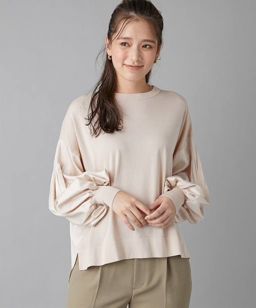 柔らかなパフスリーブは袖口の長いリブの位置を調整することで、よりボリュームを持たせた甘めなスタイルにしたり、リブを強調したシャープスタイルにしたりと、着こなしの幅が広いアイテムです。
