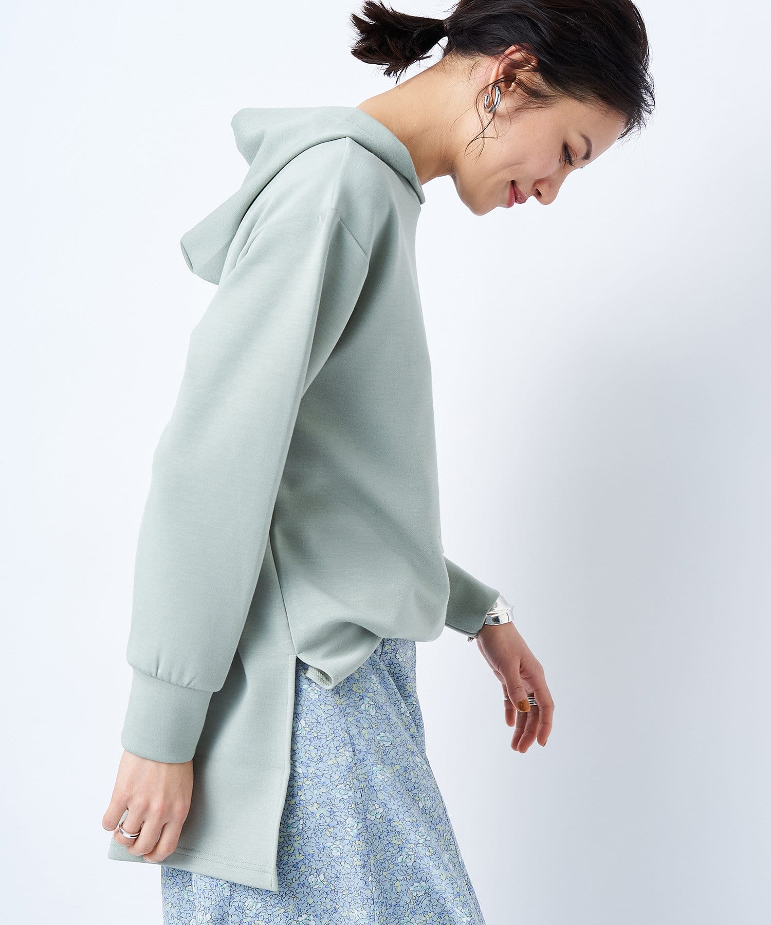 柔らかいダンボール素材を使用したキレイめで、幼くならない大人のフーディ。