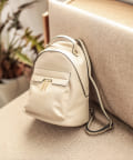 エンボス加工の合成皮革の重厚な素材感と、シンプルな女性らしいデザインで、リュックなのにカジュアルになりすぎないところが嬉しいポイント◎