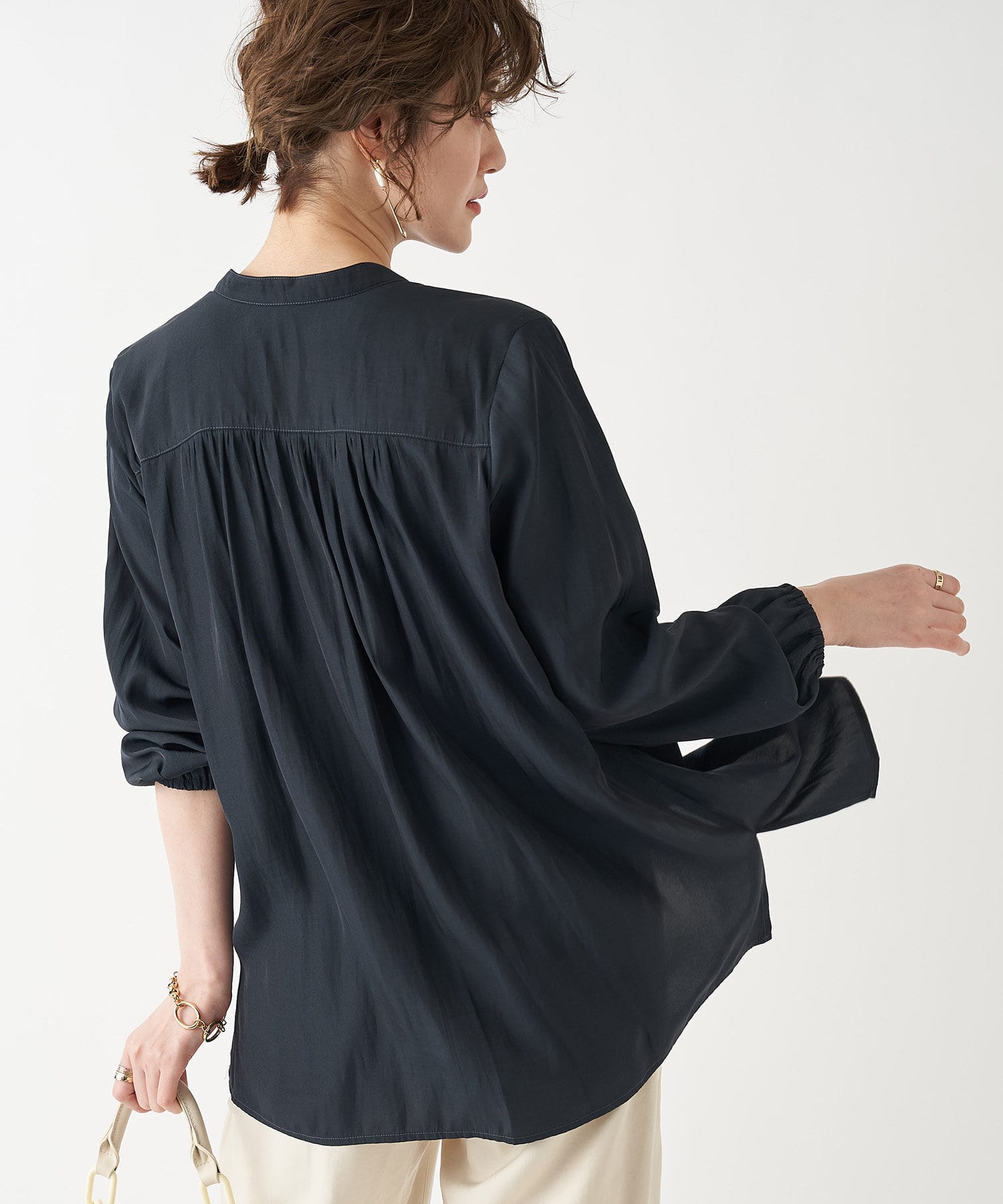 動画付き【《デイリーに使いやすい》洗える】パウダーサテンスタンドカラーブラウス