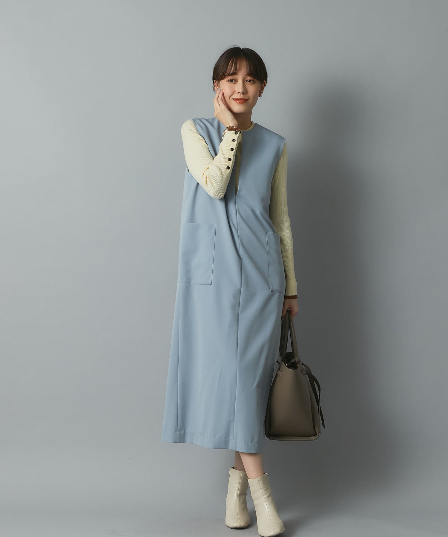 着やせが叶うワンピースで、トップスを変えれば季節問わず長く着ていただけます。