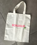 正面にはフランス語で( BONJOUR ボンジュール)とプリントされ、アクセントにフリンジが付いたファティマモロッコならではの遊び心が光ります。
