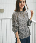 ほのかに透け感のある小花柄のプリントブラウスは、落ち着いたカラーを選びシックな印象に仕上げました。