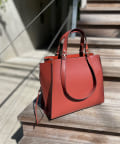 ・程よい光沢のある素材にかがりステッチを施したデザインは、高見えで大人上品に持てるバッグ。