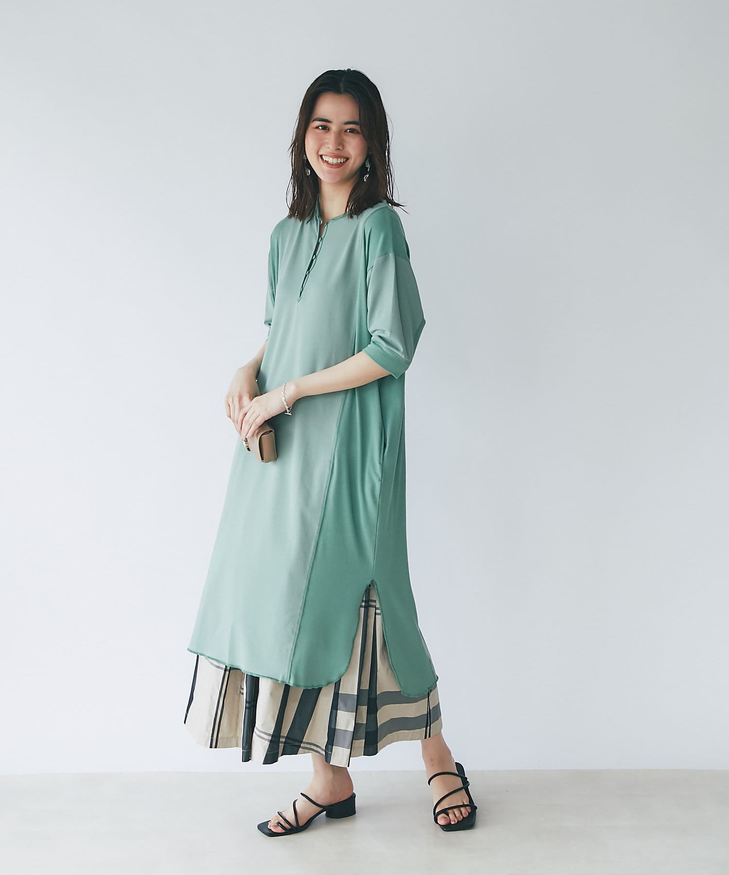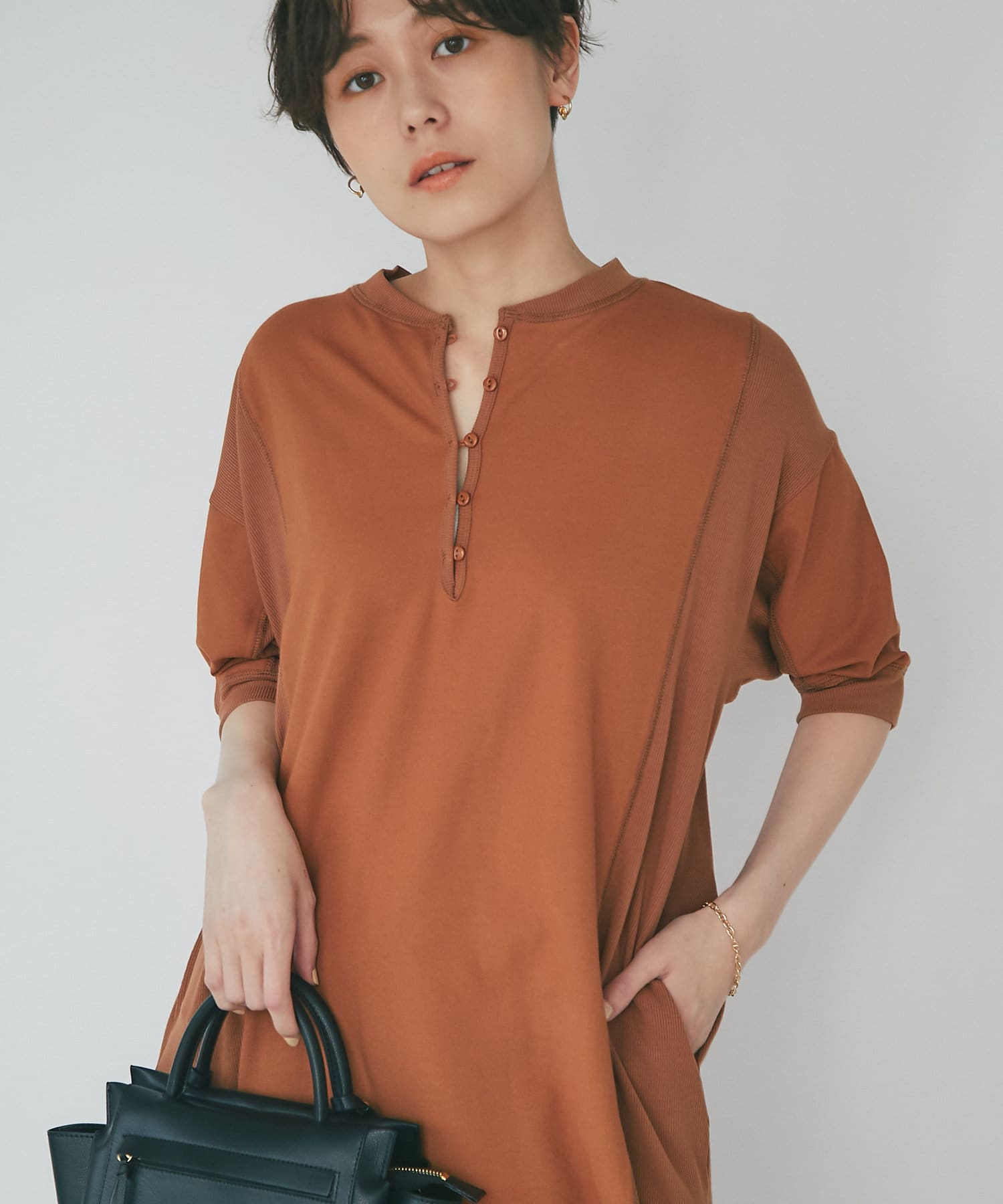 【ストレスフリーな着心地】5分袖切替ヘンリーネックワンピース