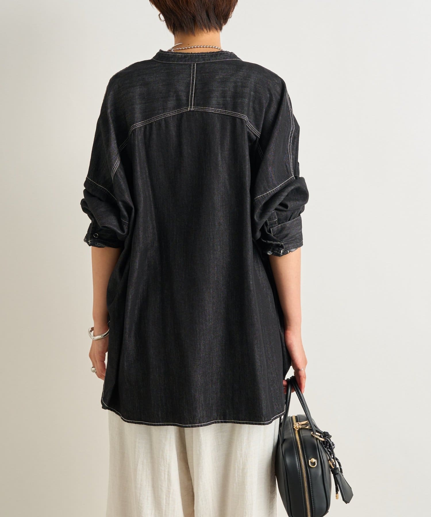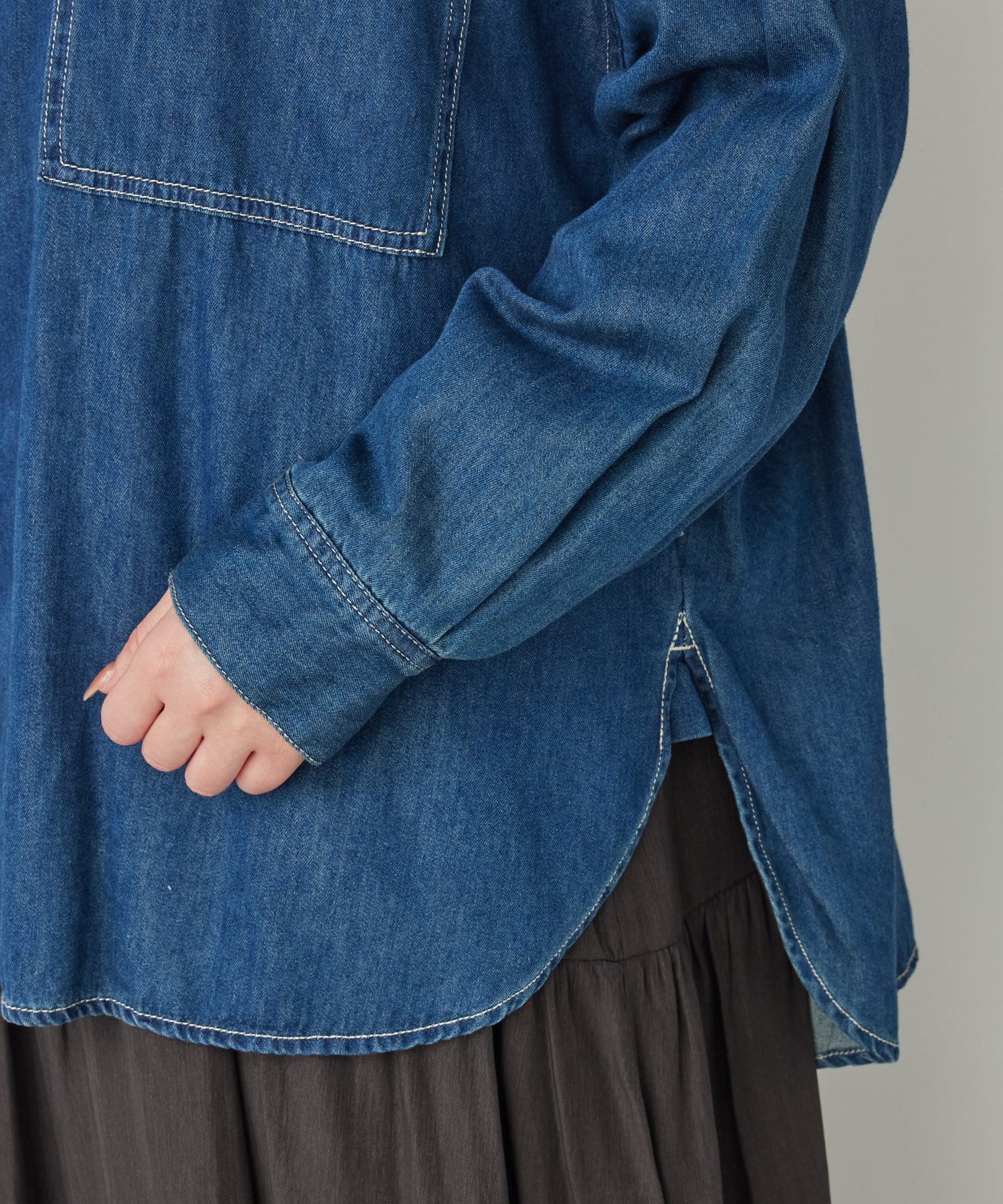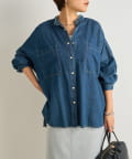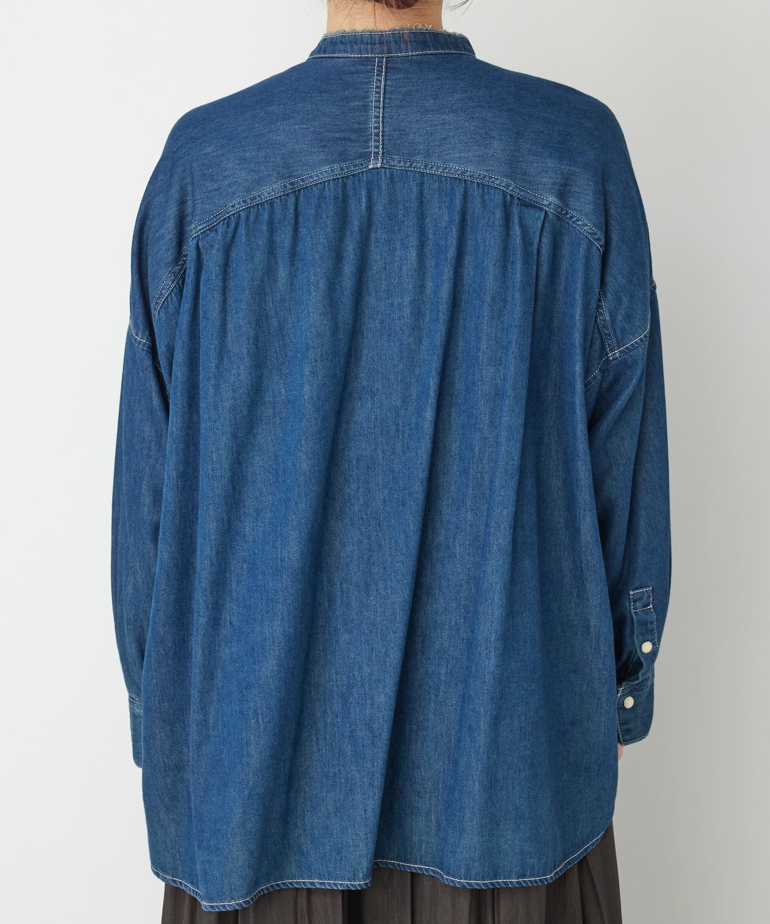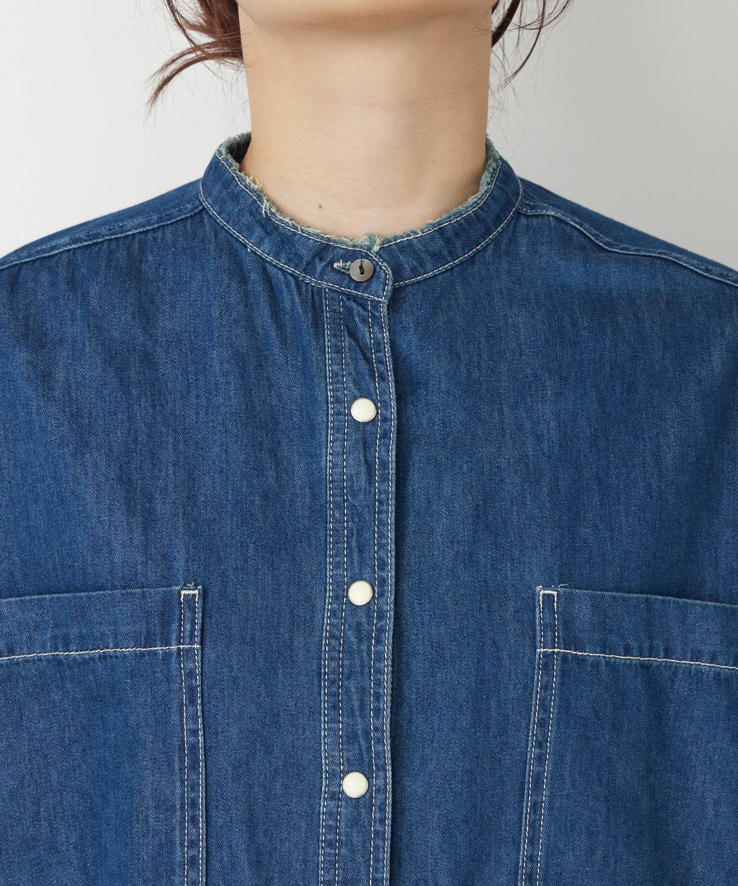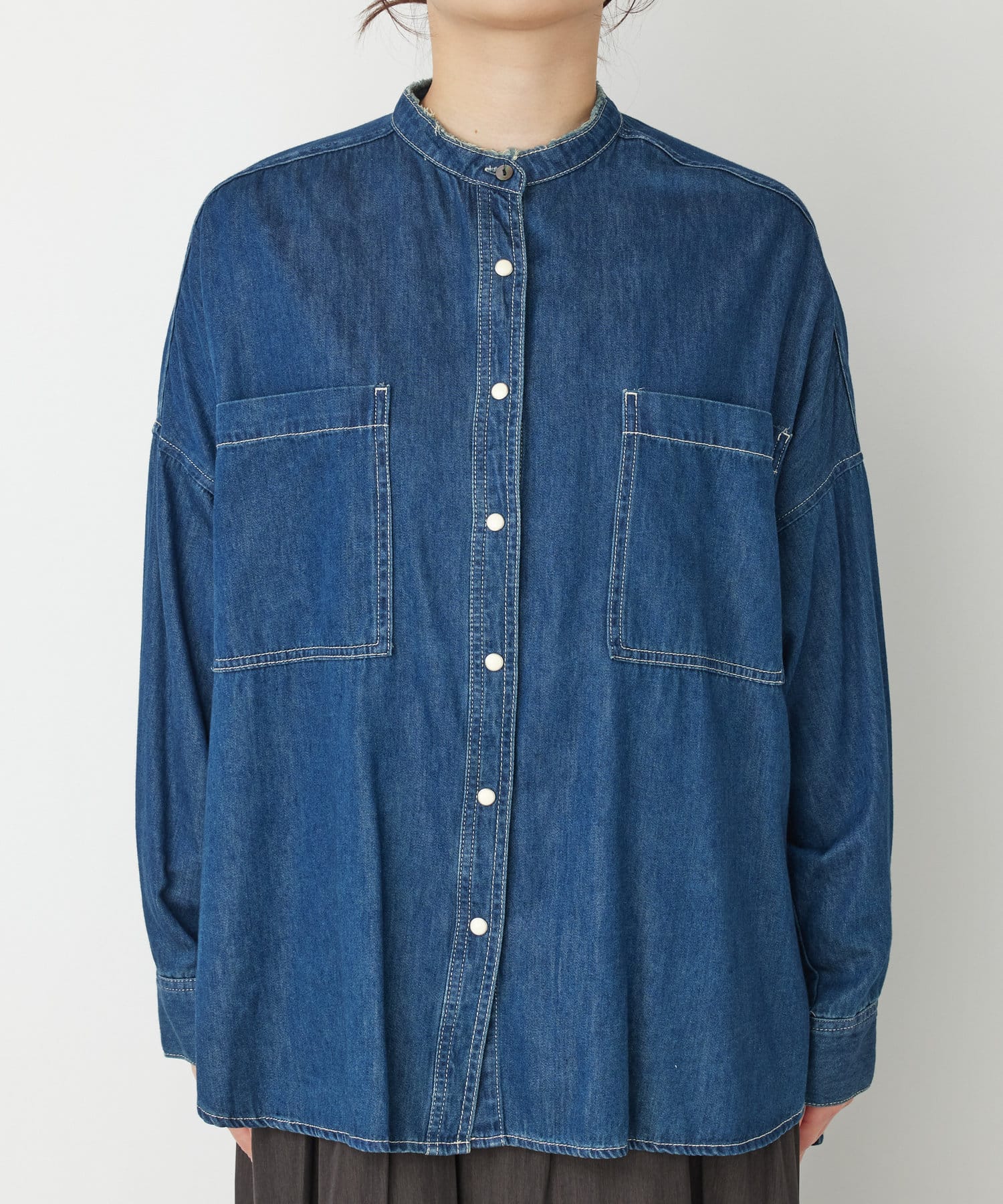 バンドカラーで襟がフリンジのデザインなので女性が着やすいデニムシャツのデザインです。