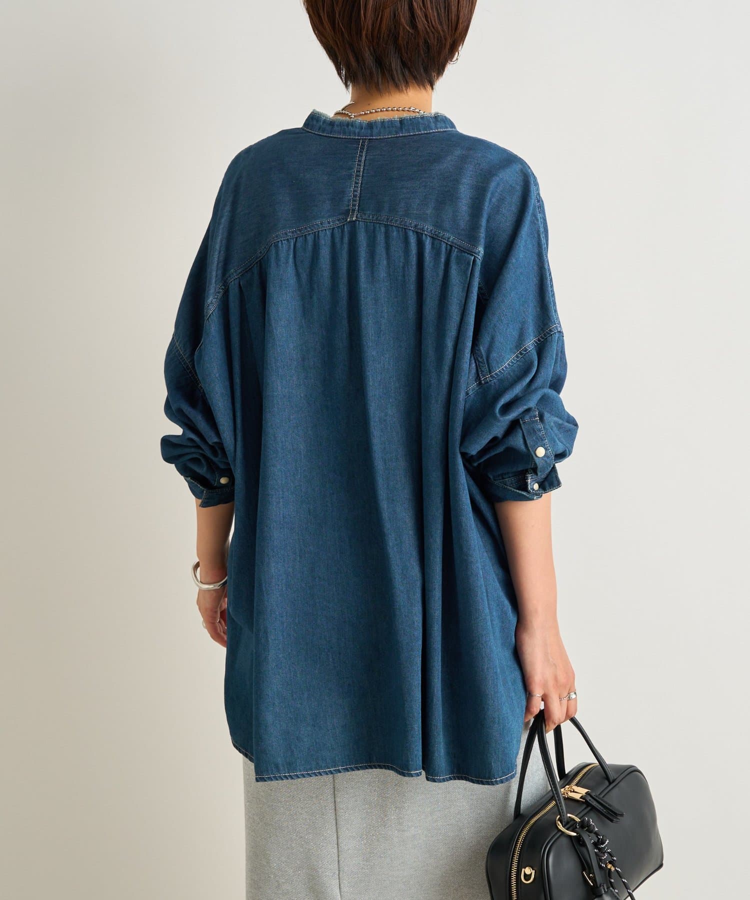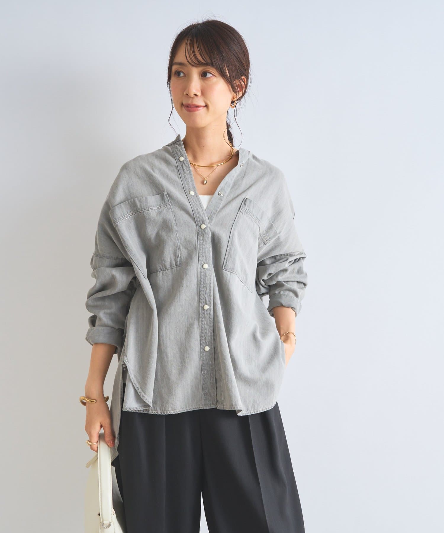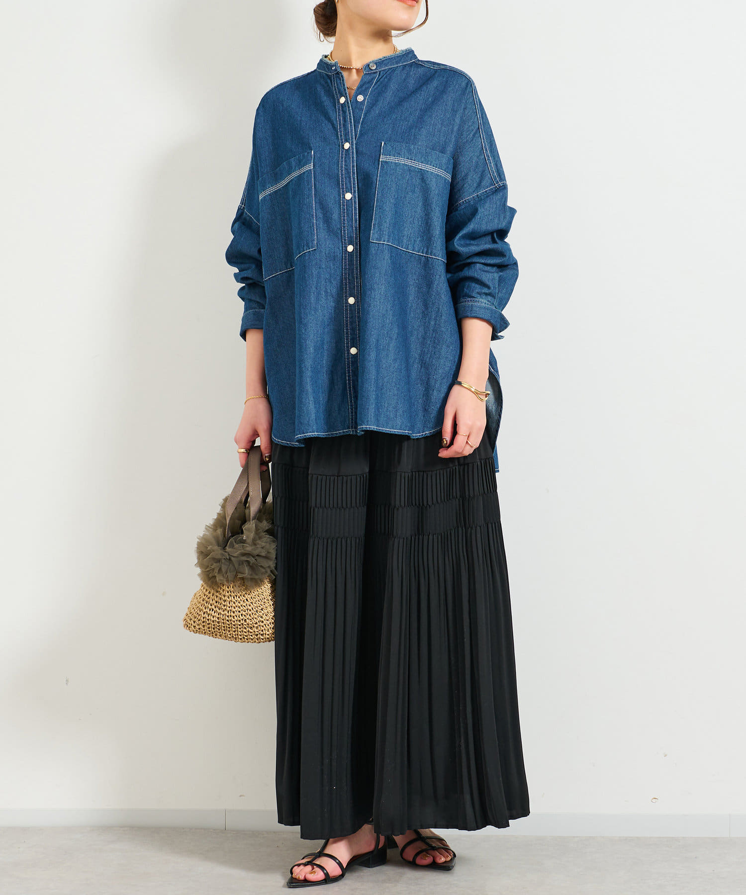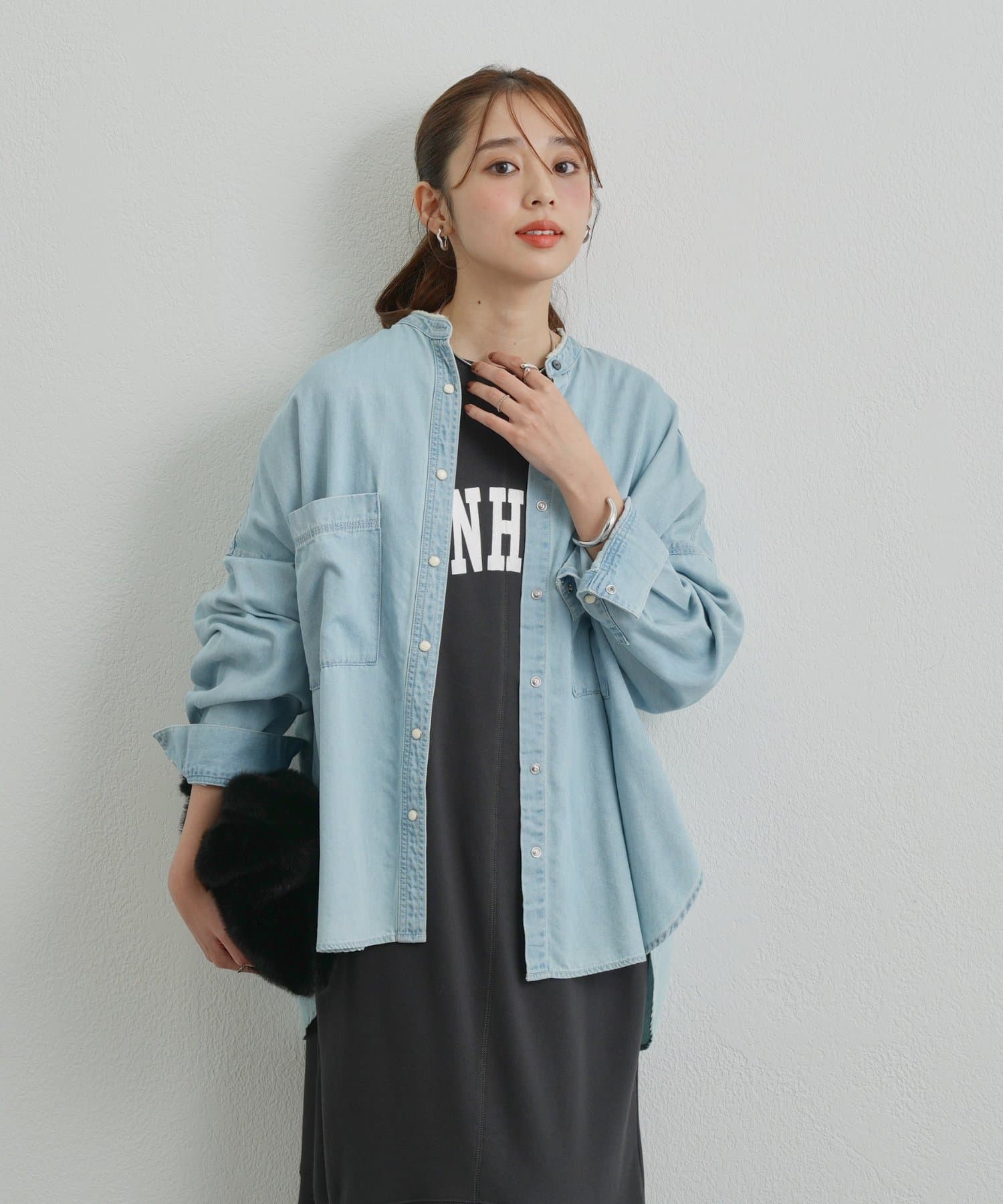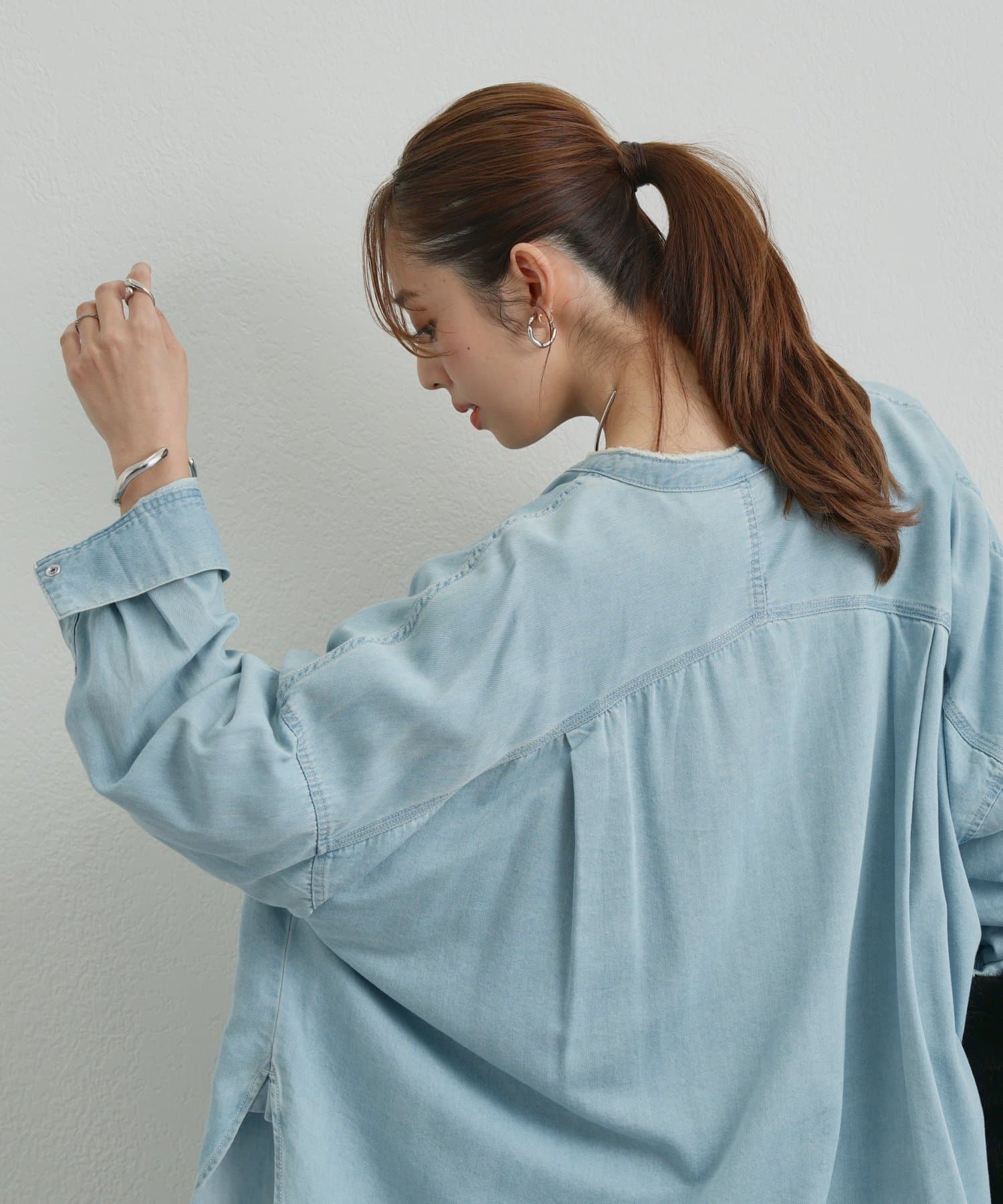 バンドカラーで襟がフリンジのデザインなので女性が着やすいデニムシャツのデザインです。