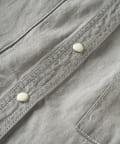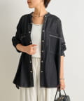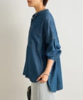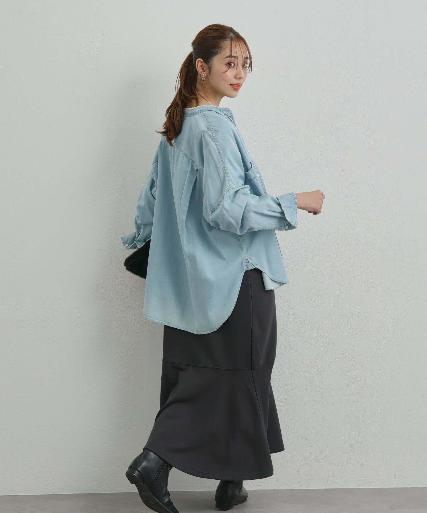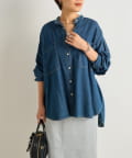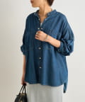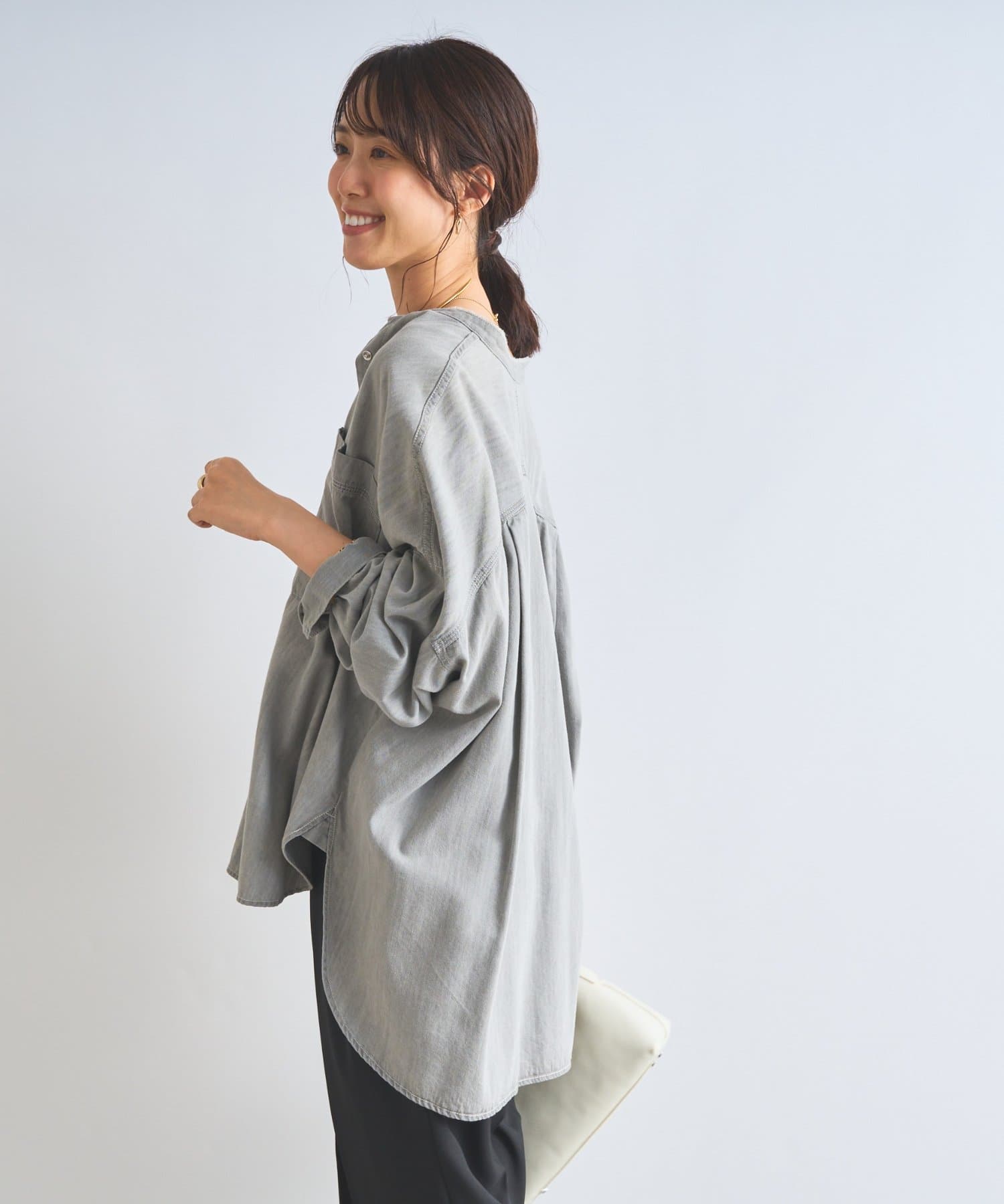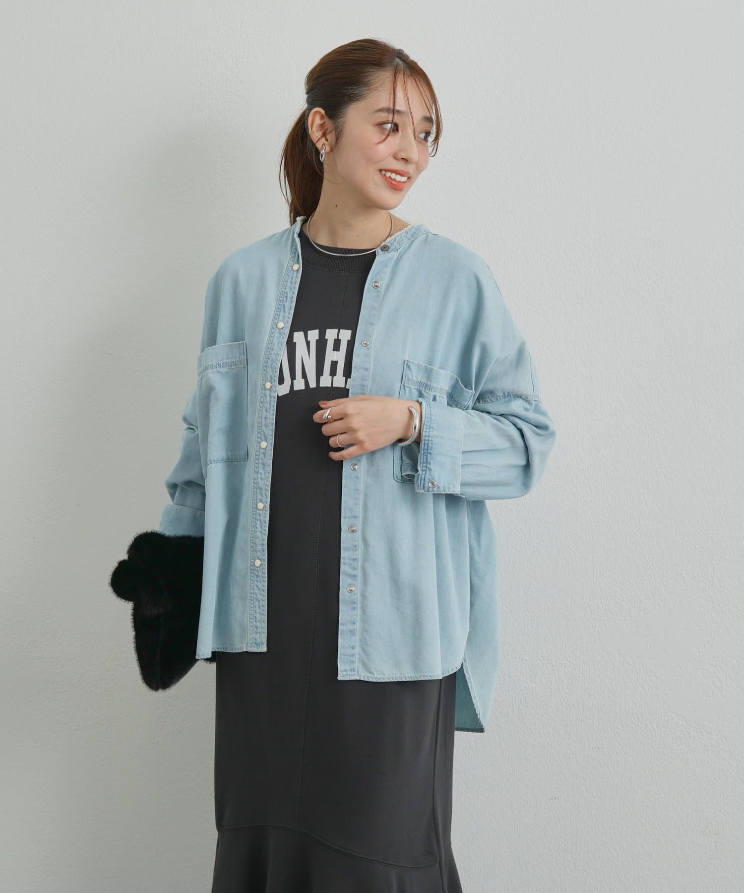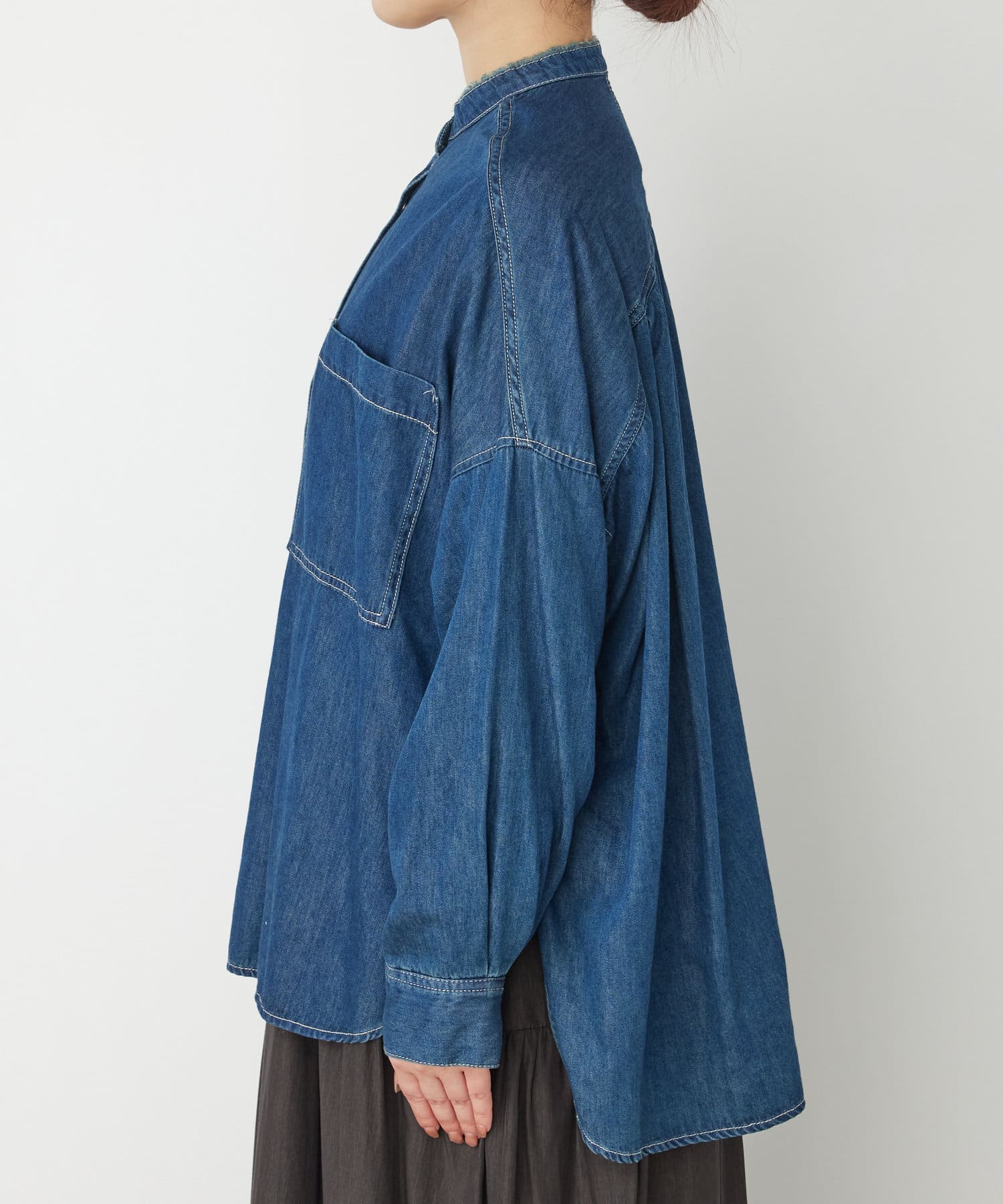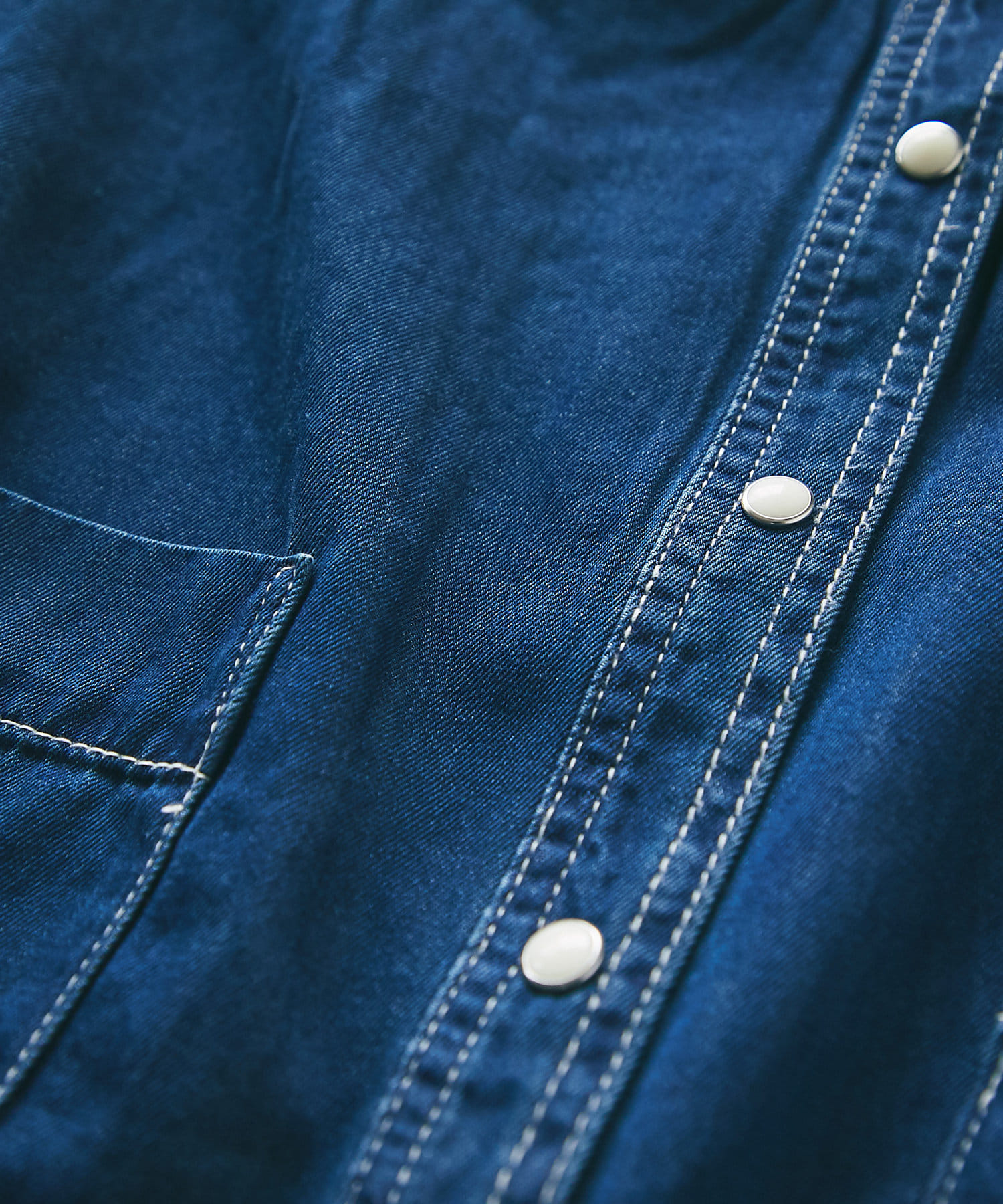 バンドカラーで襟がフリンジのデザインなので女性が着やすいデニムシャツのデザインです。