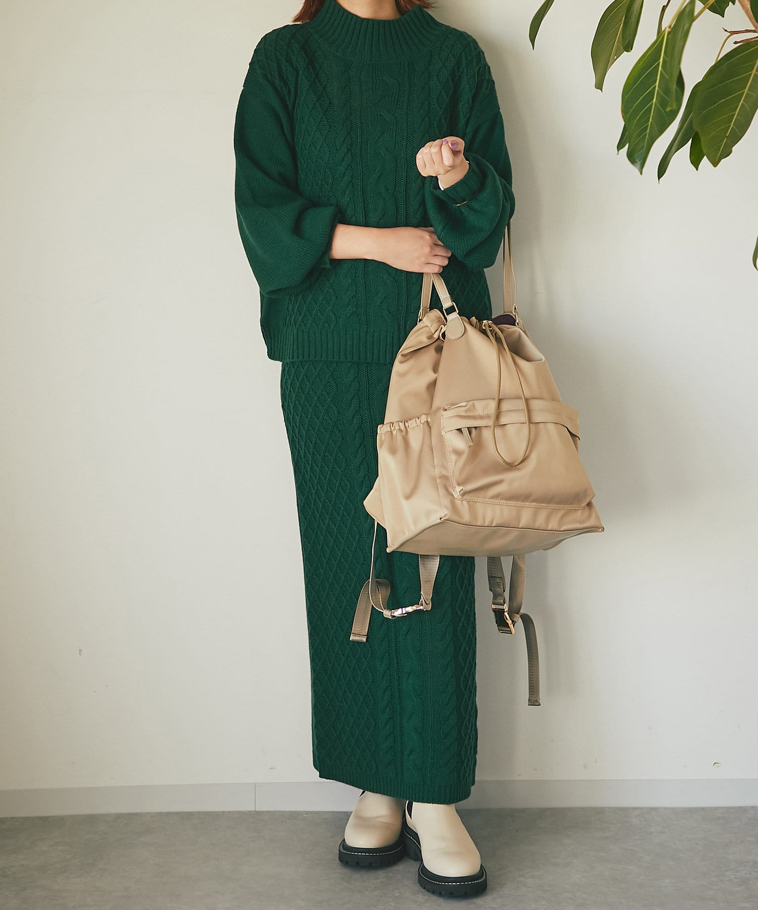 ・上下ともフロントはアラン柄の編地が入っていて、バックは無地仕様なのでカジュアルな印象になりすぎないがポイント◎