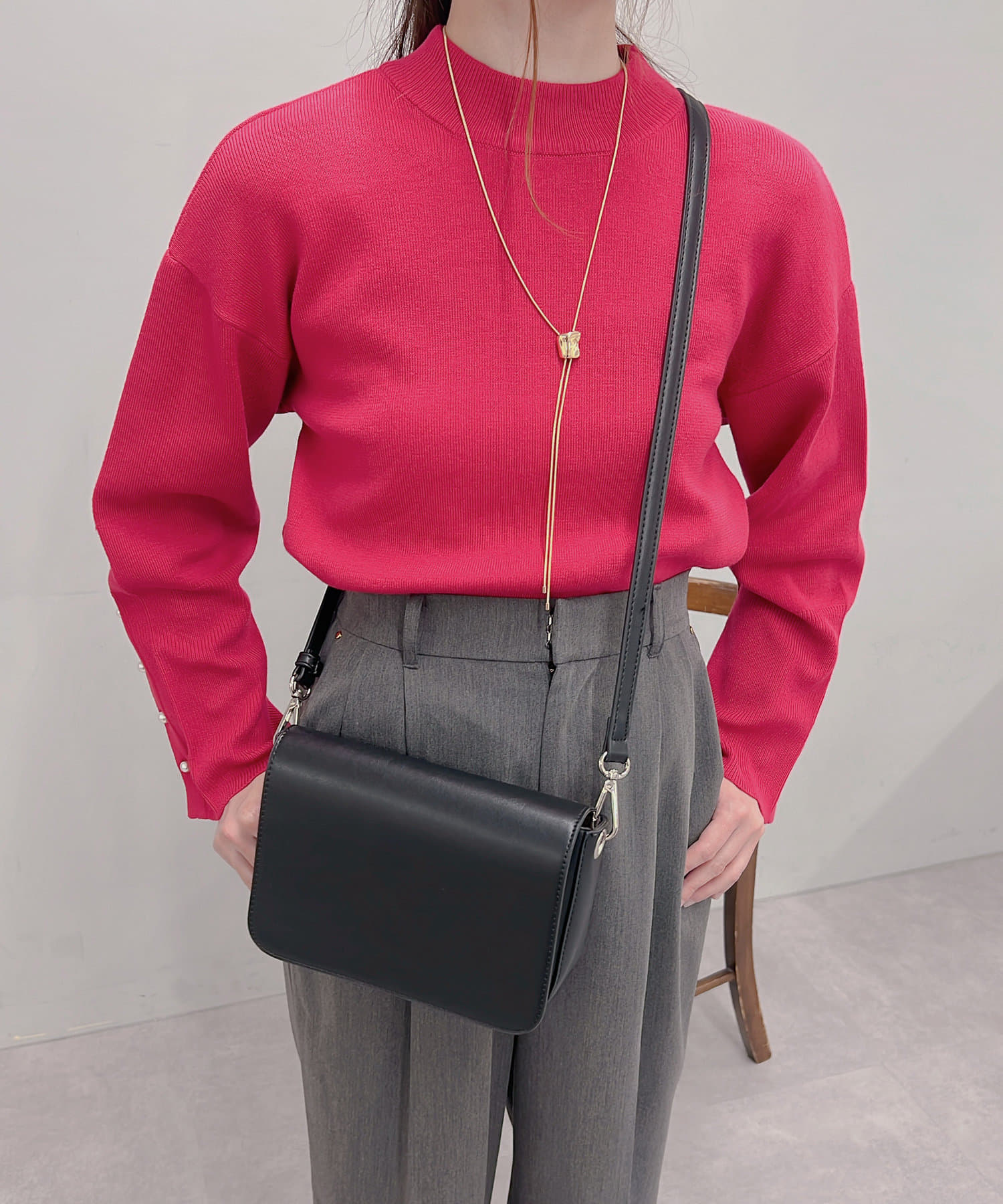 ・ベーシックな総針ニットに袖のパールデザインがアクセントになる