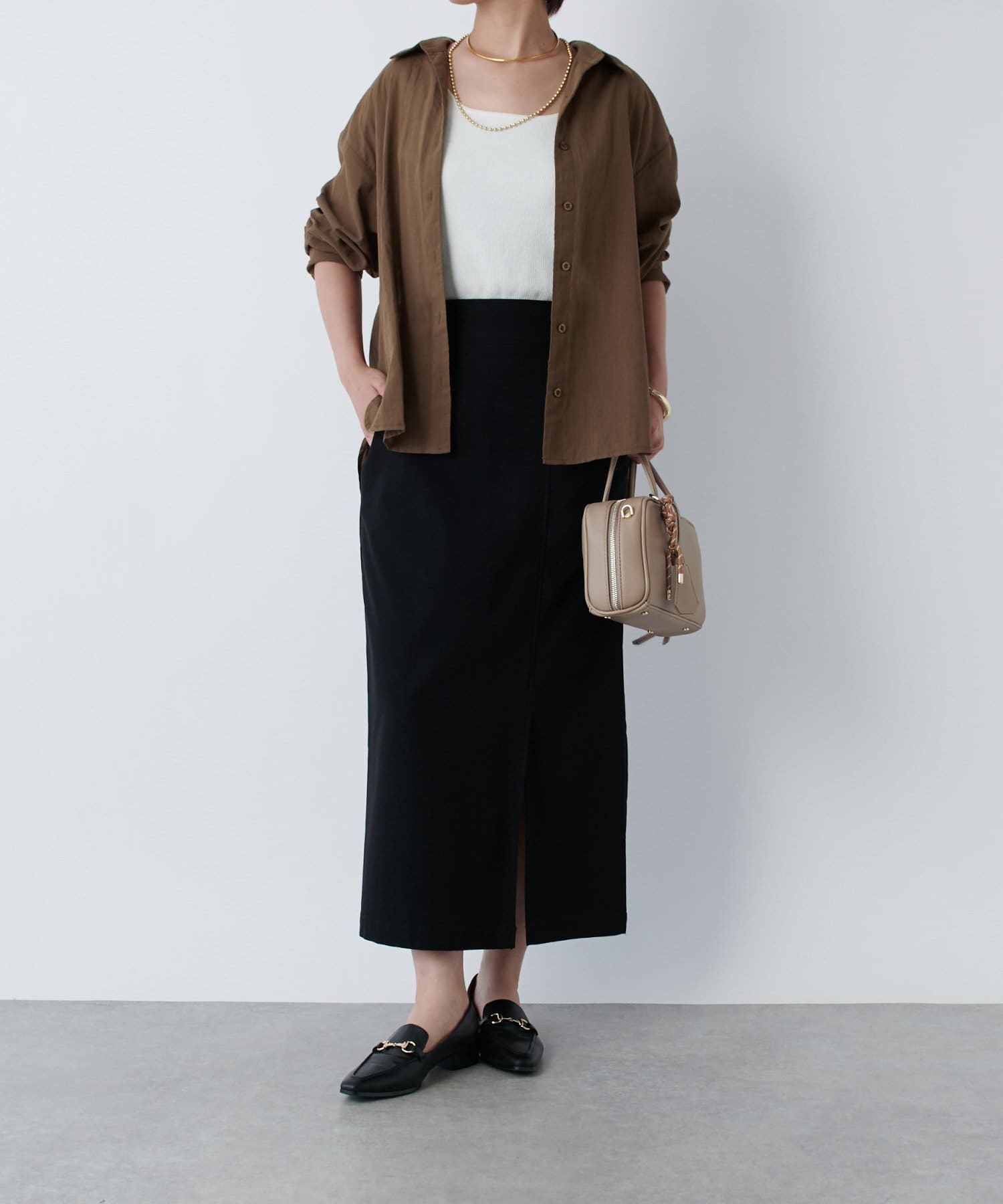 #きれいめカジュアル#大人カジュアル#大人シンプル#スカート#ロング丈#ウエストゴム#シンプル#ベーシック#上品#オフィスカジュアル#高見えコーデ#ロングスカート#タイトスカート#きれいめスカート#着回し#プチプラ#体系カバー