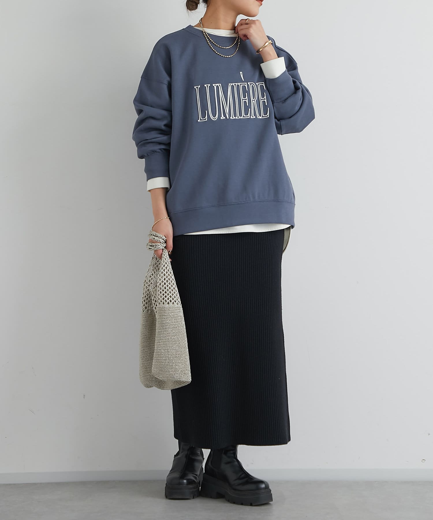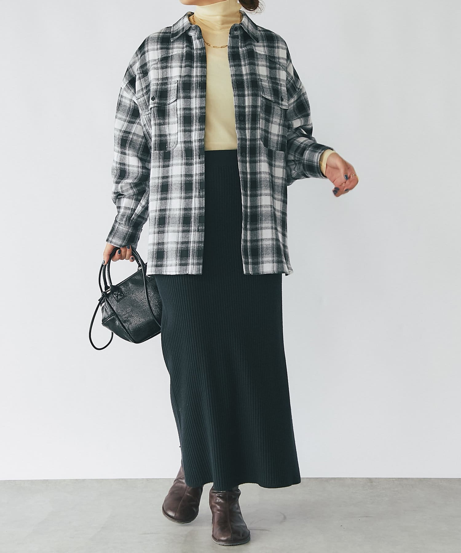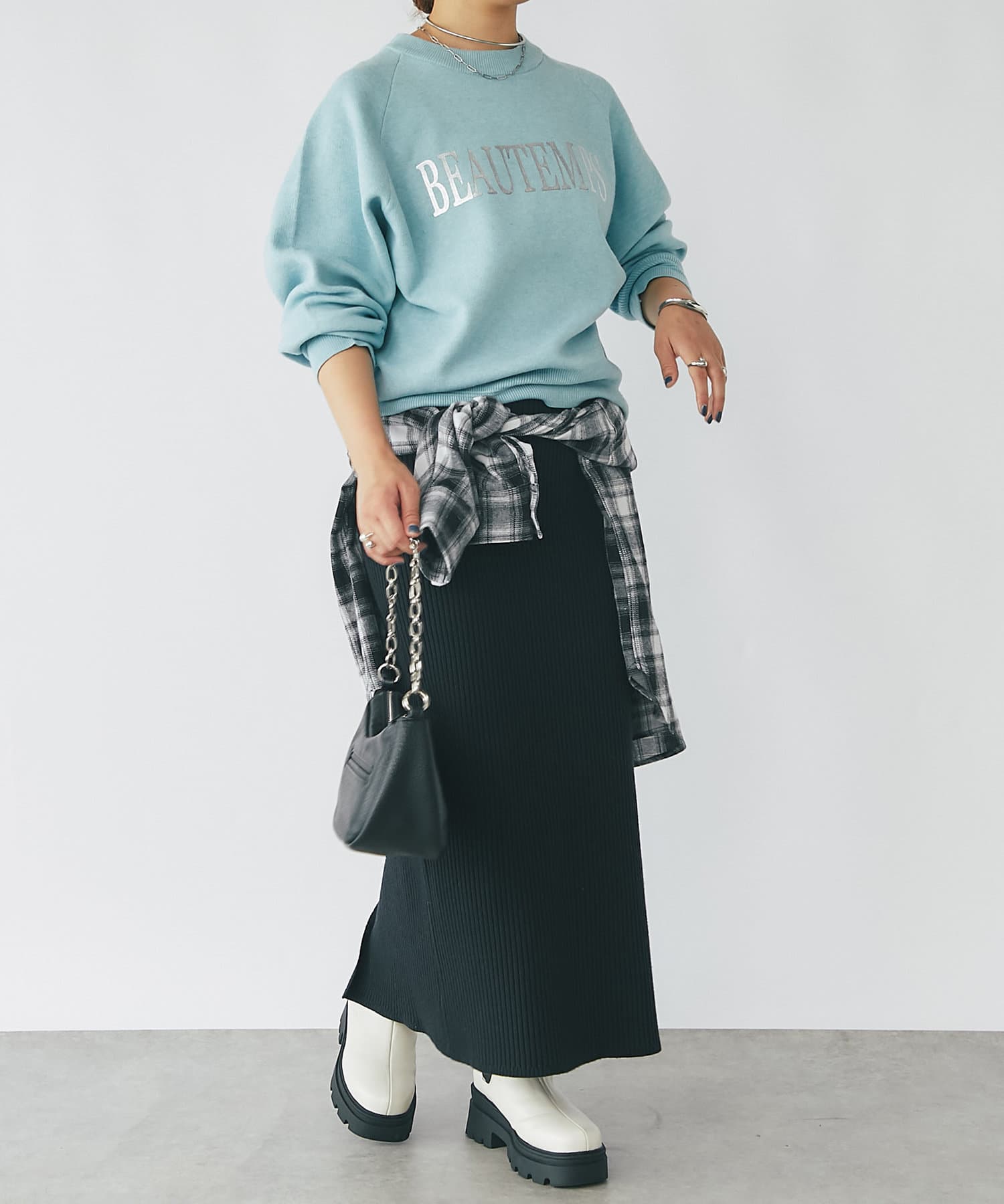 高身長な方は足首が出る着丈なので、ブーツやハイカットのスニーカー合わせがおすすめです。