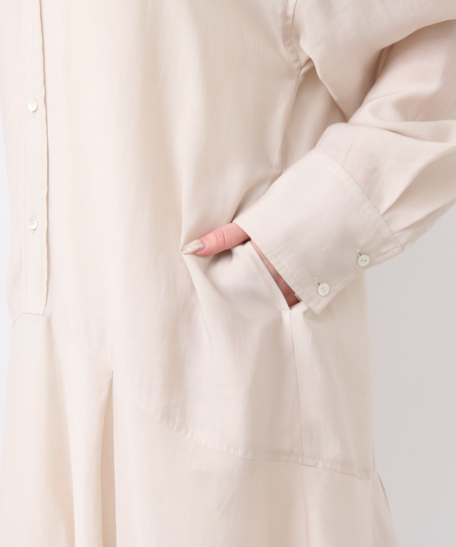 ・太めのカフスに抜け感をプラスする襟元の開きがデザインポイント