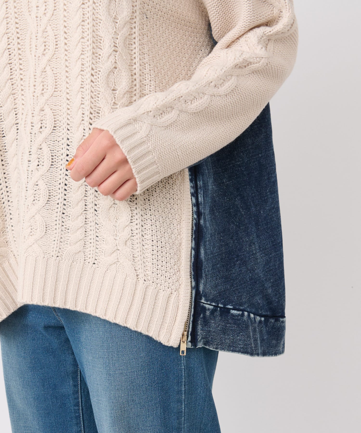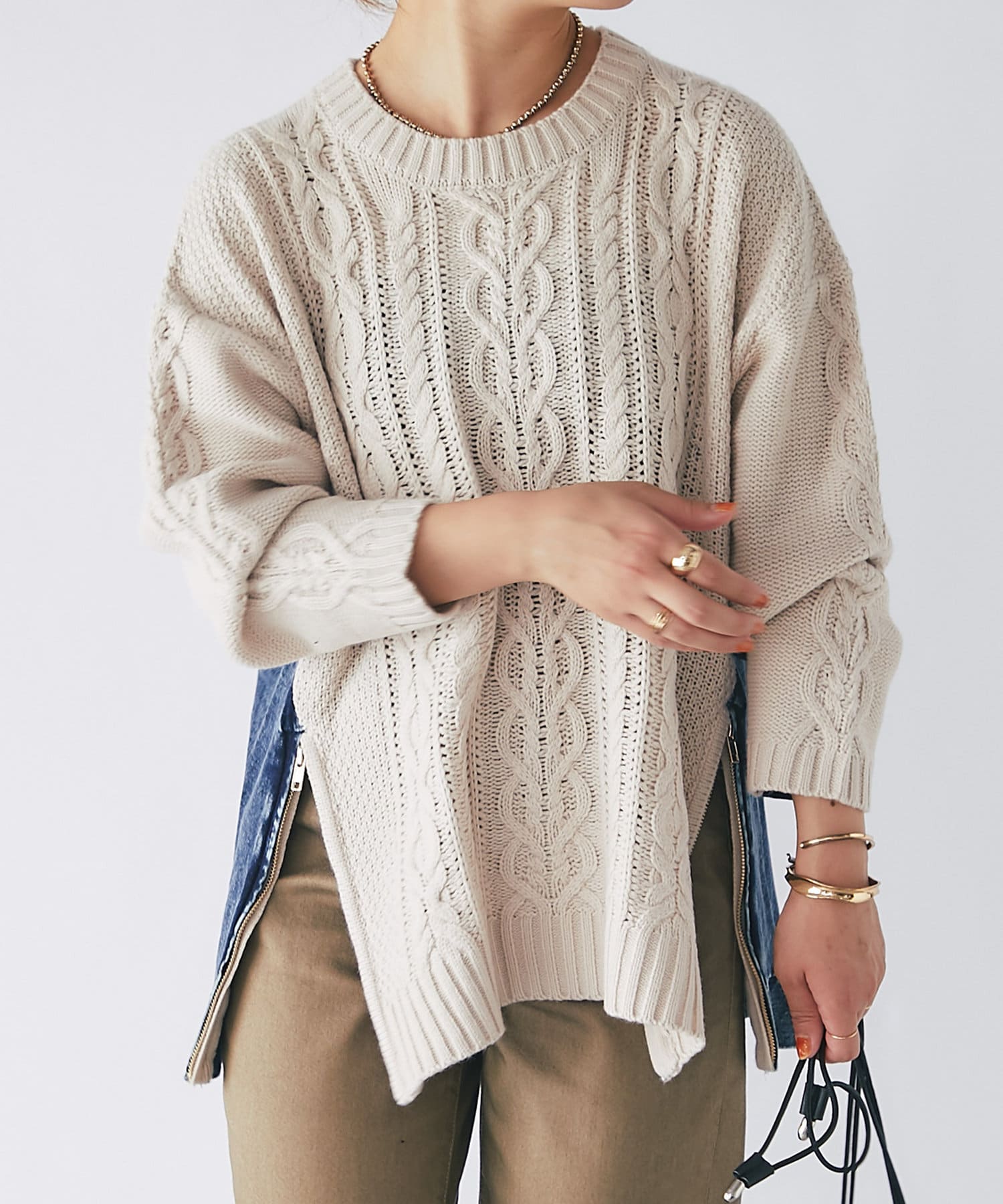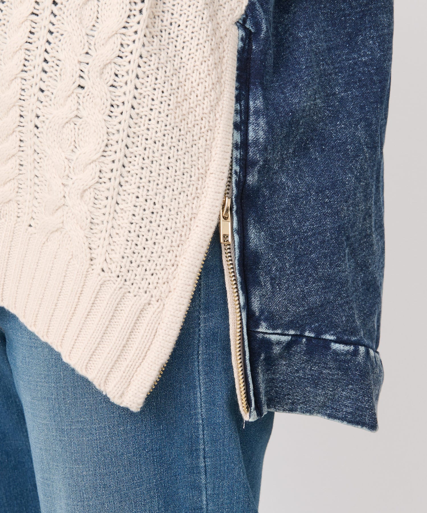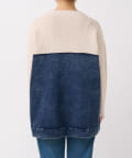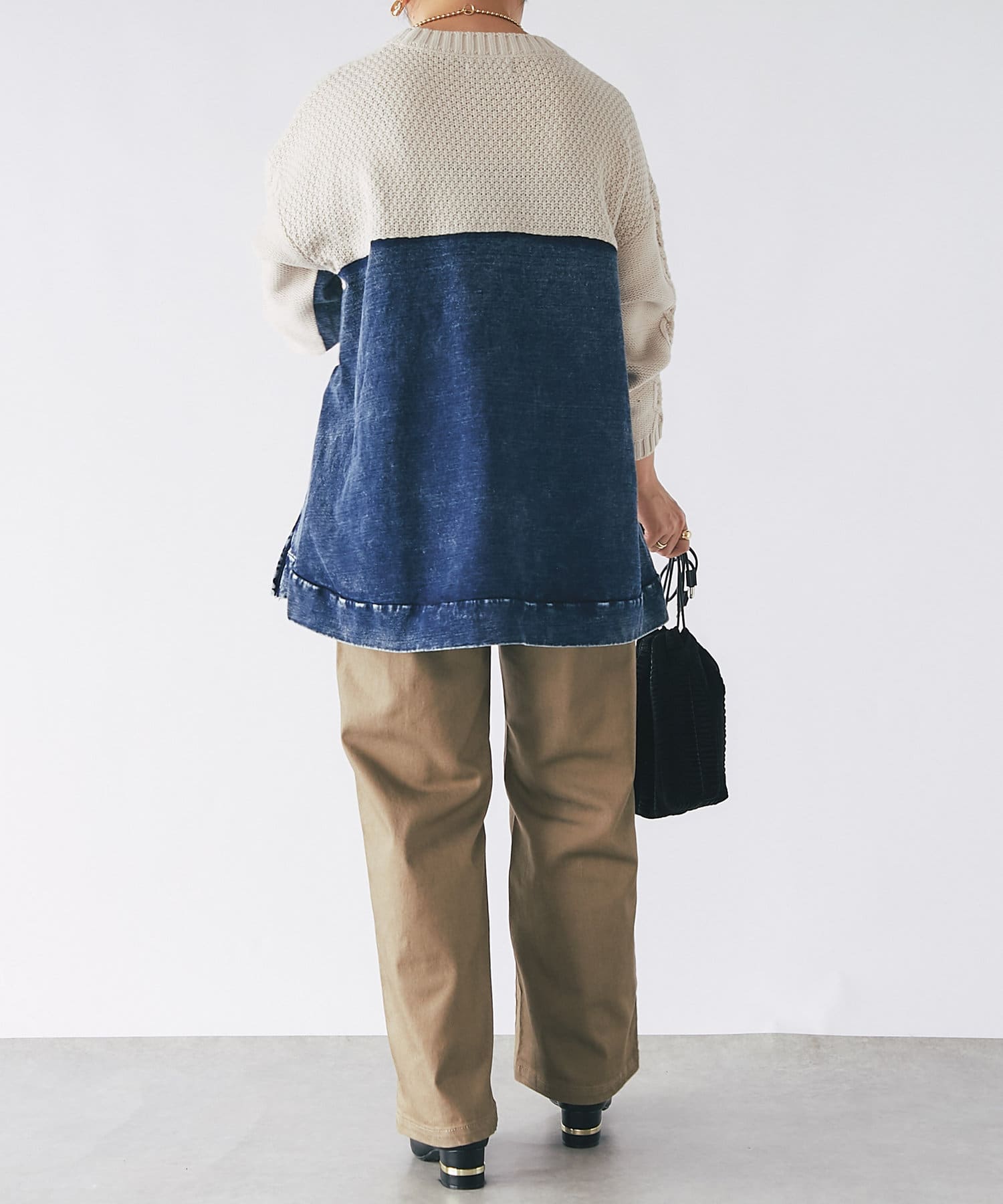 ざっくりニットとデニムシャツのドッキングがトレンドライク