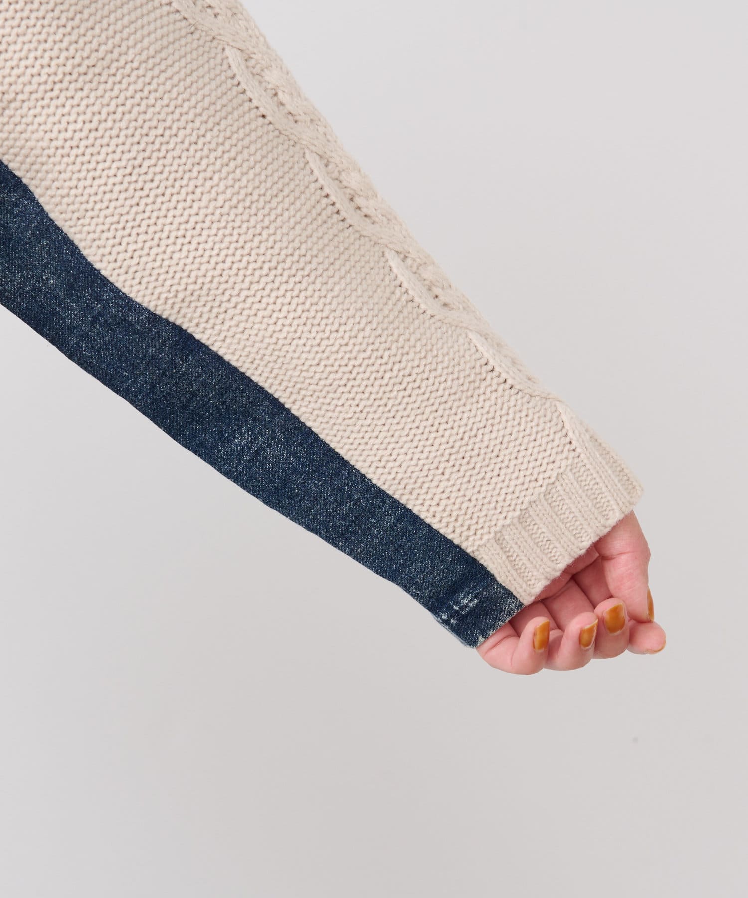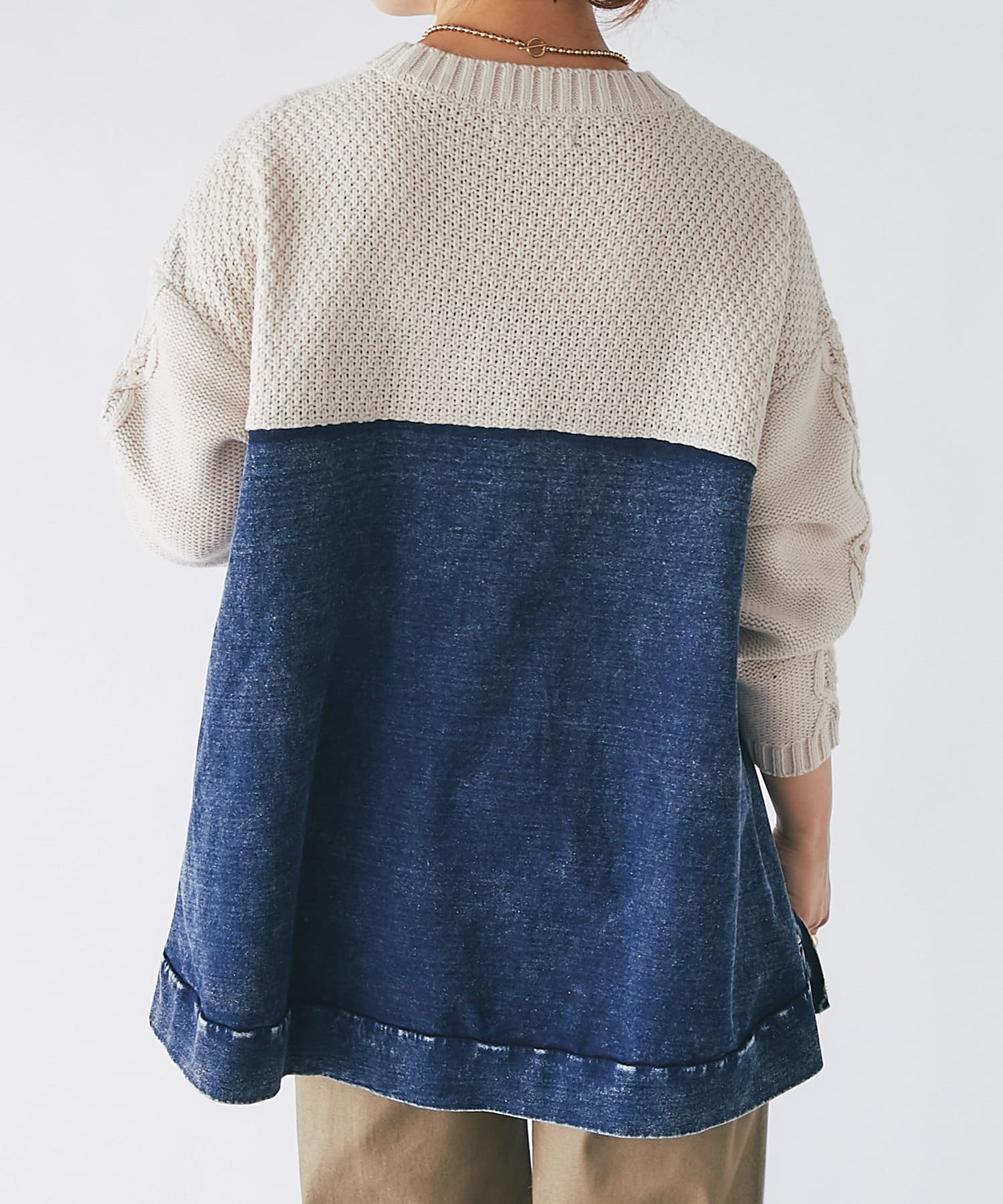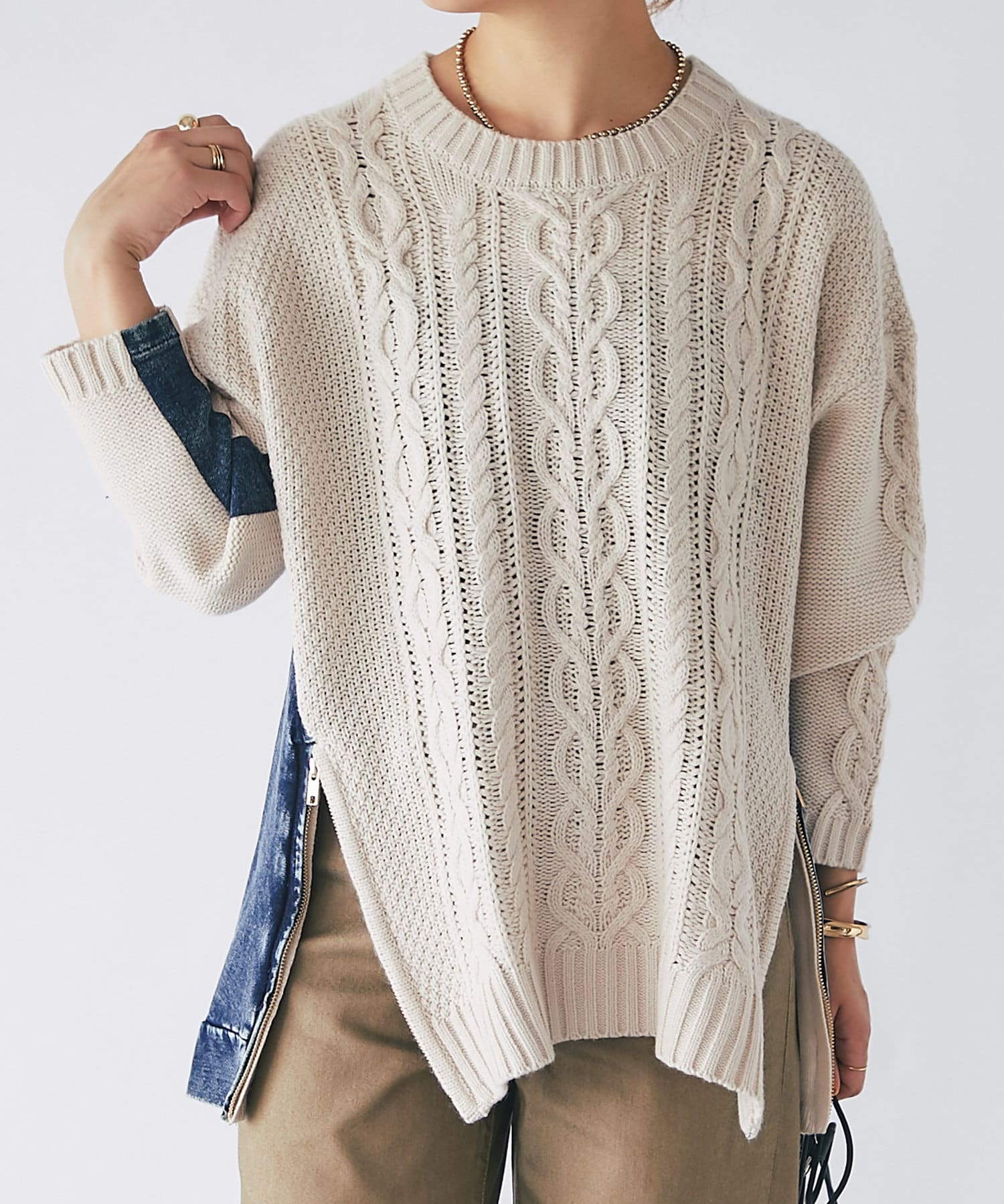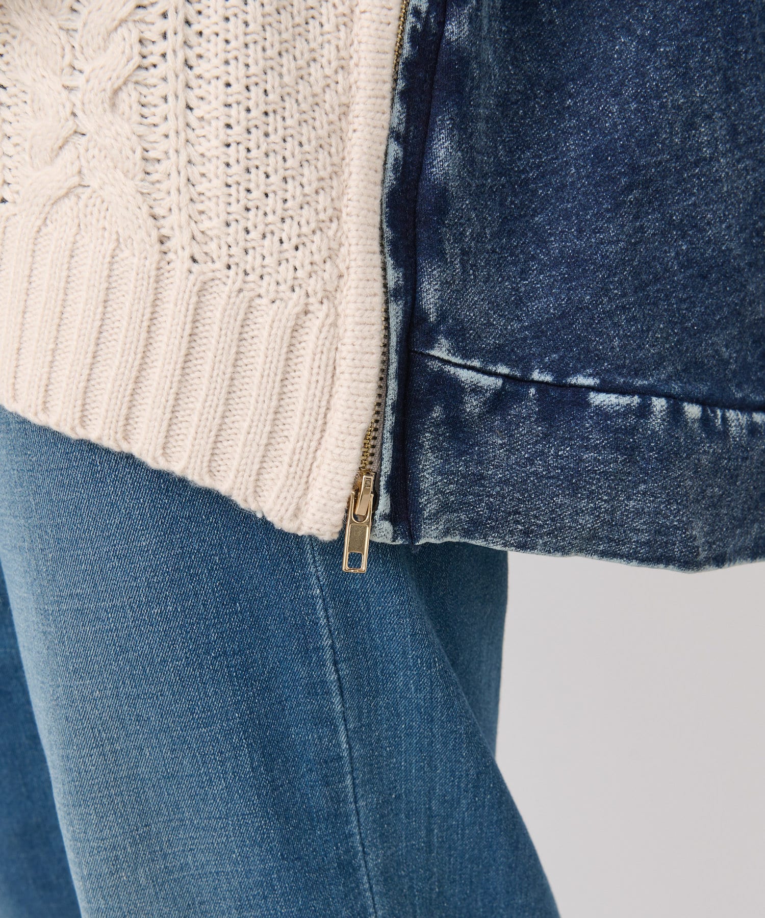 ざっくりニットとデニムシャツのドッキングがトレンドライク