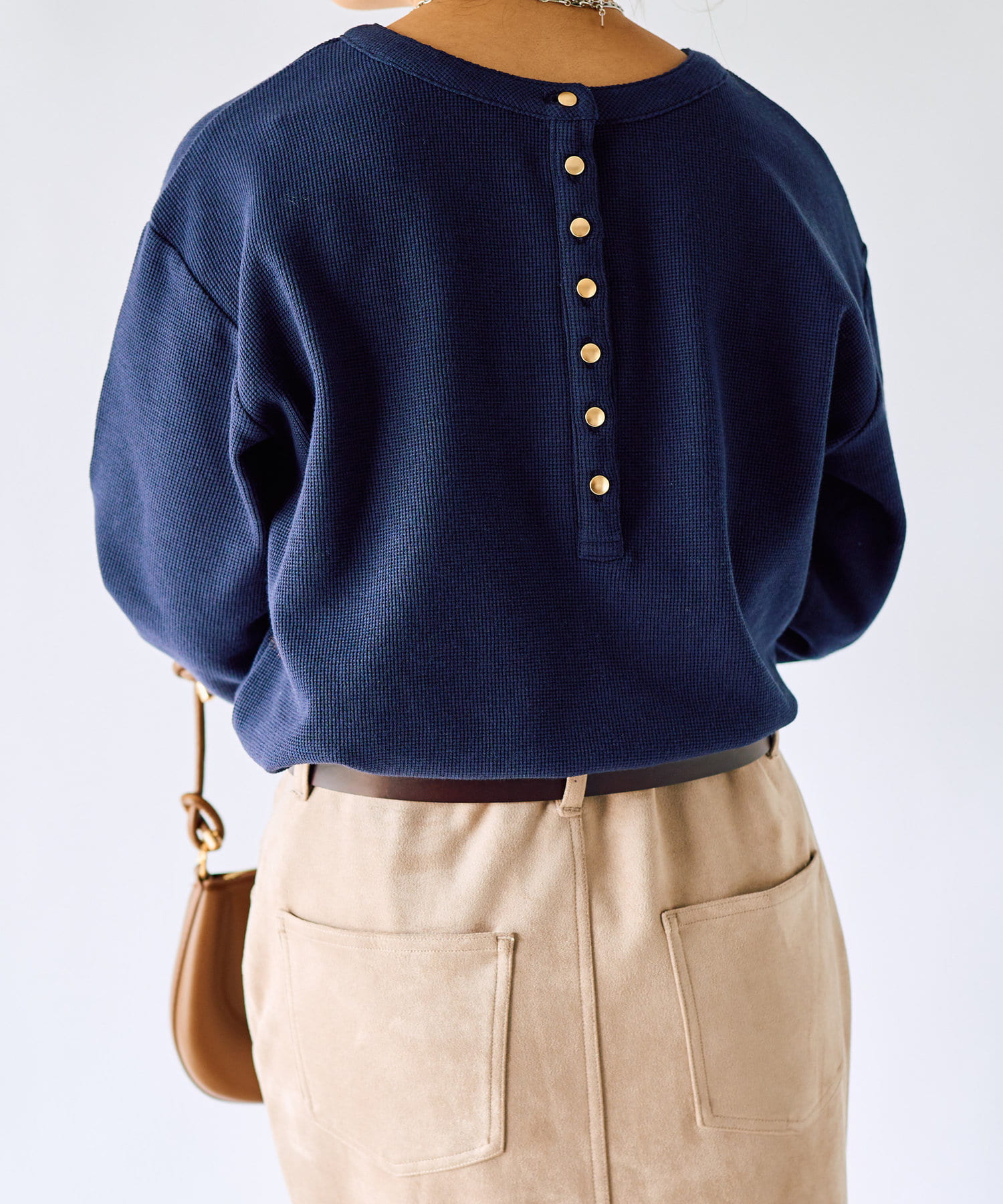 カジュアルなイメージになりすぎない華奢なボタンもポイント