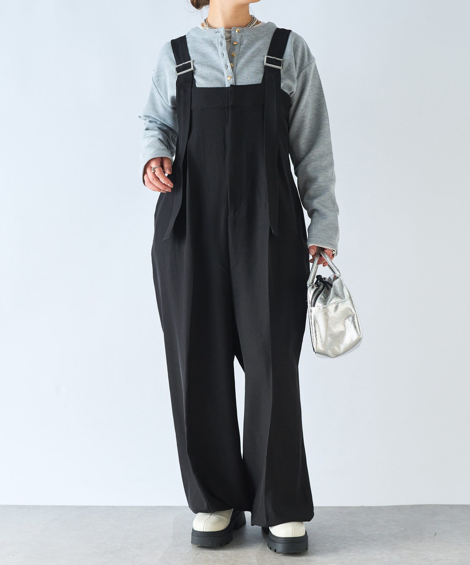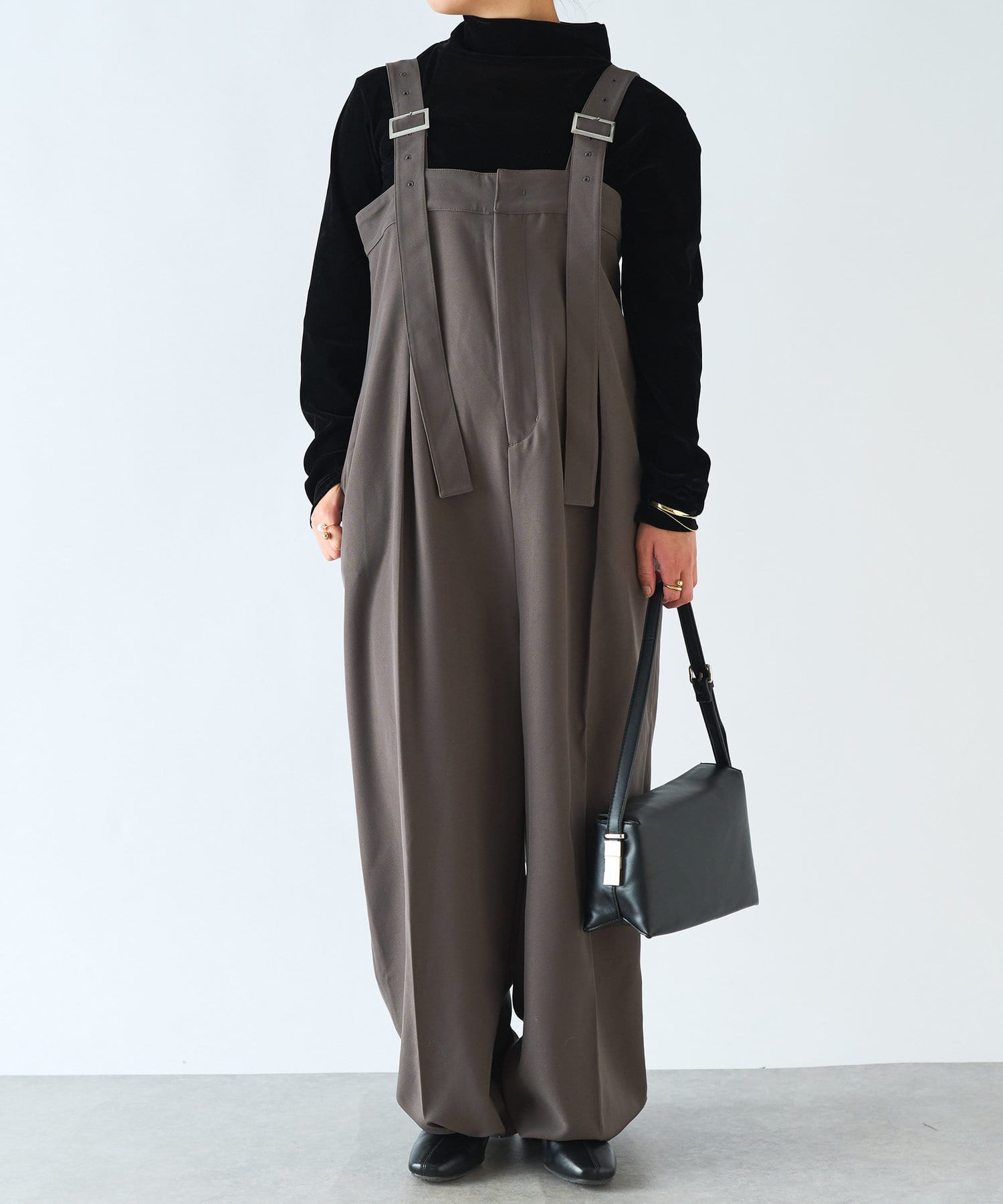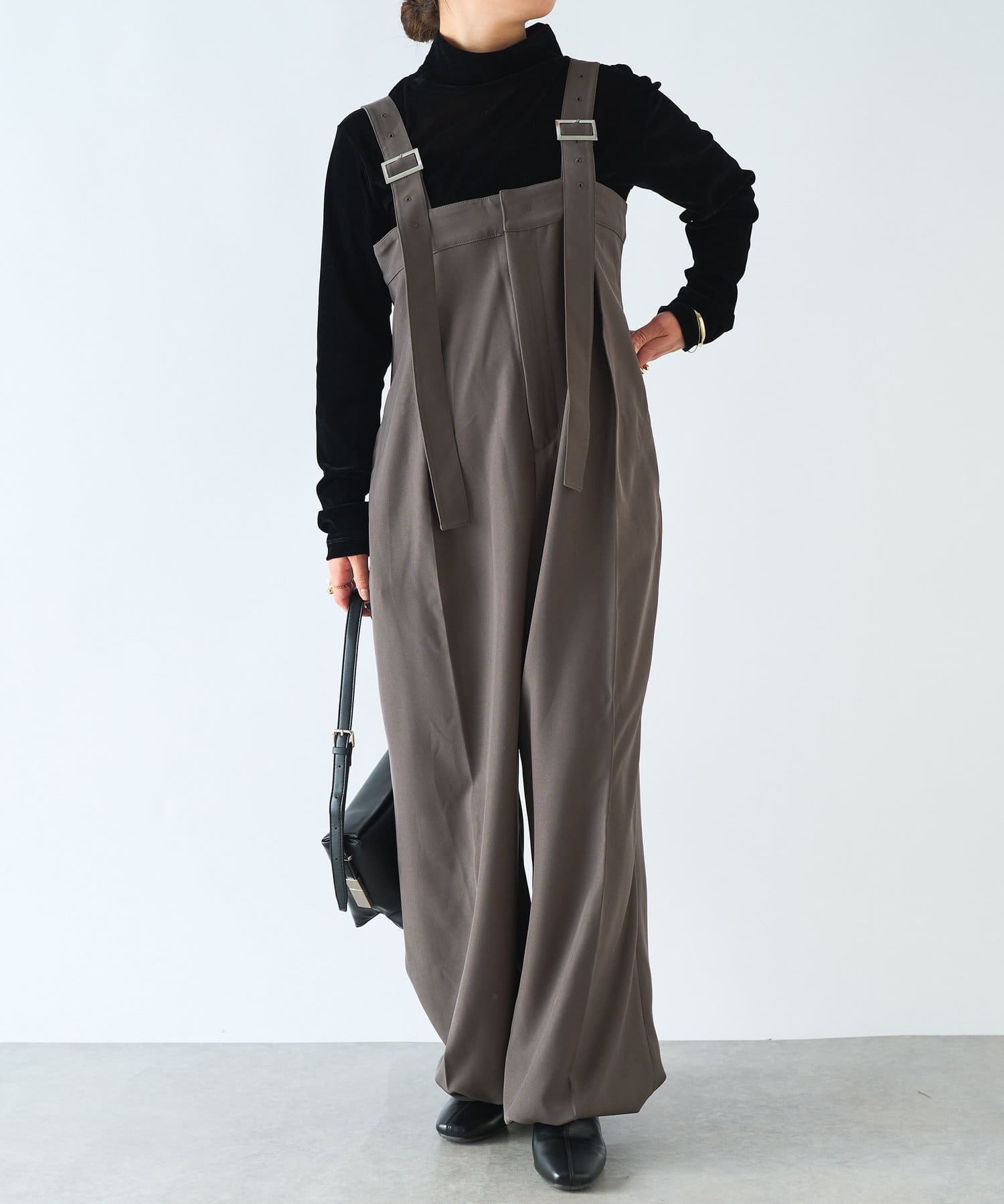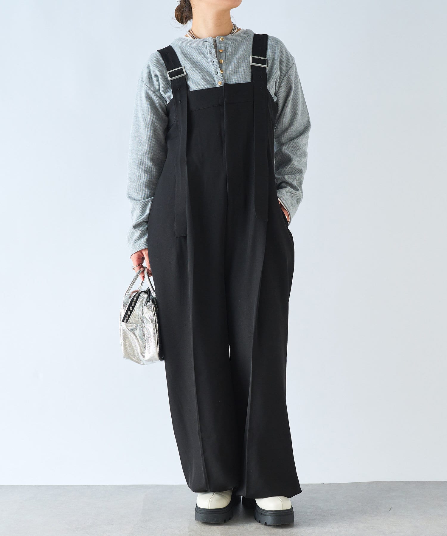 キレイな落ち感で子供っぽくならず大人な着回しができるサロペットです。