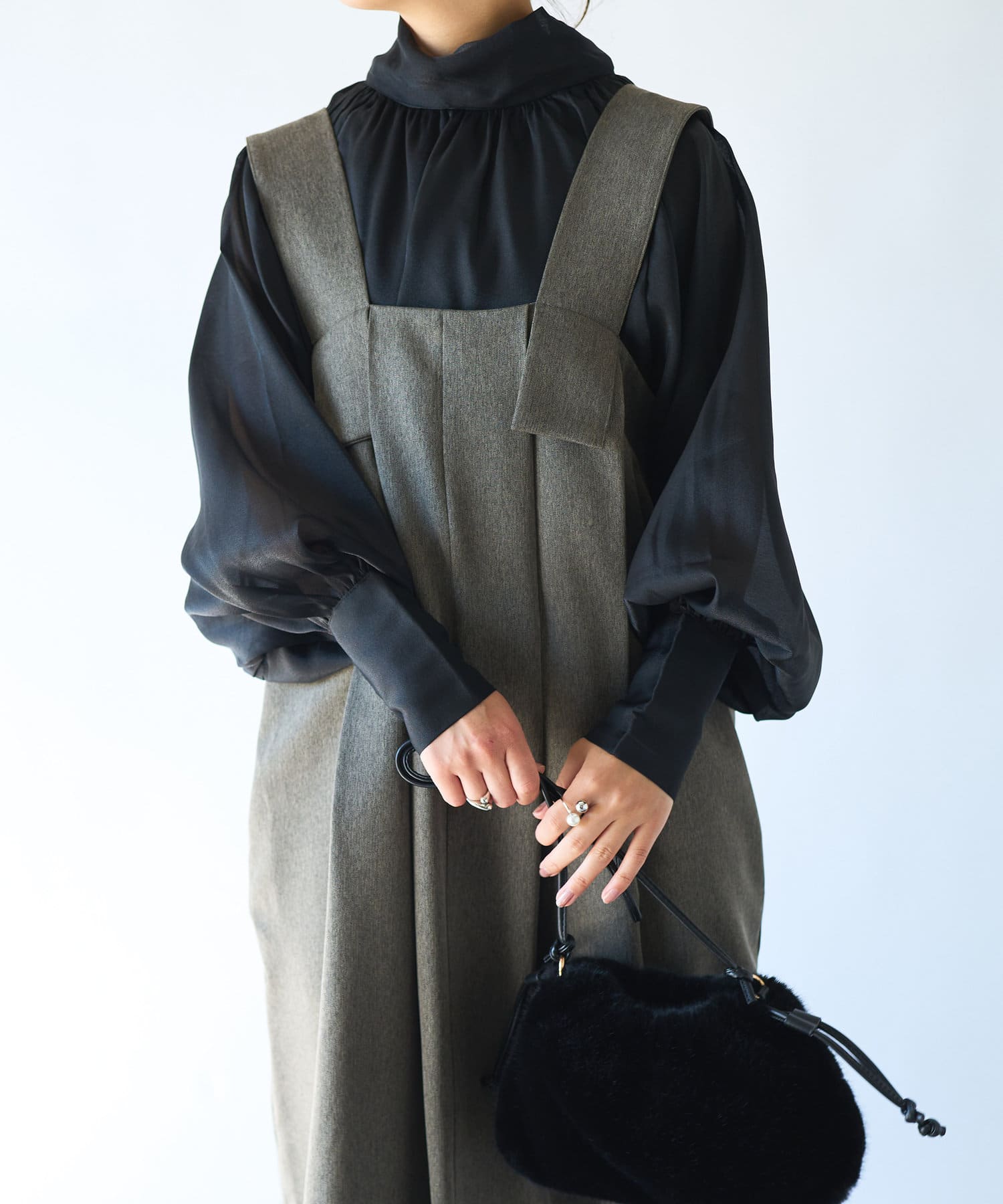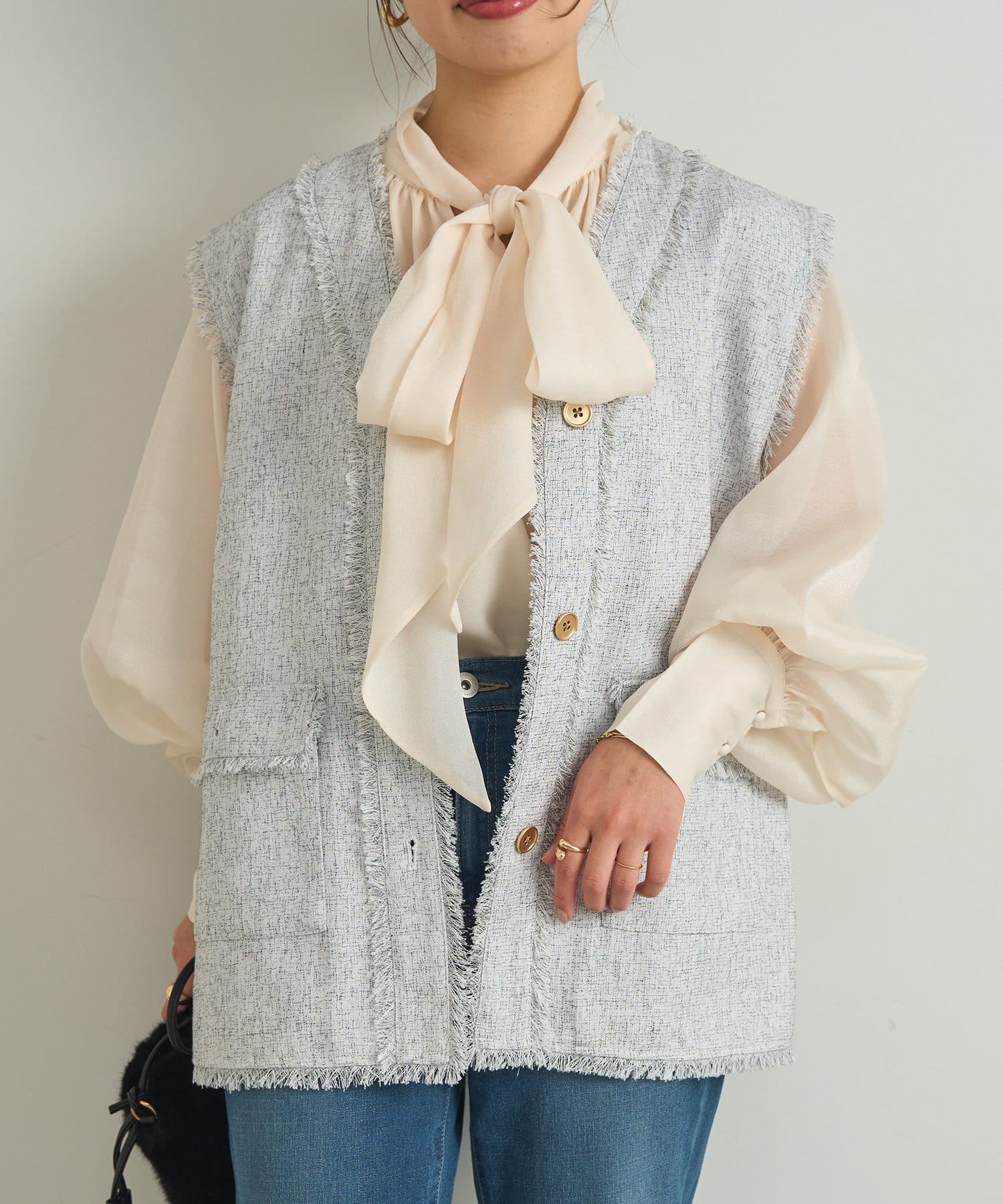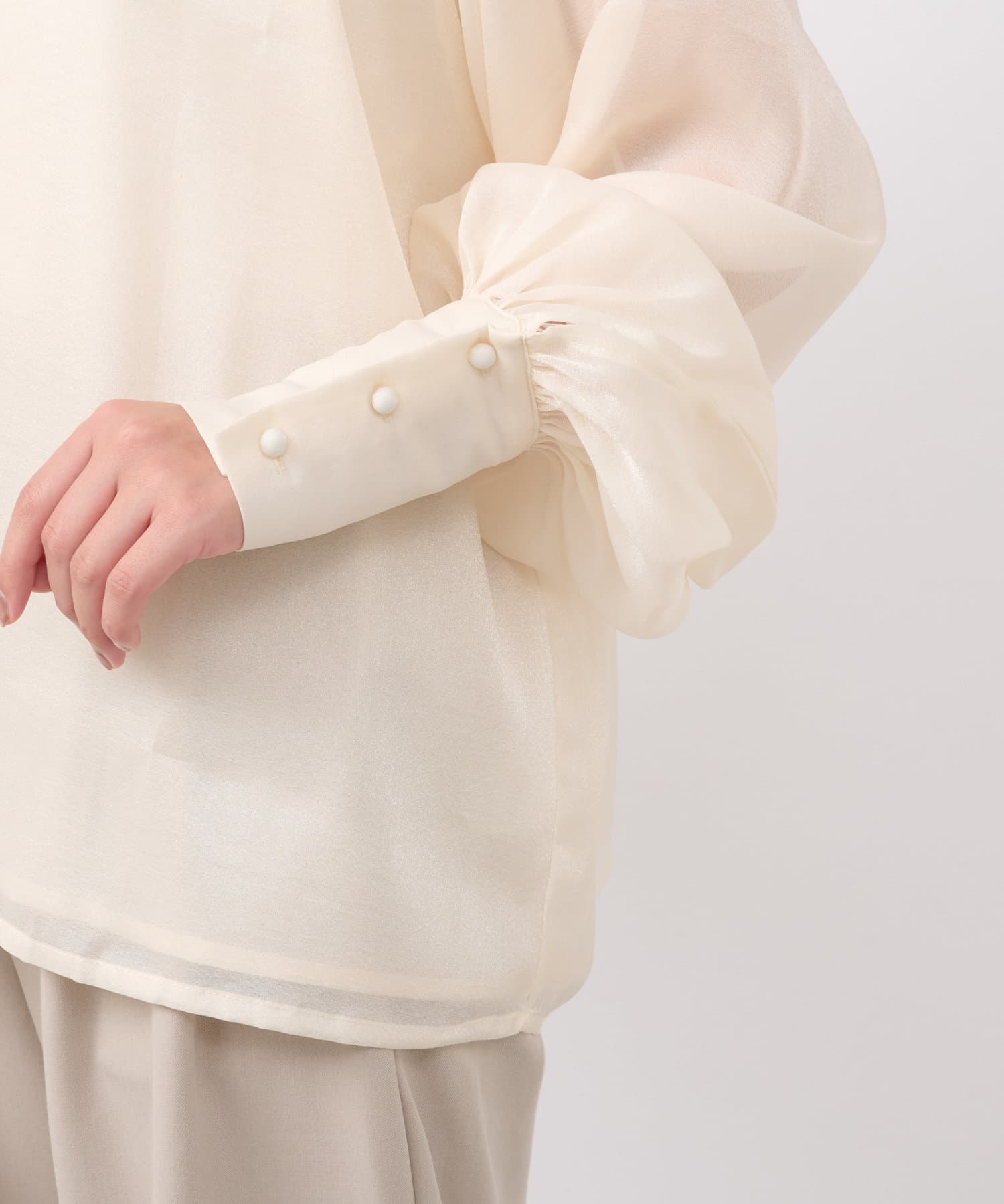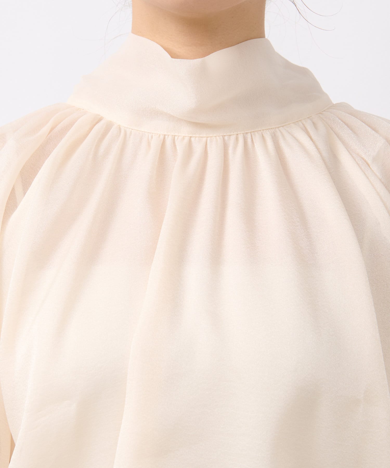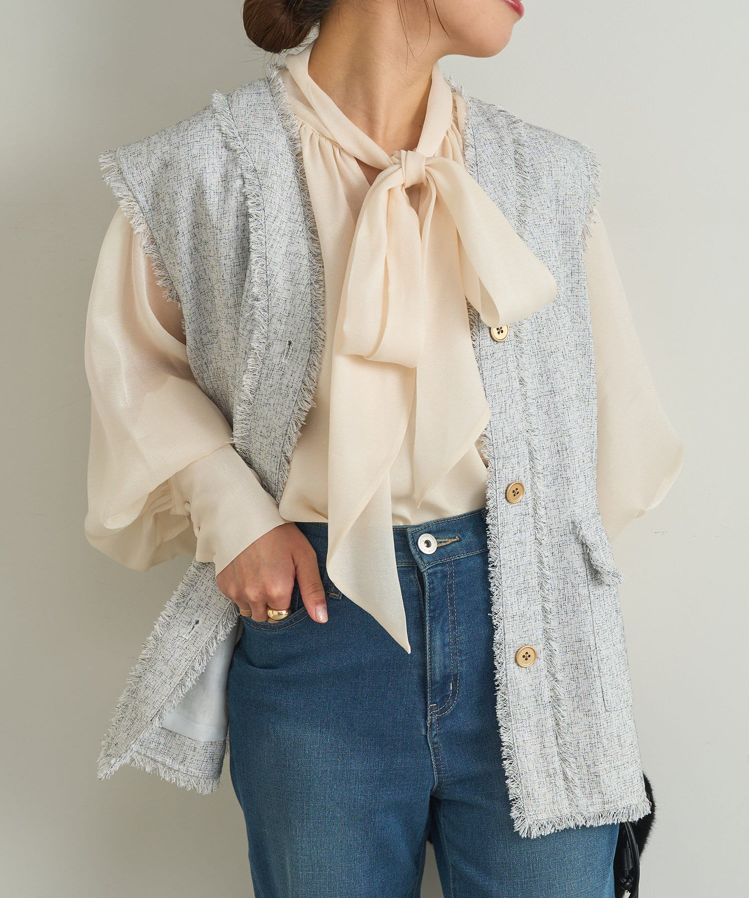 ボリュームのあるボウタイがとても華やかな印象のシアーブラウスです。
