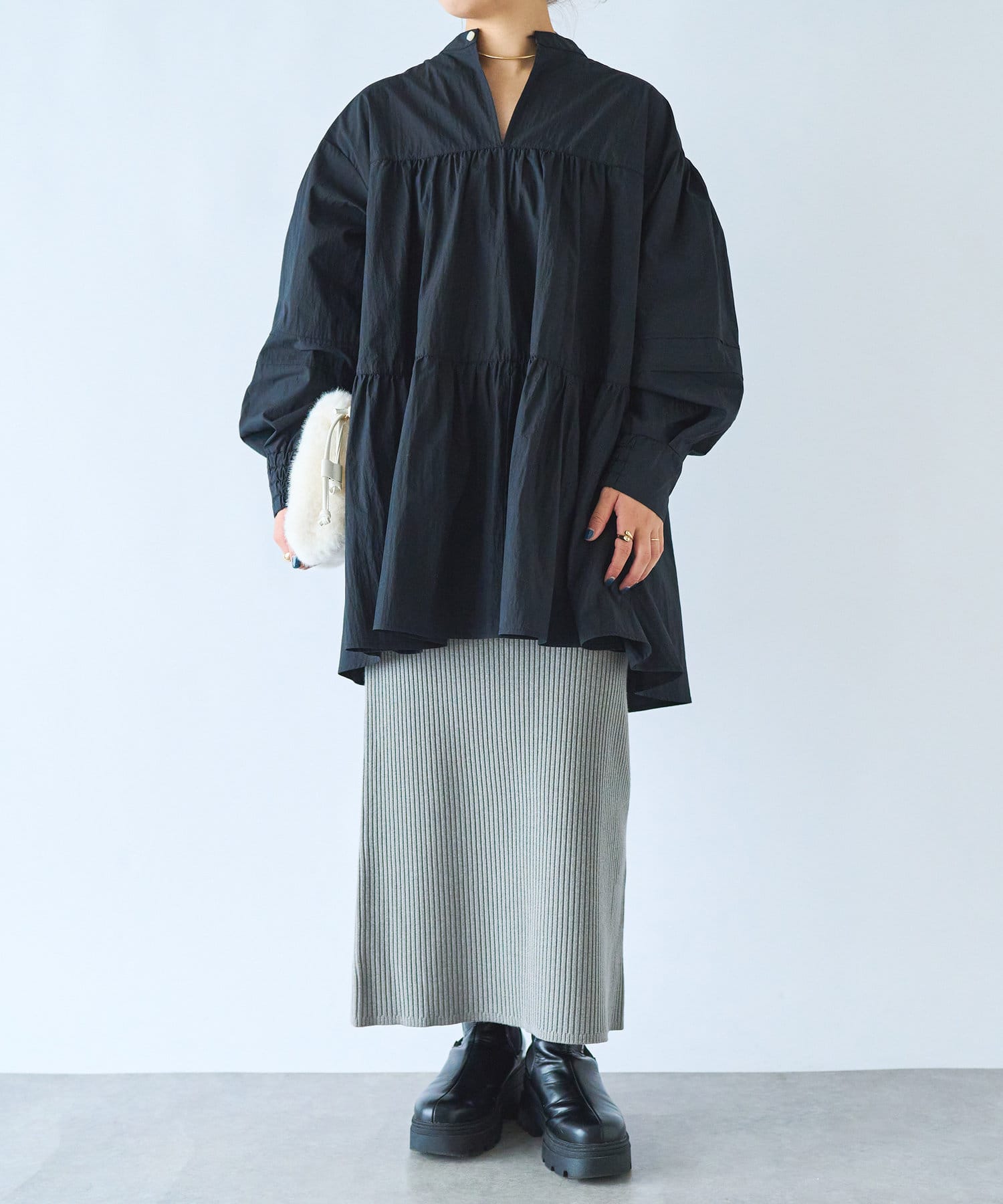 デニムやテーパードパンツ、ロングスカートなど、どんなボトムスとも好相性