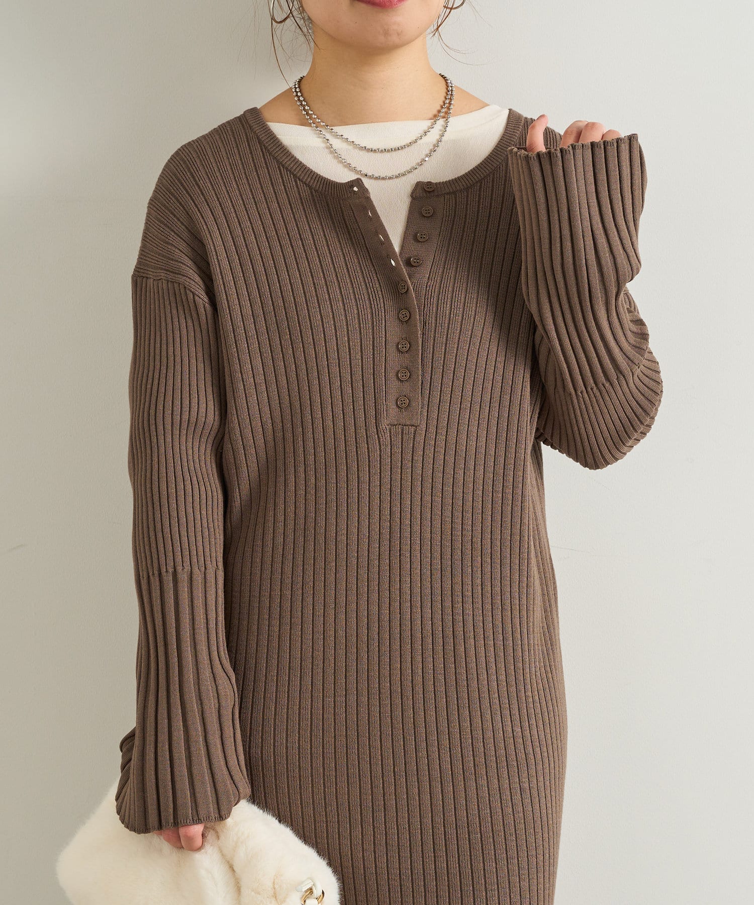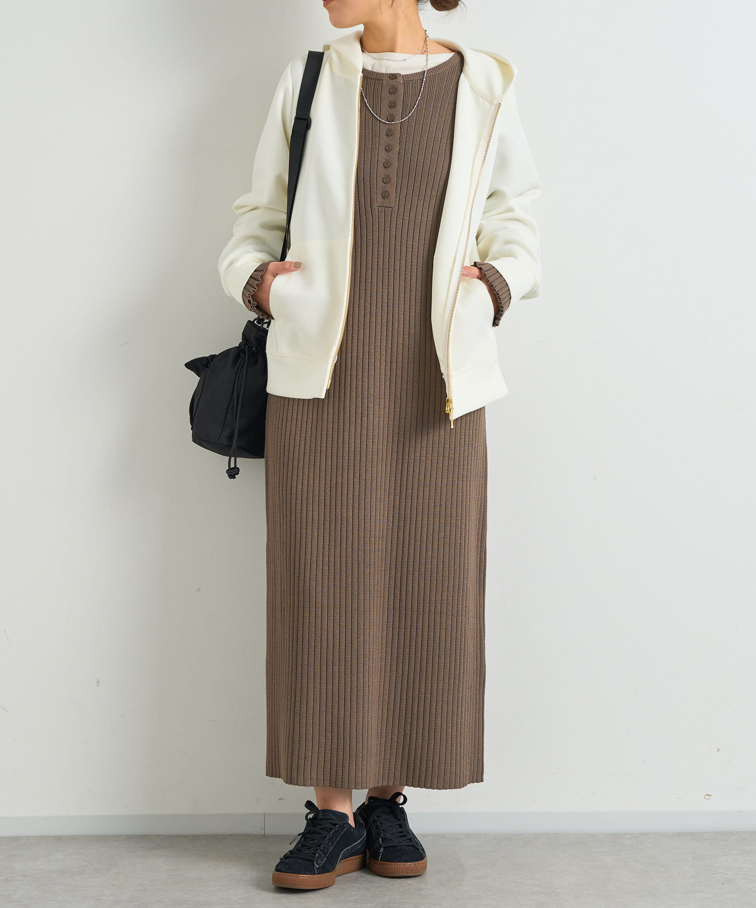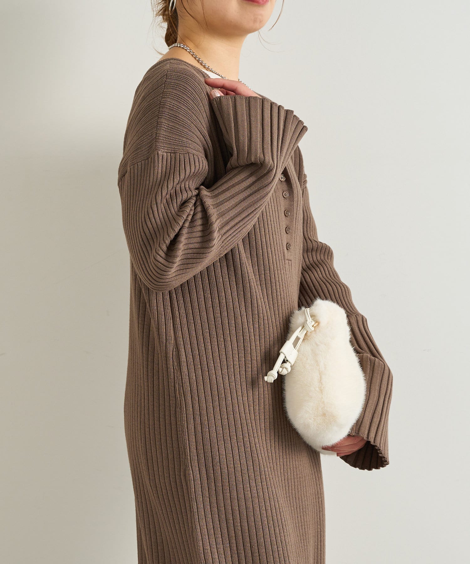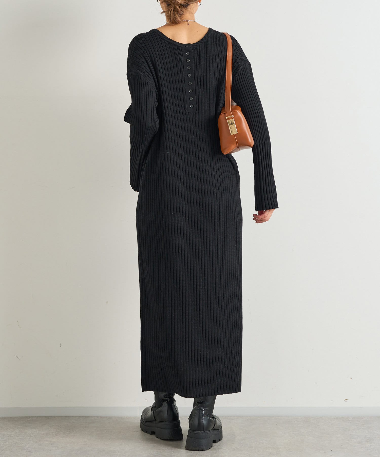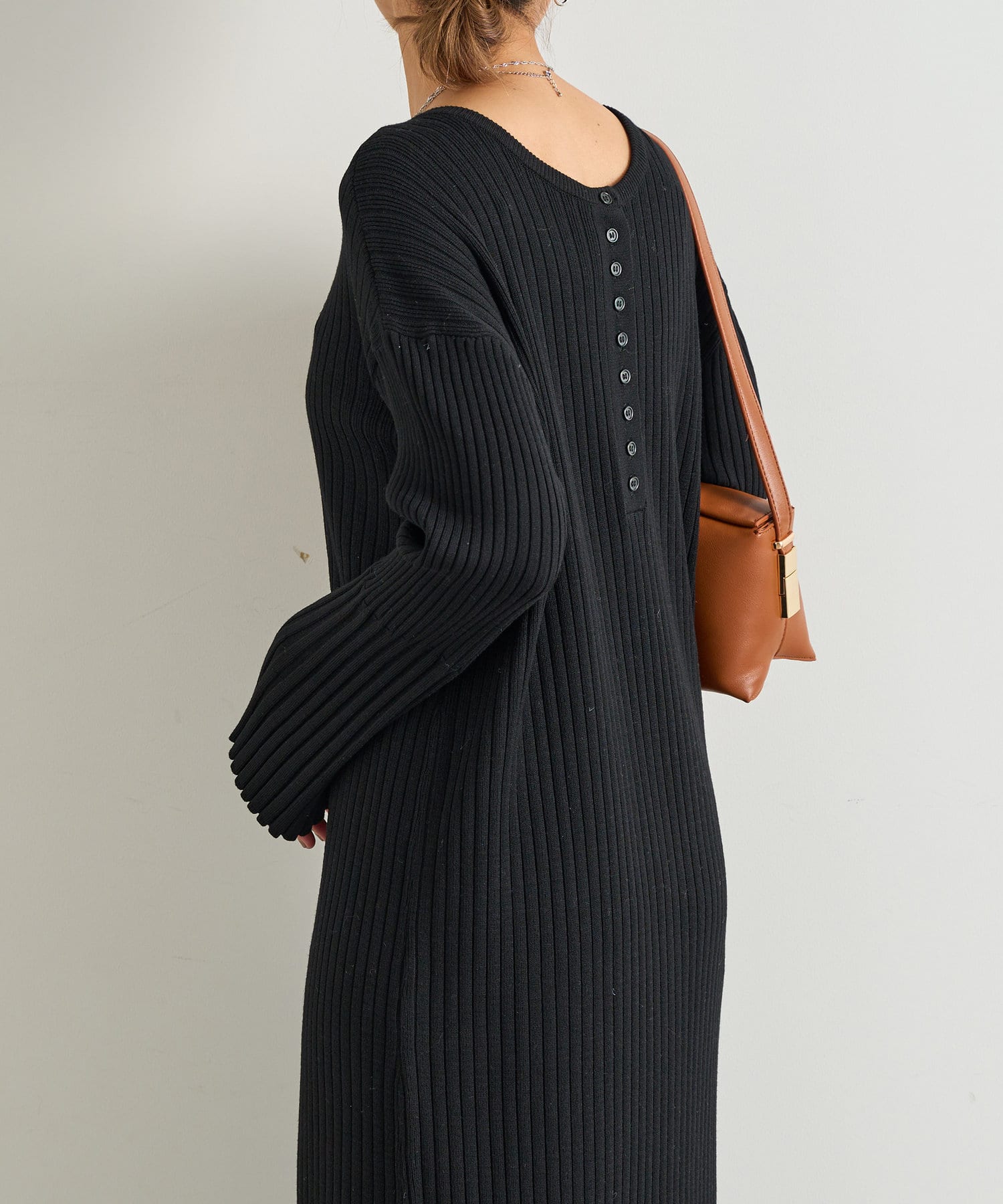 ・釦側とラウンドネックどちらも前で着ていただける前後2WAYでの着用が可能なリブワンピ