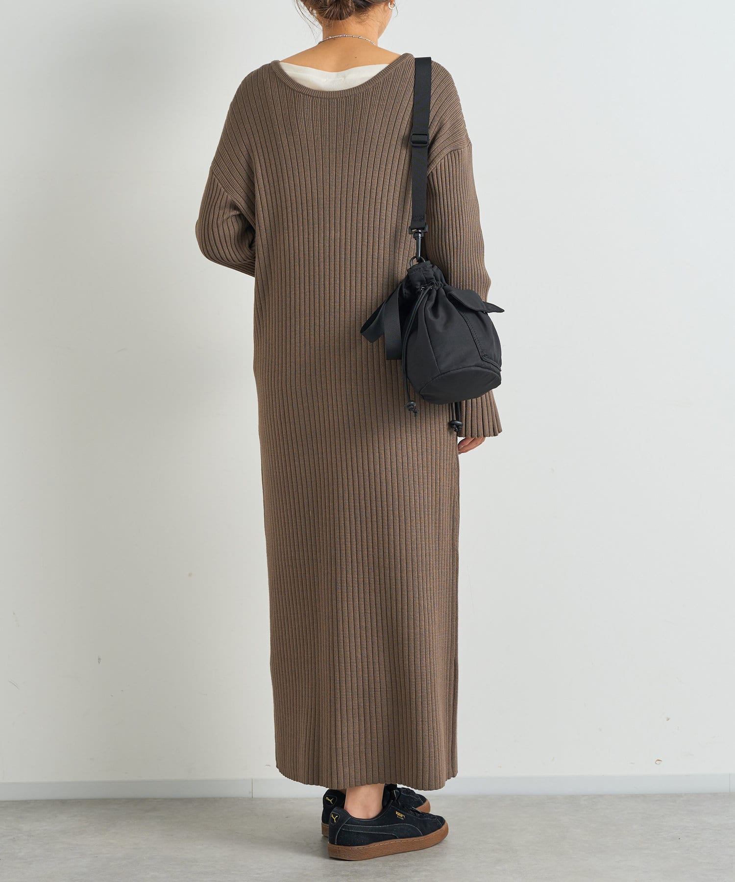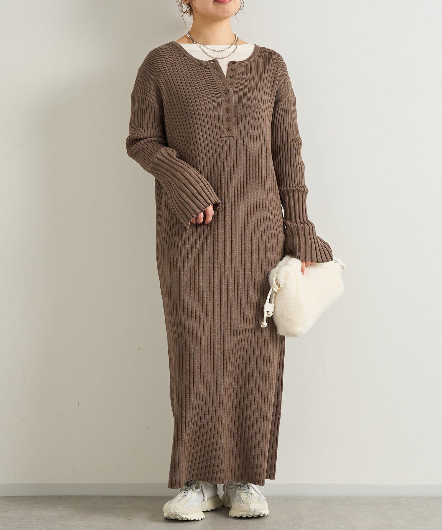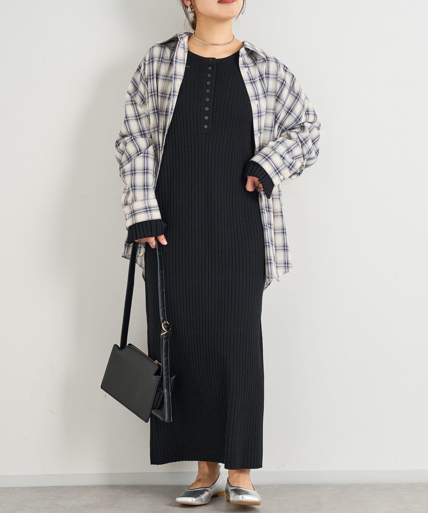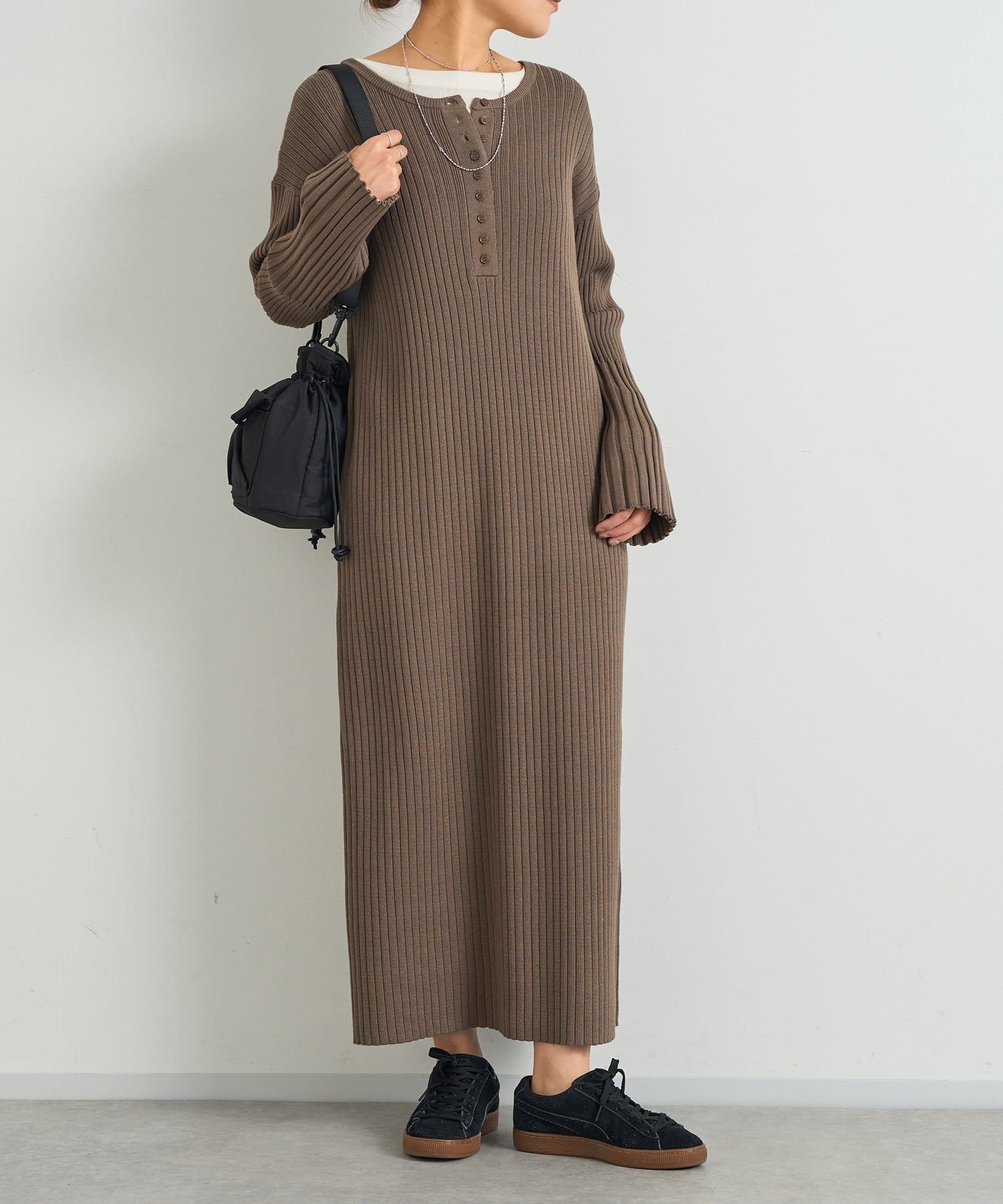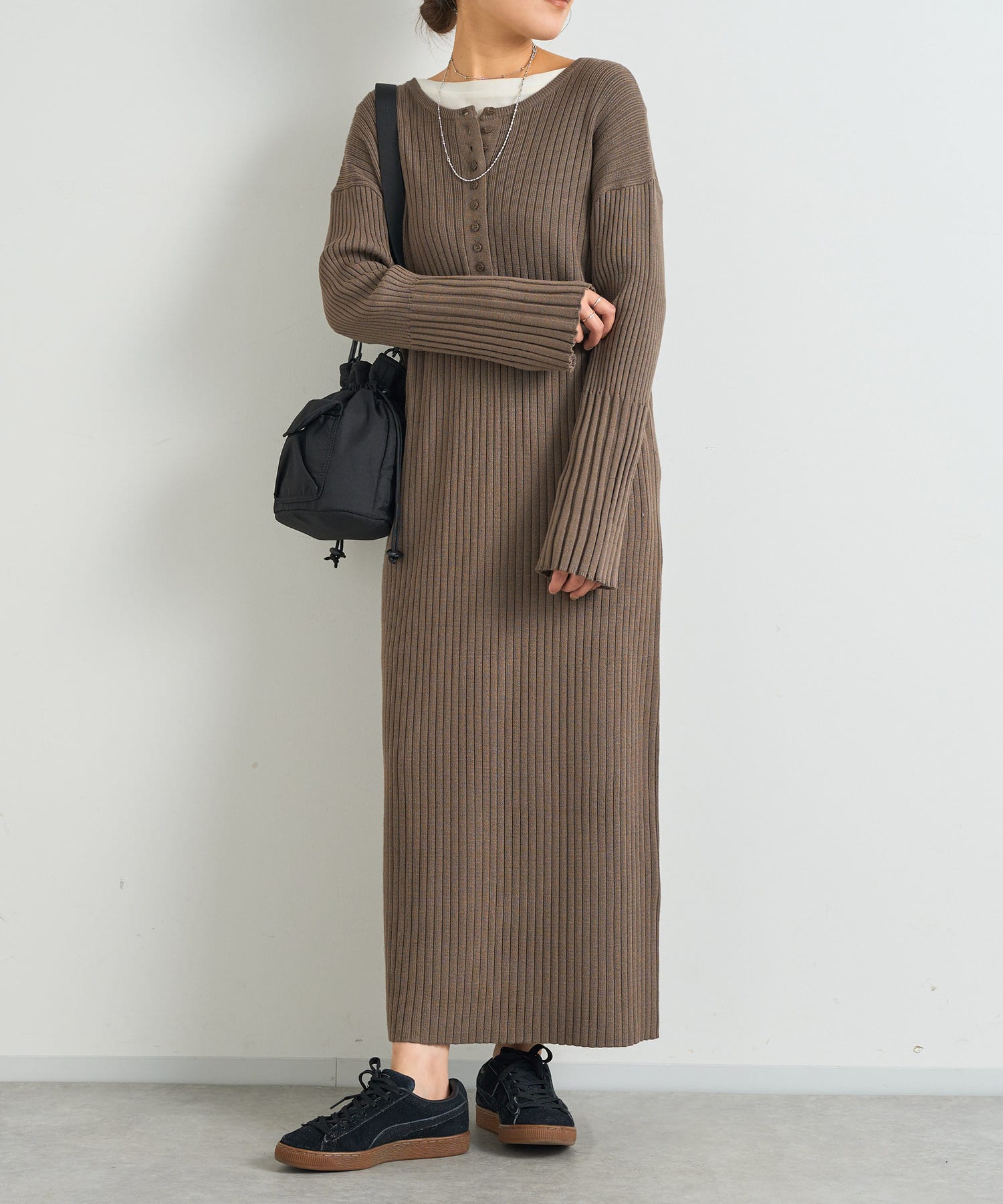 ・釦側とラウンドネックどちらも前で着ていただける前後2WAYでの着用が可能なリブワンピ