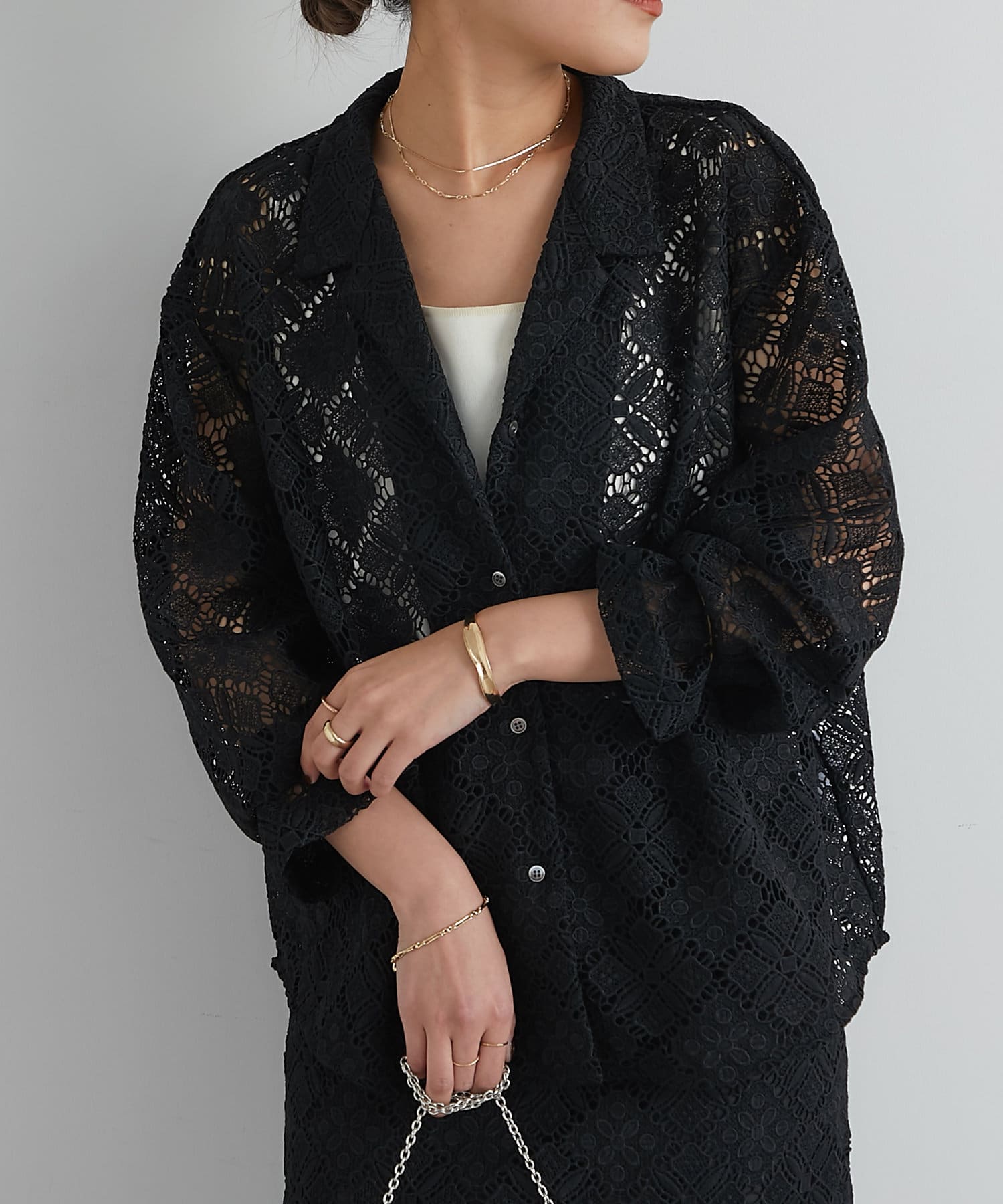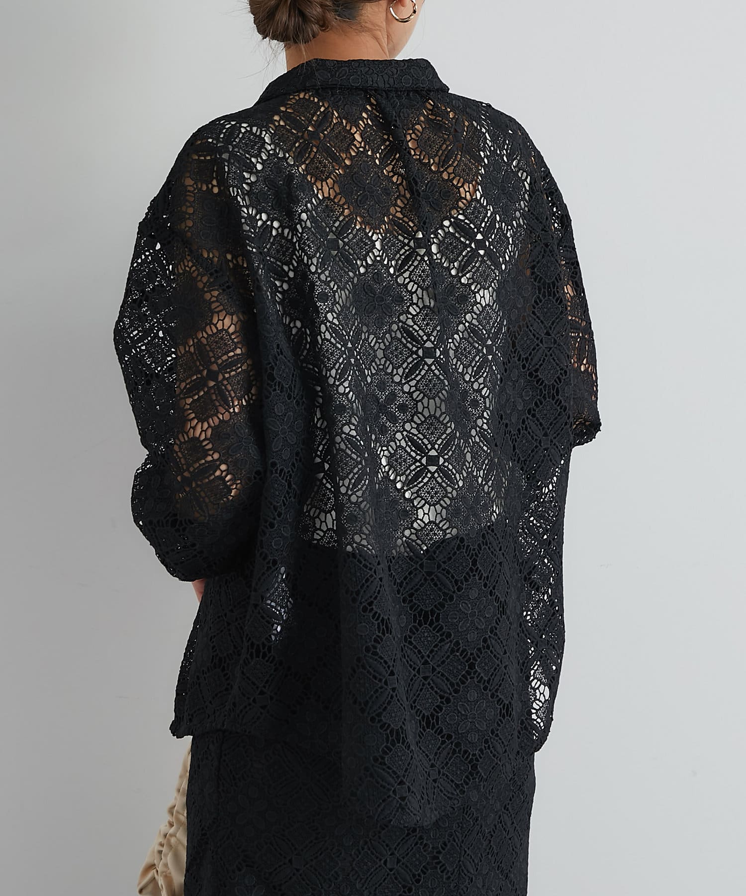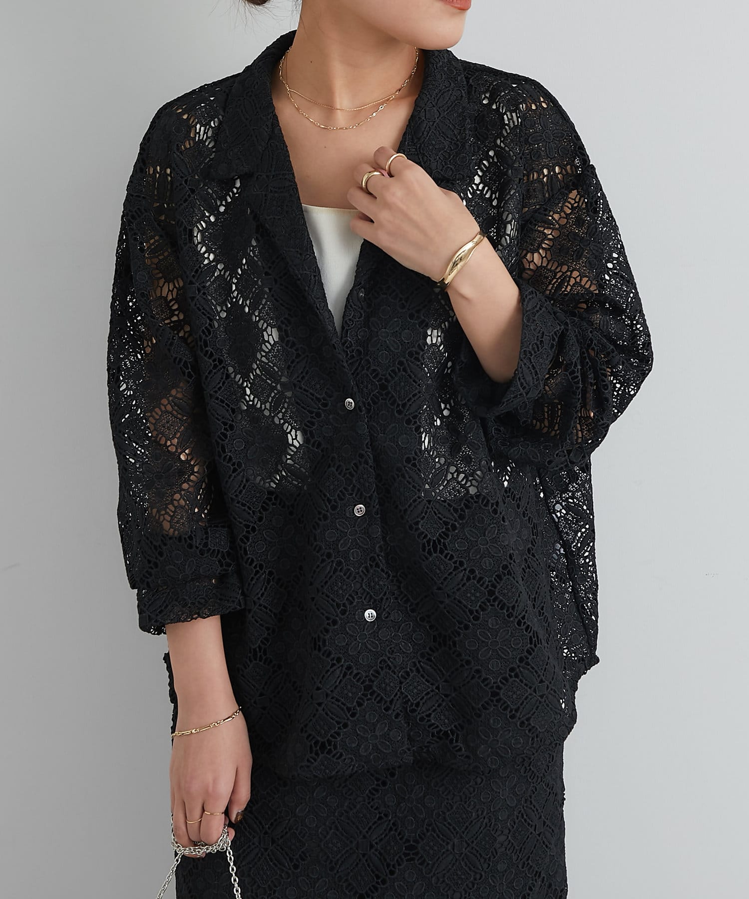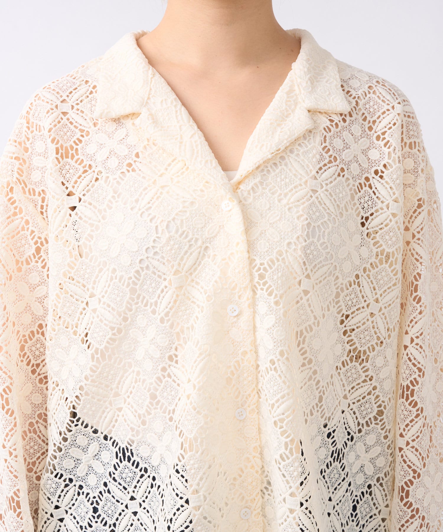 ・透け感たっぷりな総レースのオープンカラーシャツ