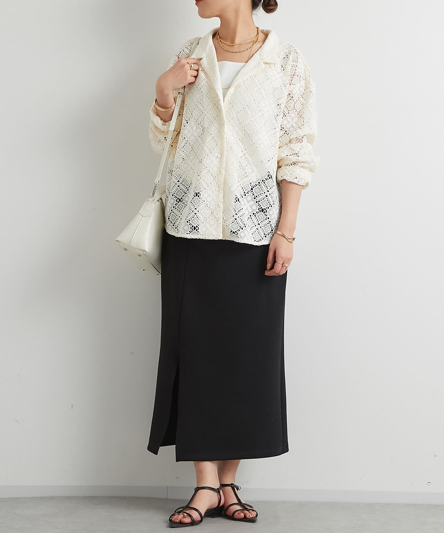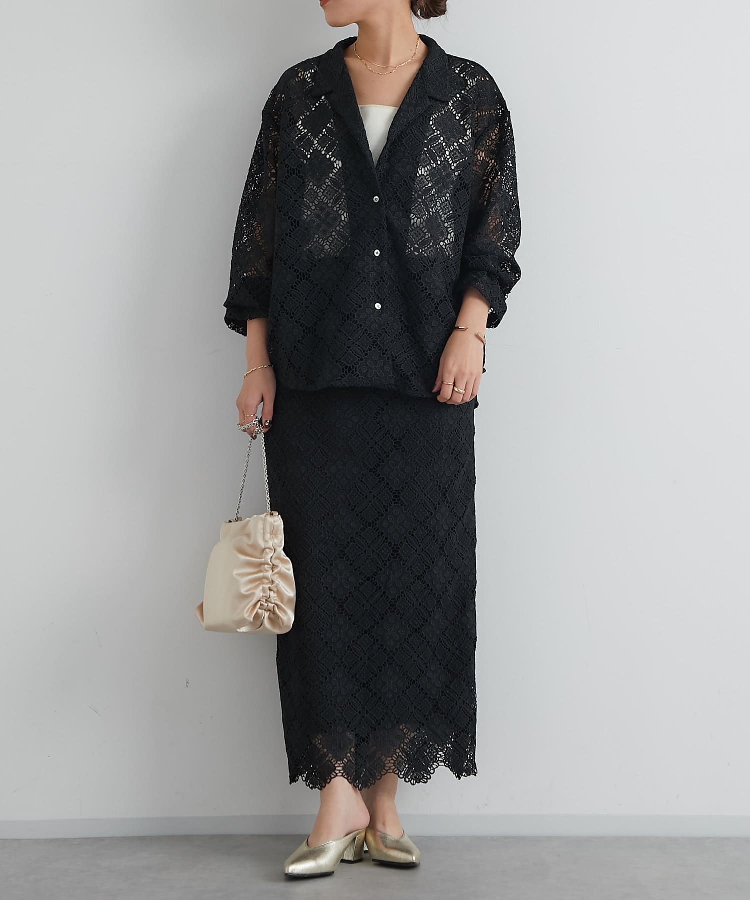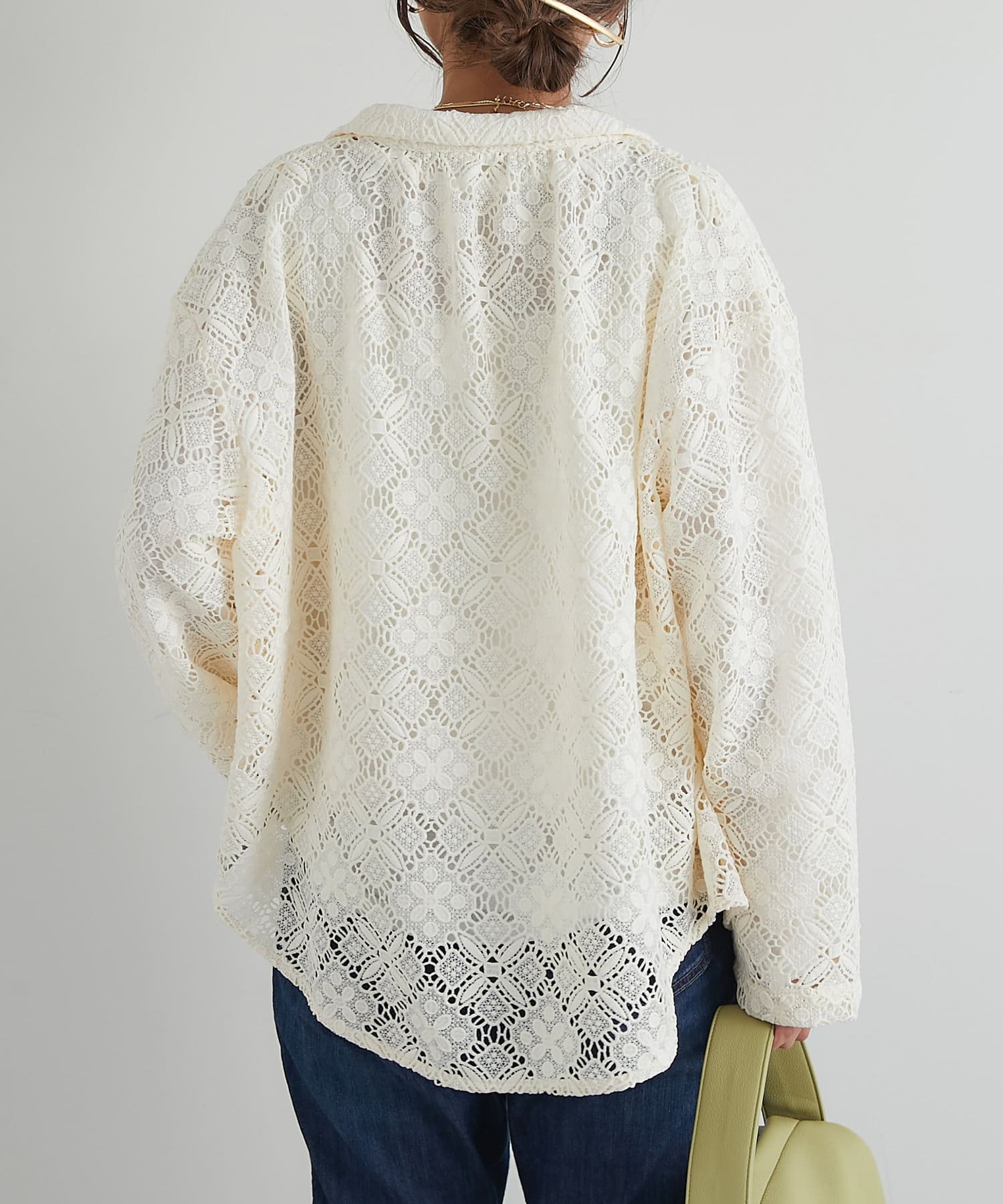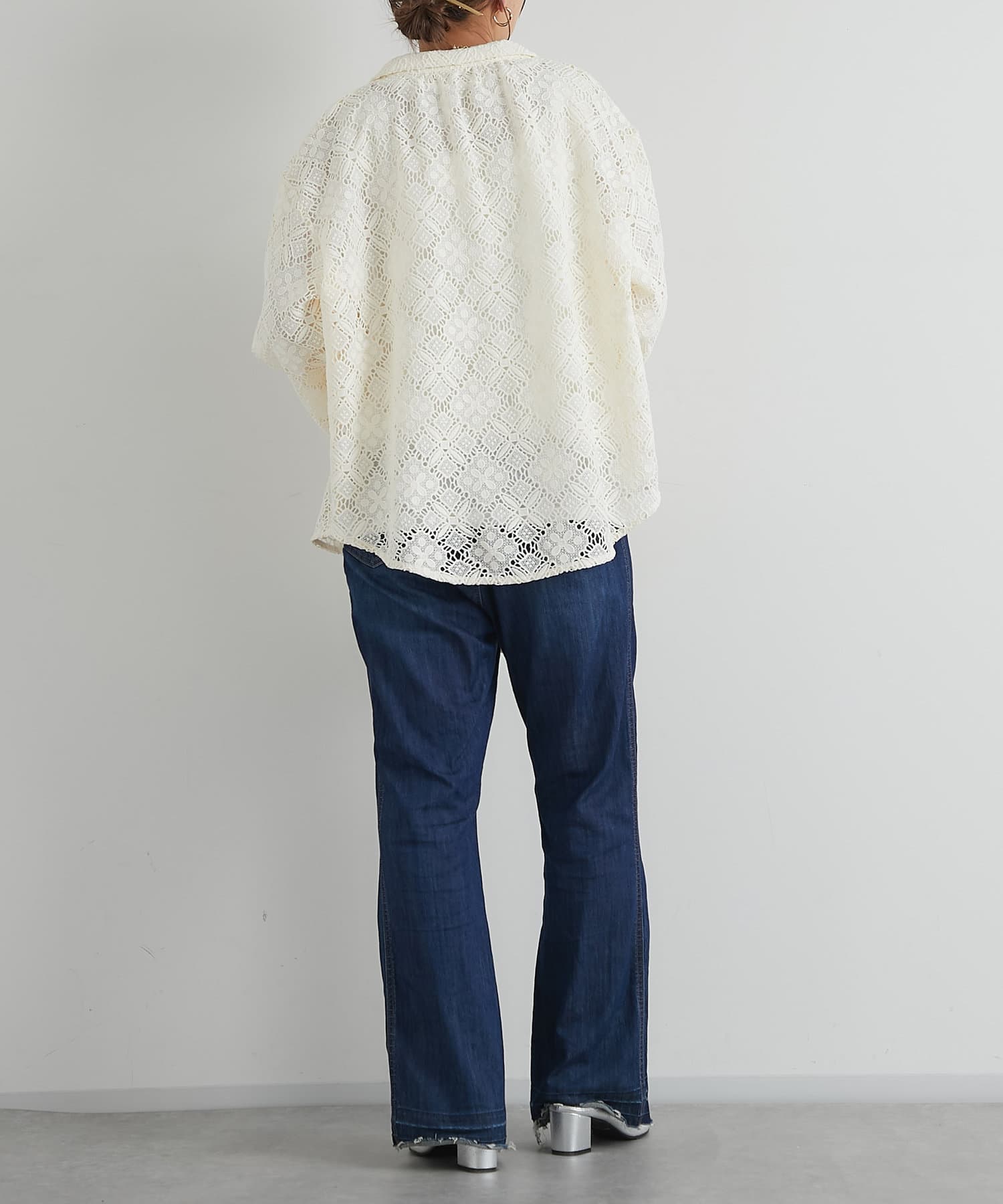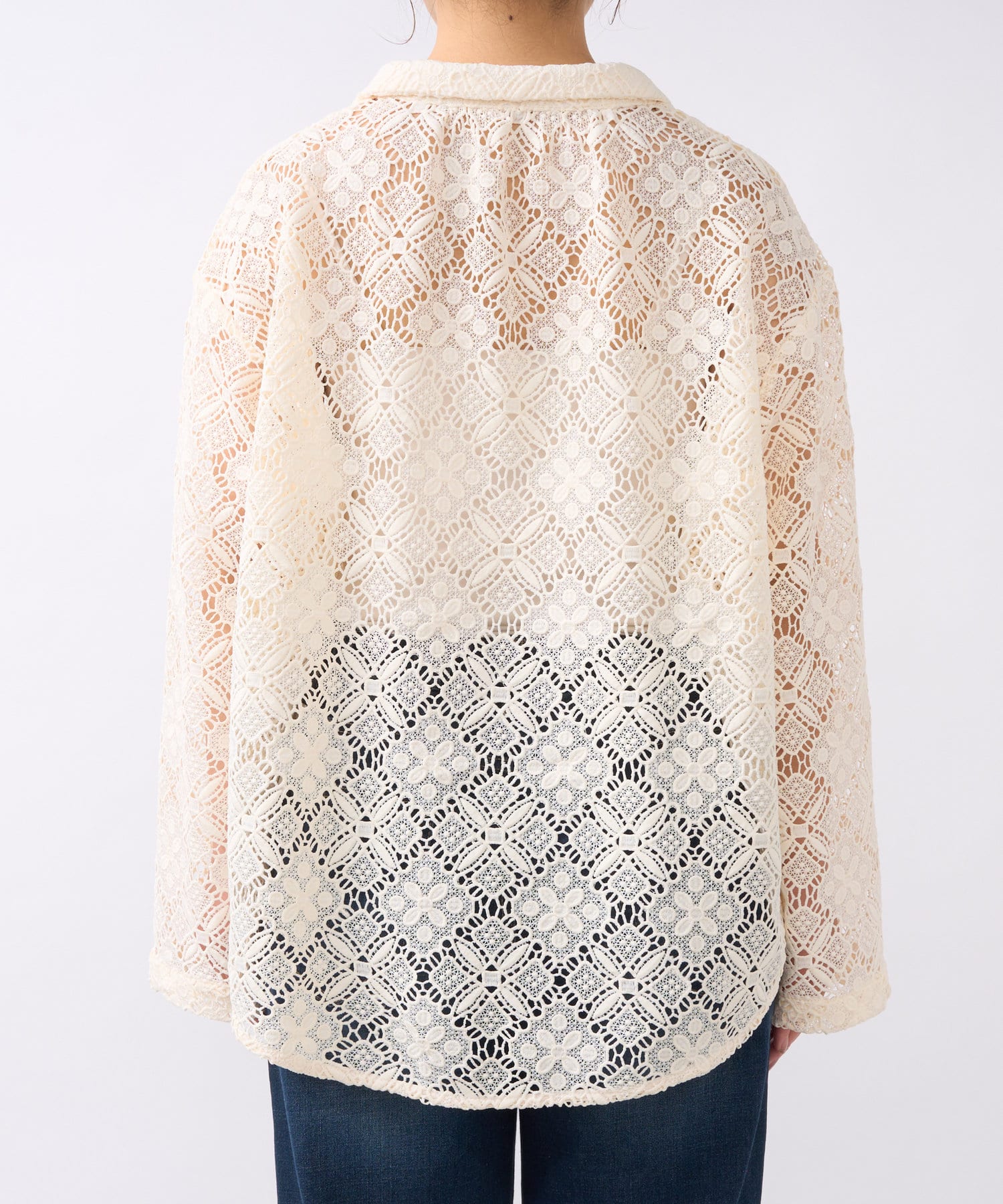 ・透け感たっぷりな総レースのオープンカラーシャツ