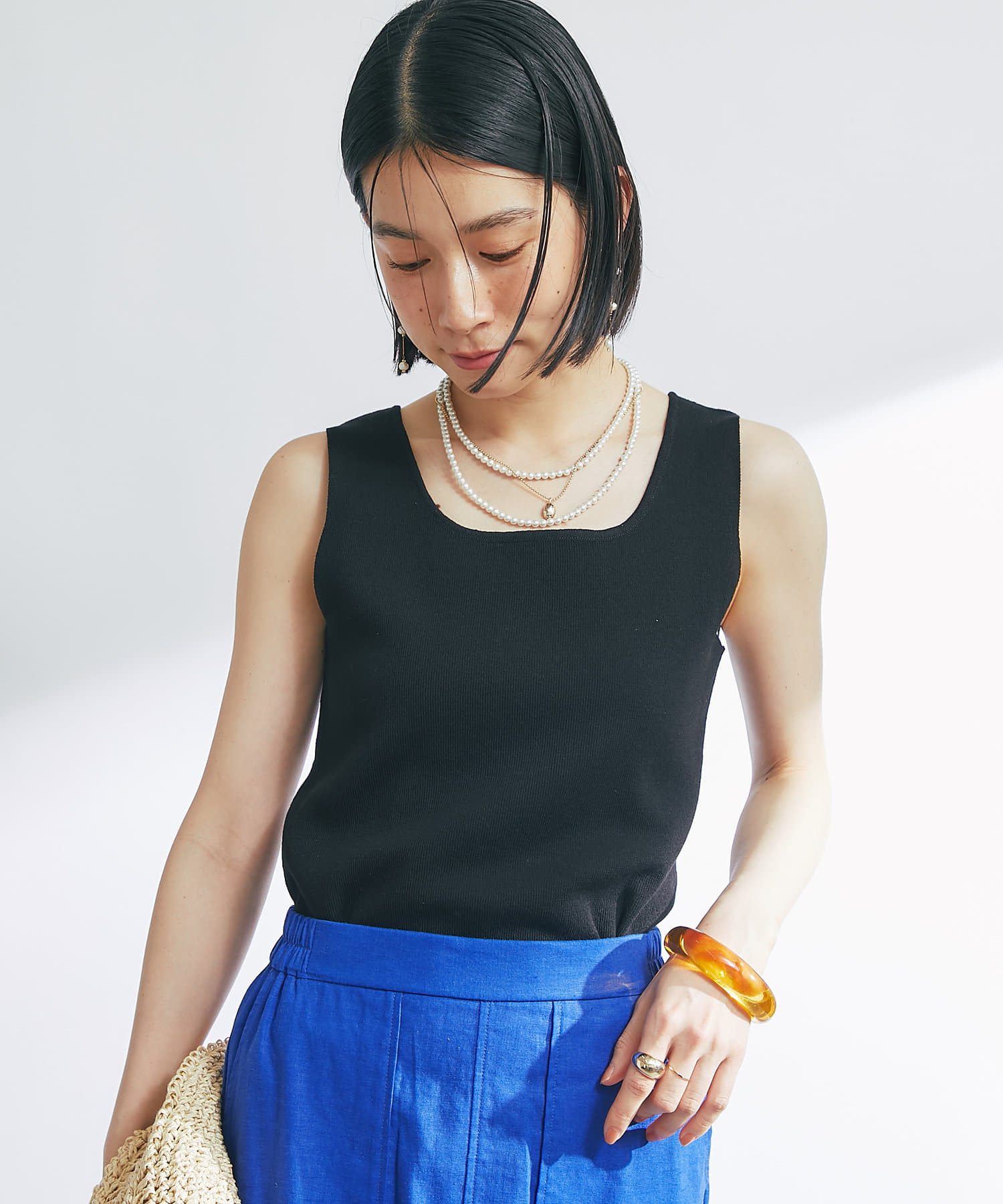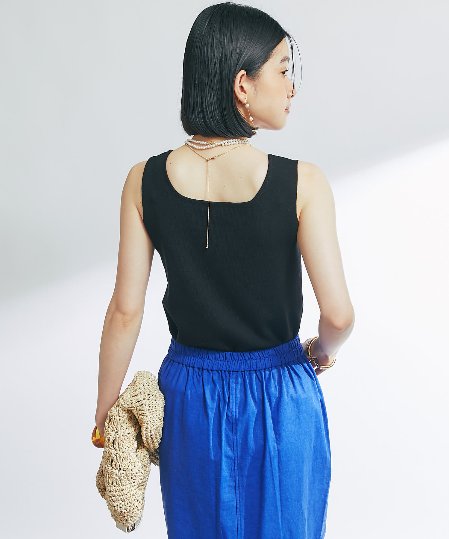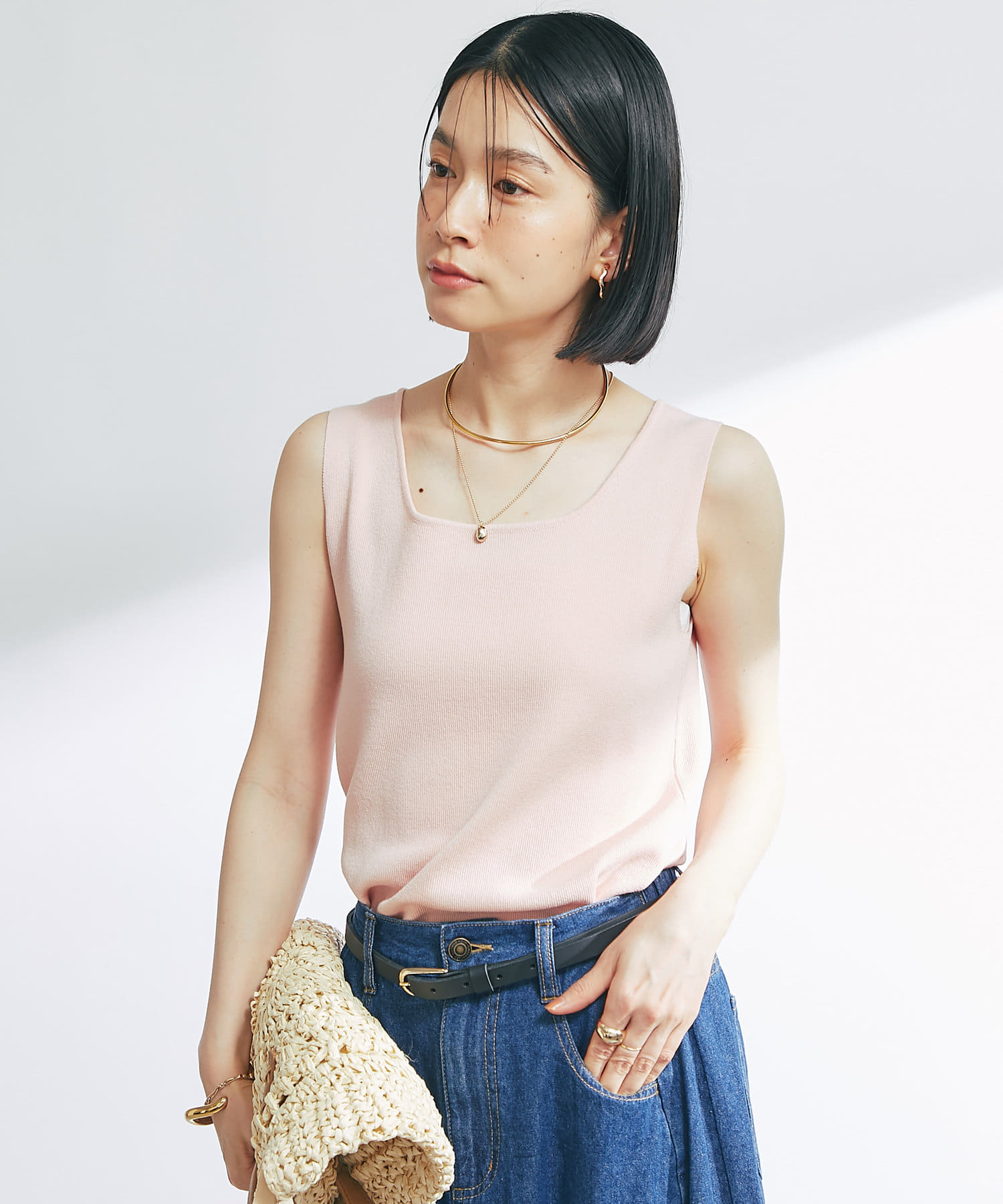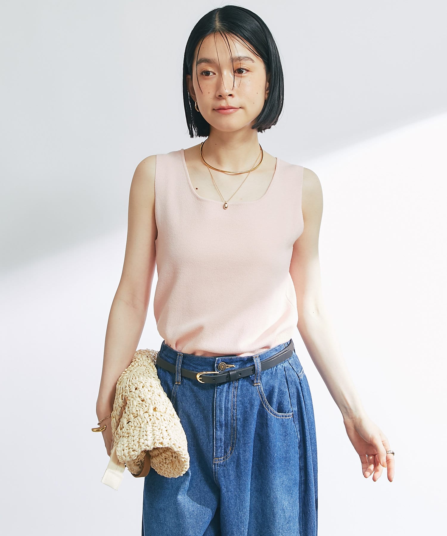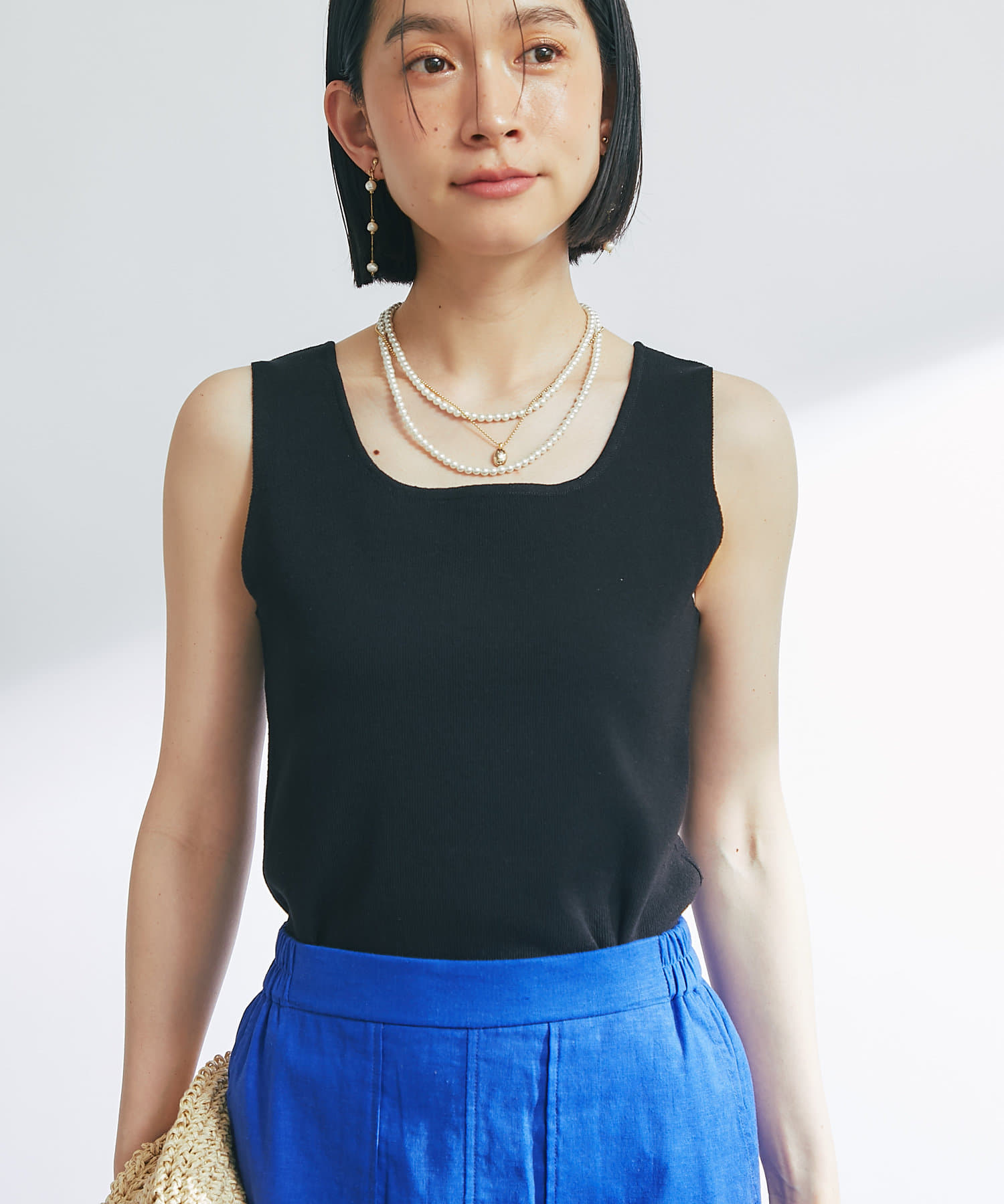 ・デコルテをきれいに見せるスクエアネックのニットタンクトップ