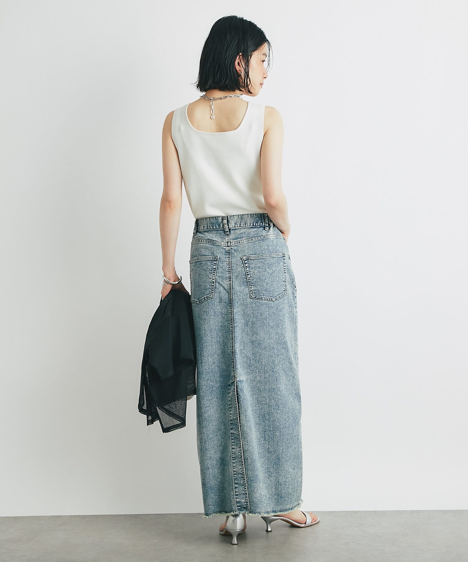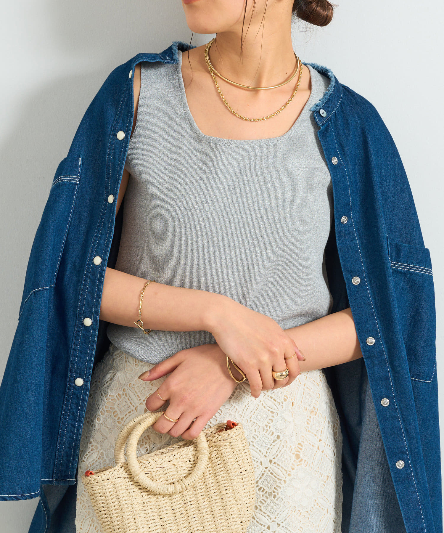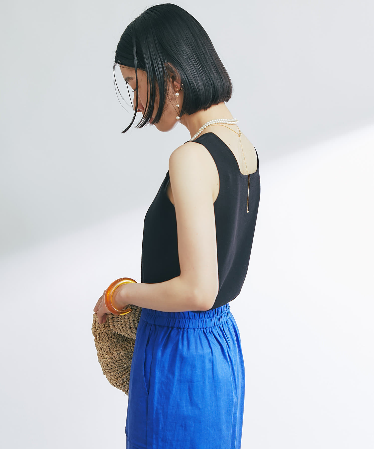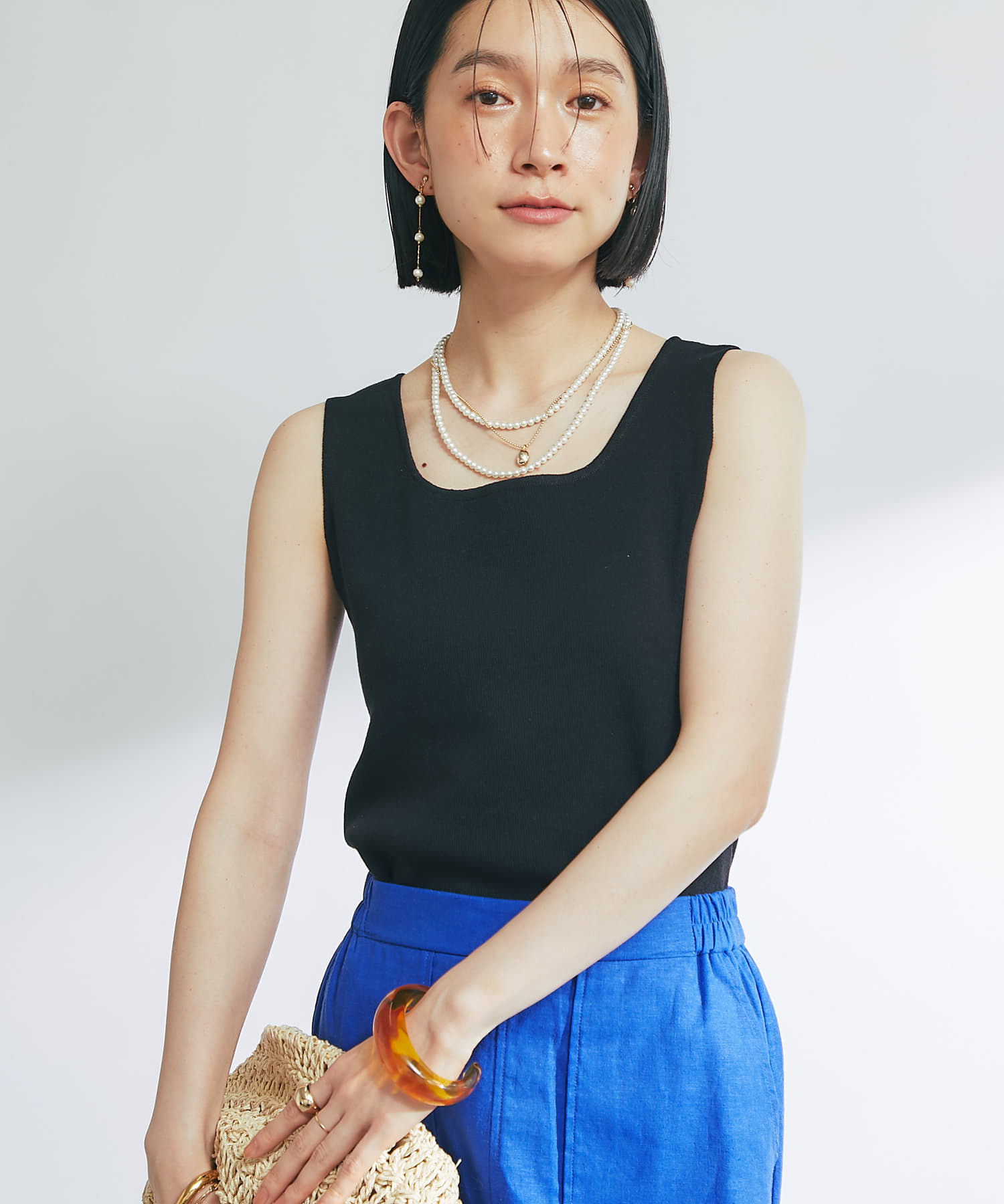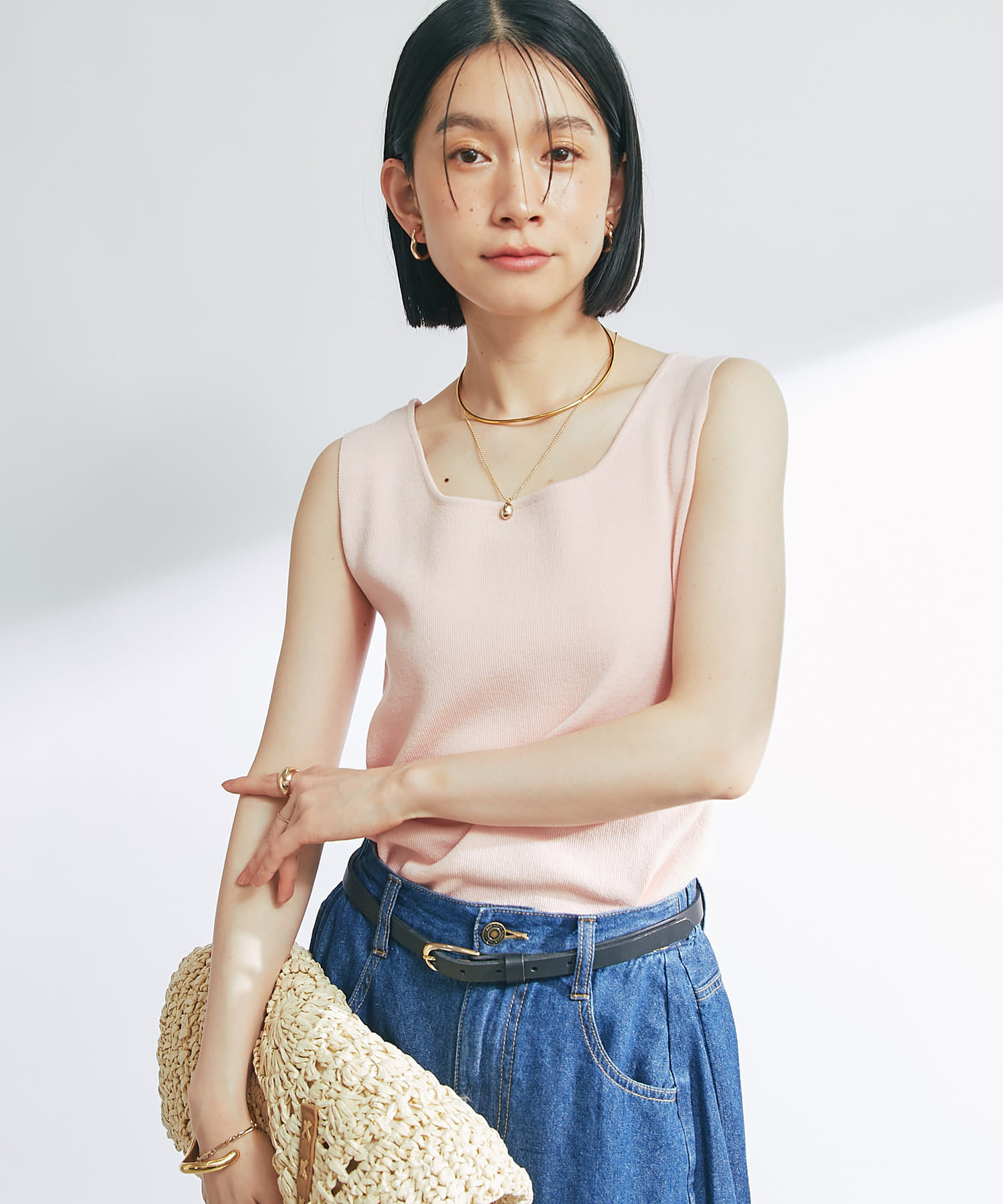 ・デコルテをきれいに見せるスクエアネックのニットタンクトップ