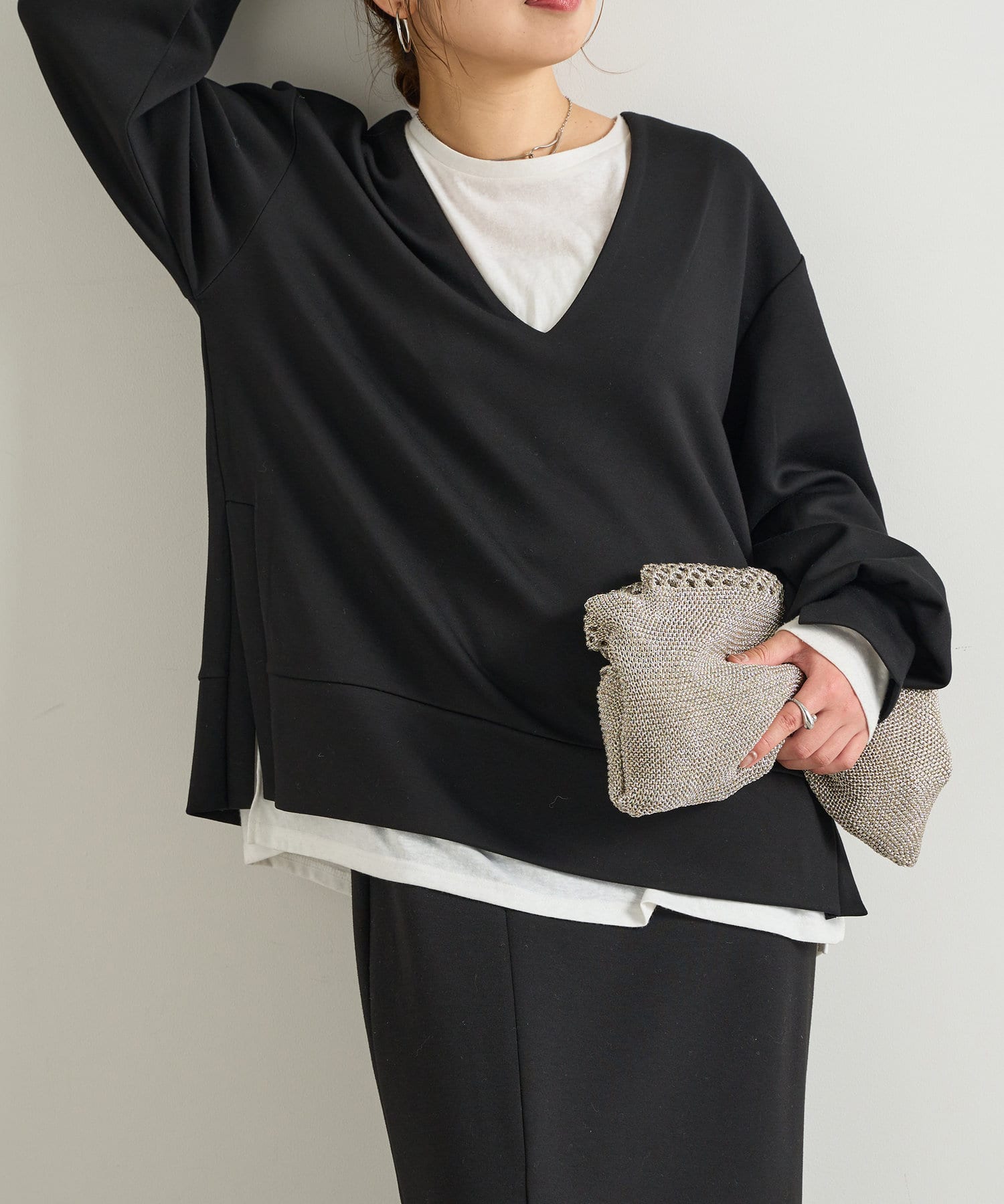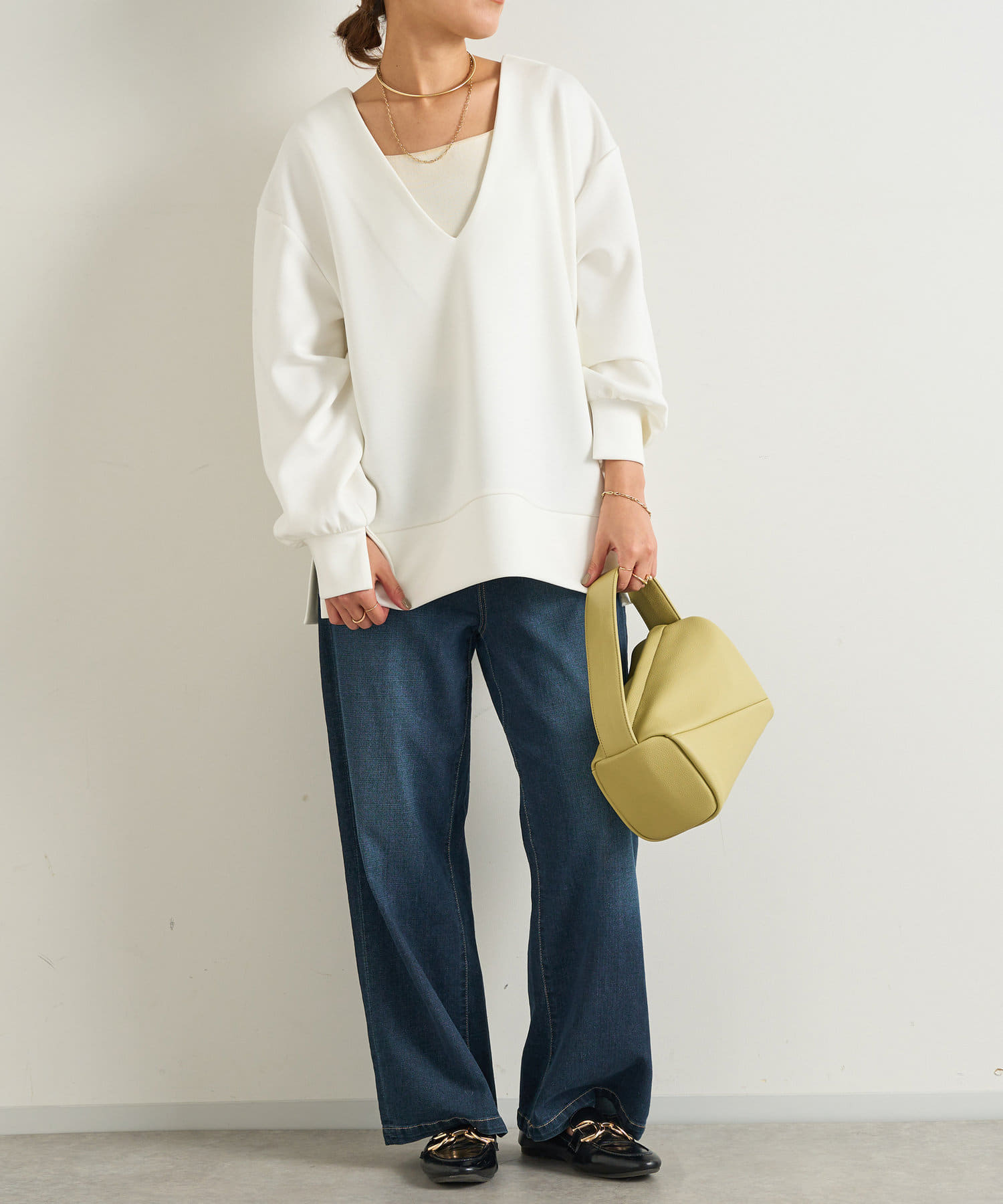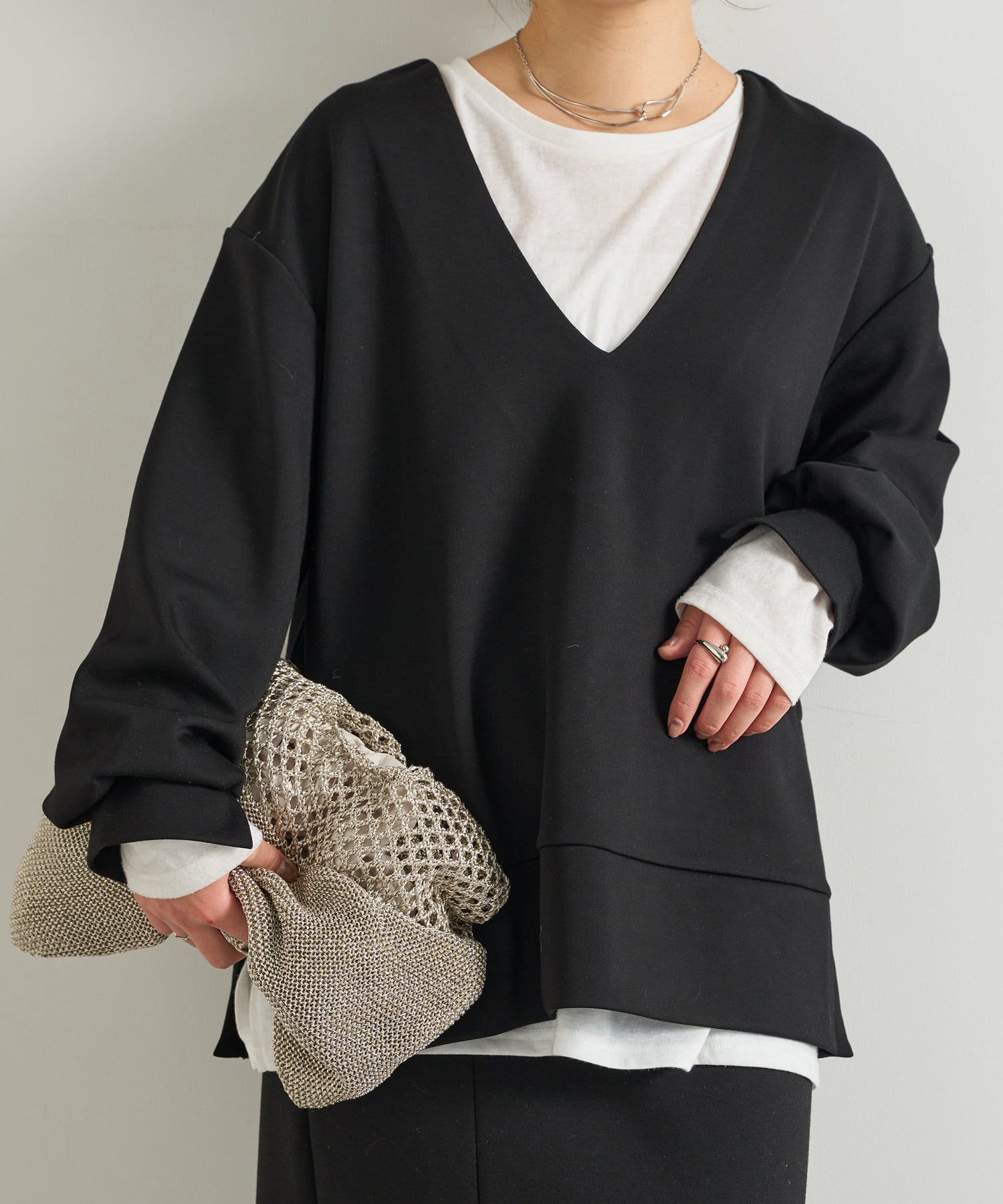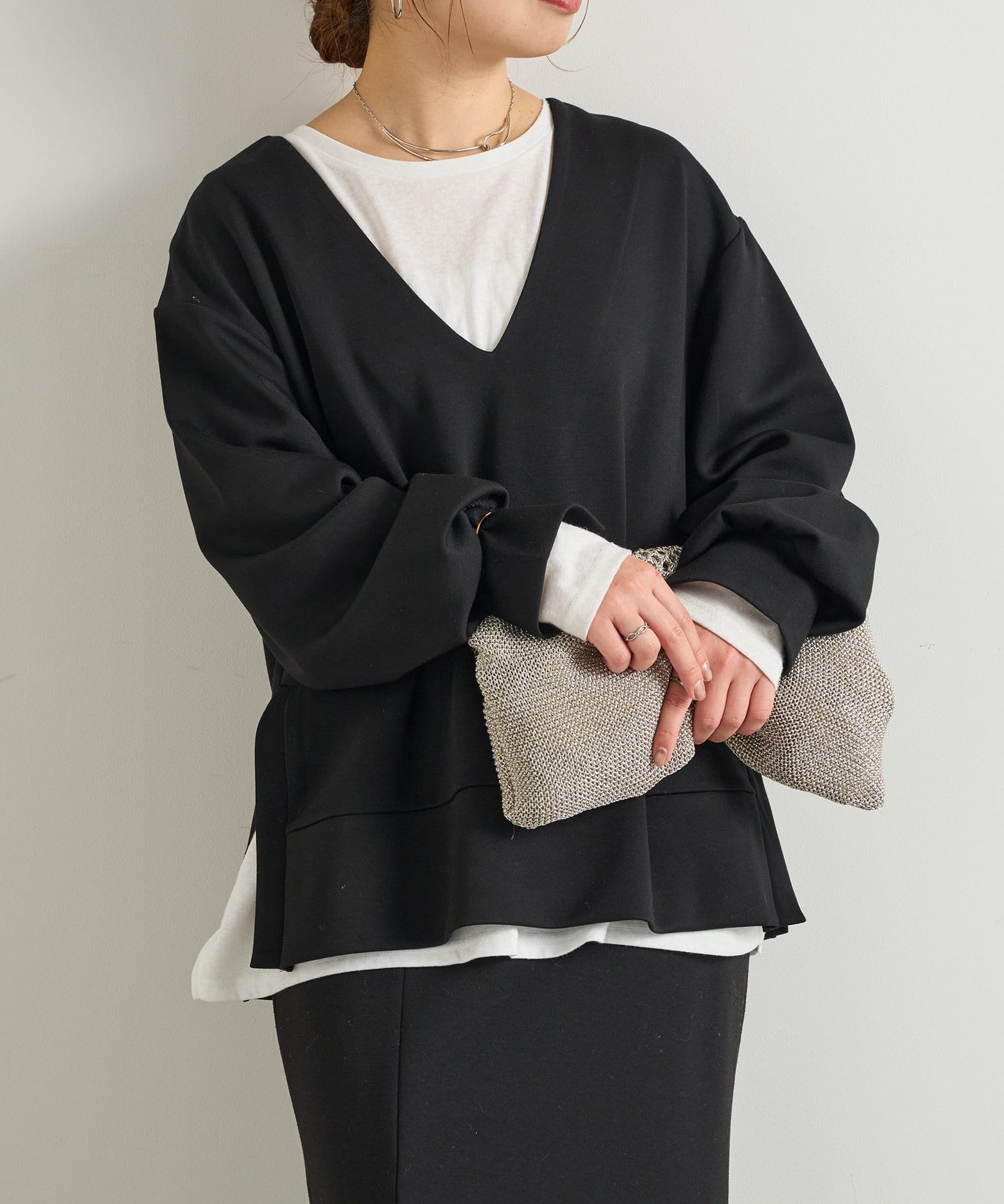 ・トレンドの深Vネックとサイドスリットでレイヤードしてインナーをチラ見せもオススメ
