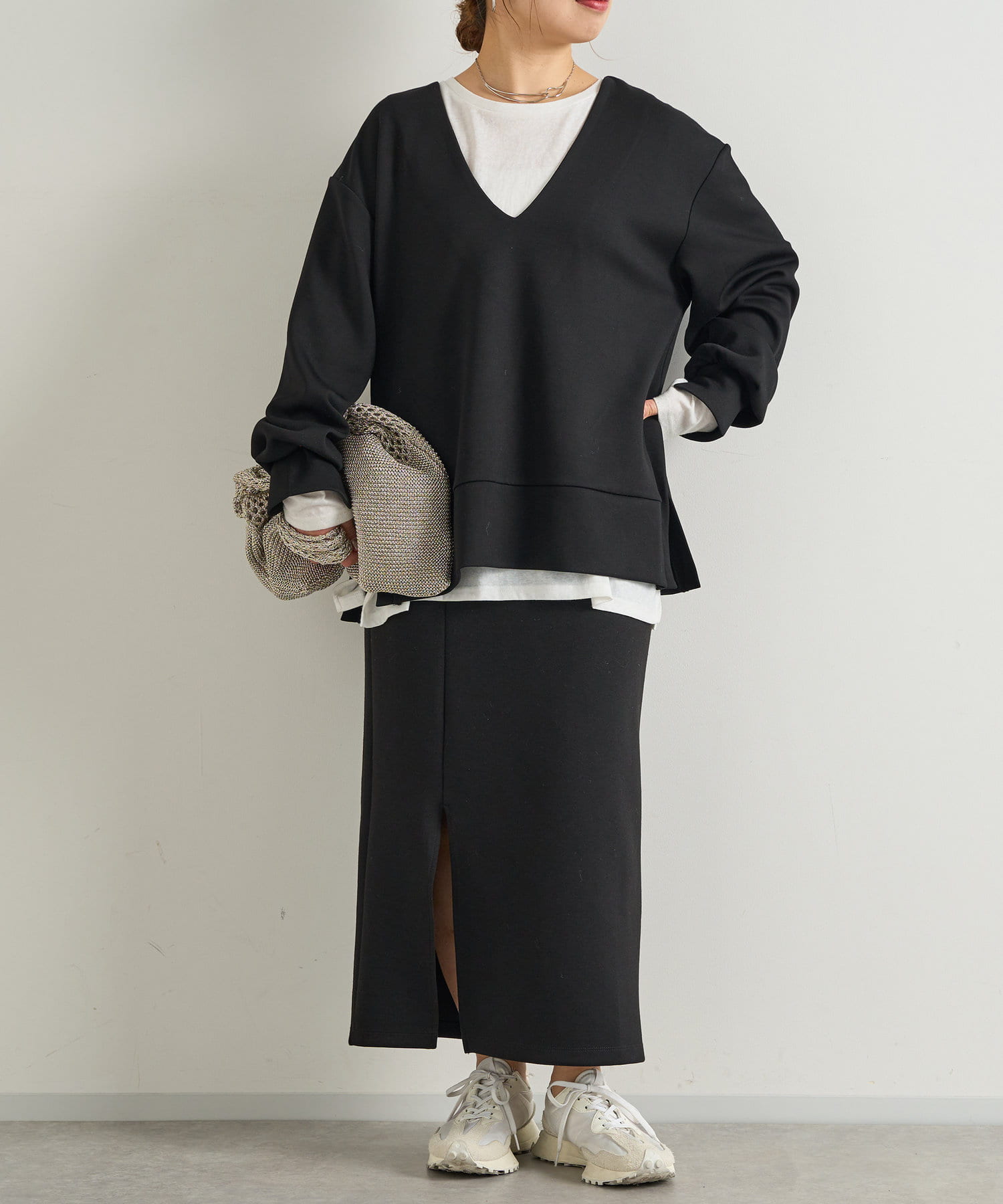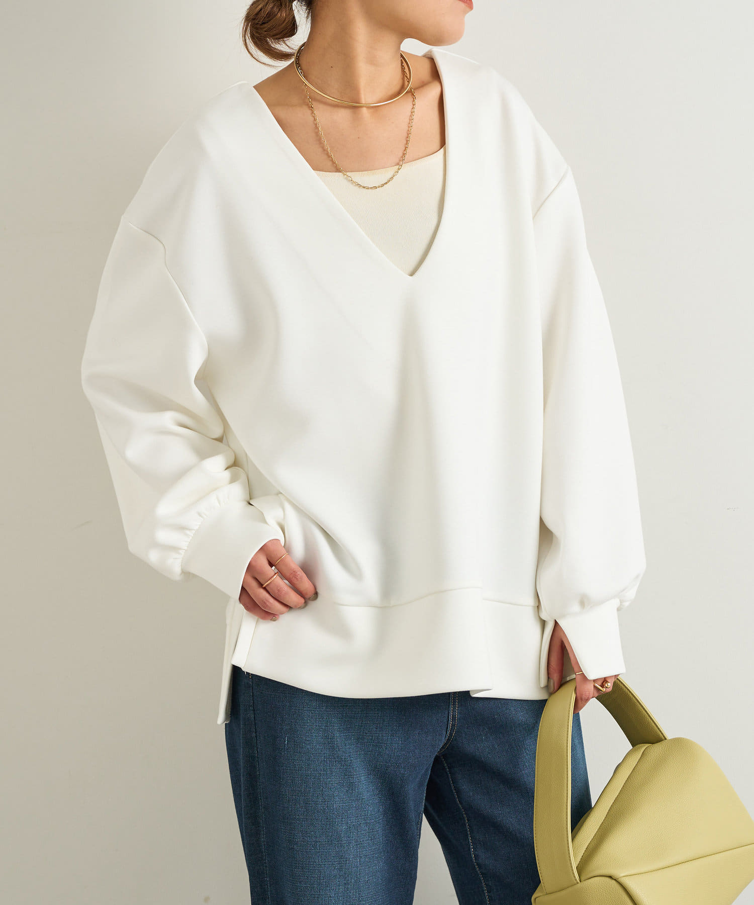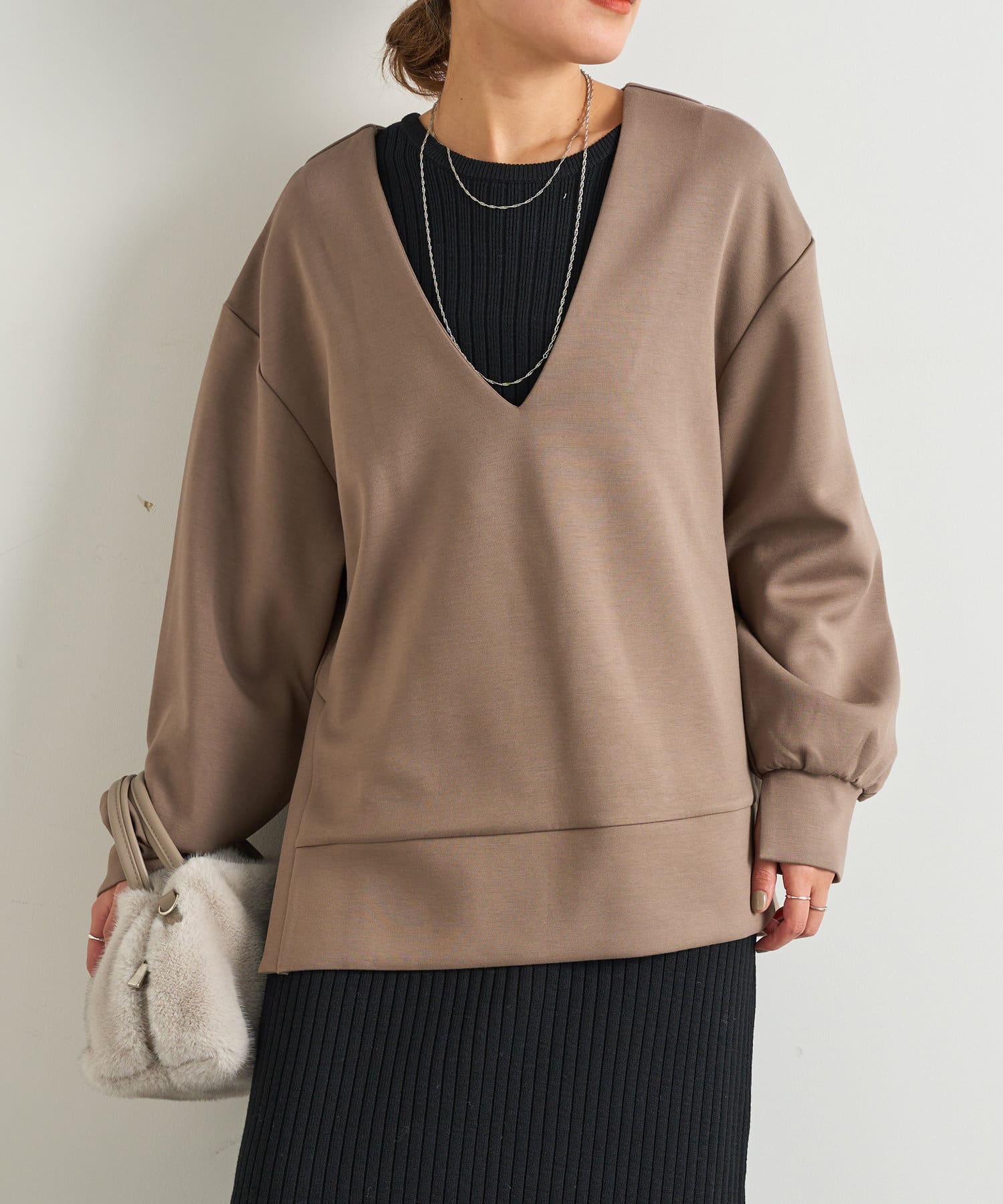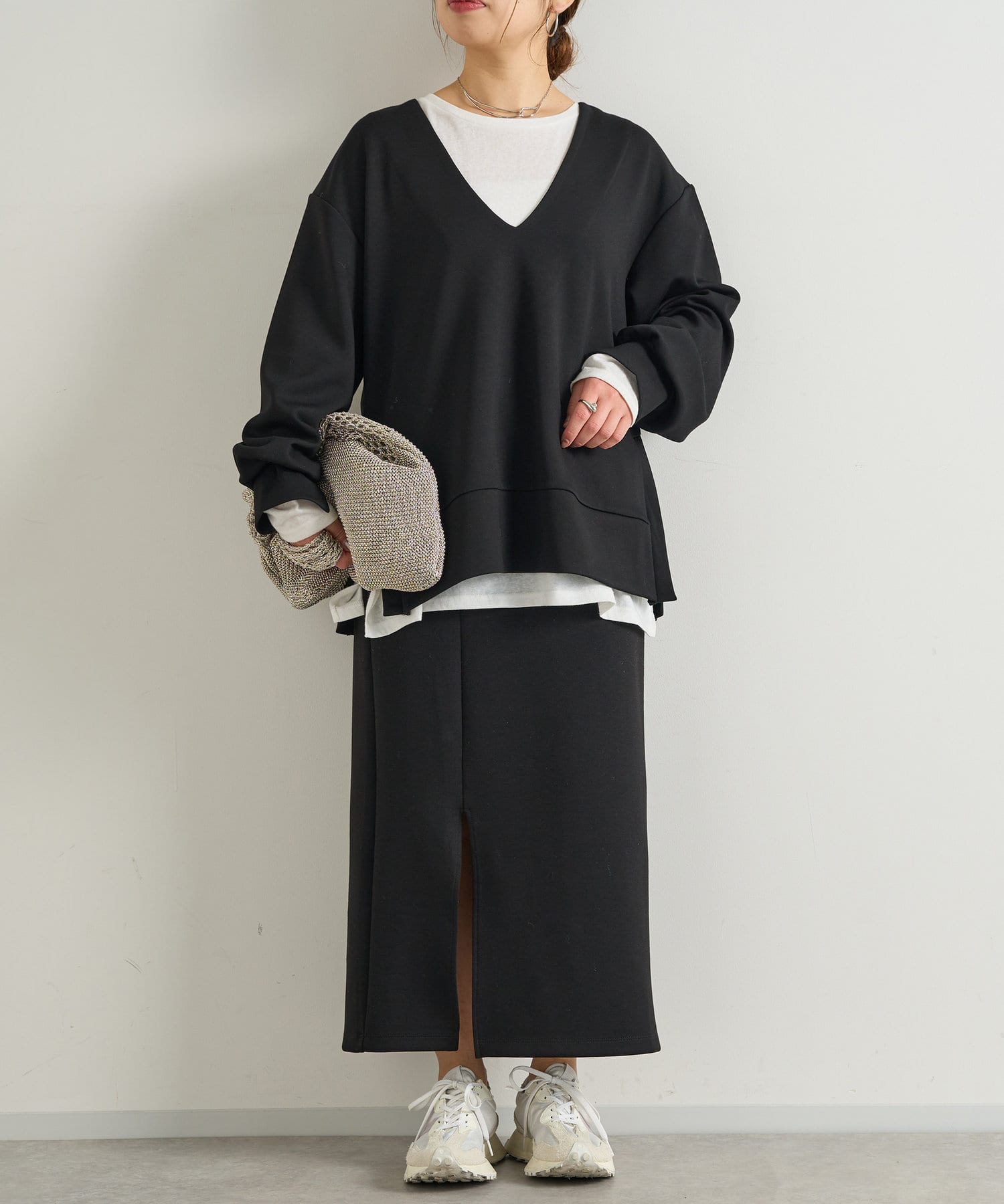・トレンドの深Vネックとサイドスリットでレイヤードしてインナーをチラ見せもオススメ