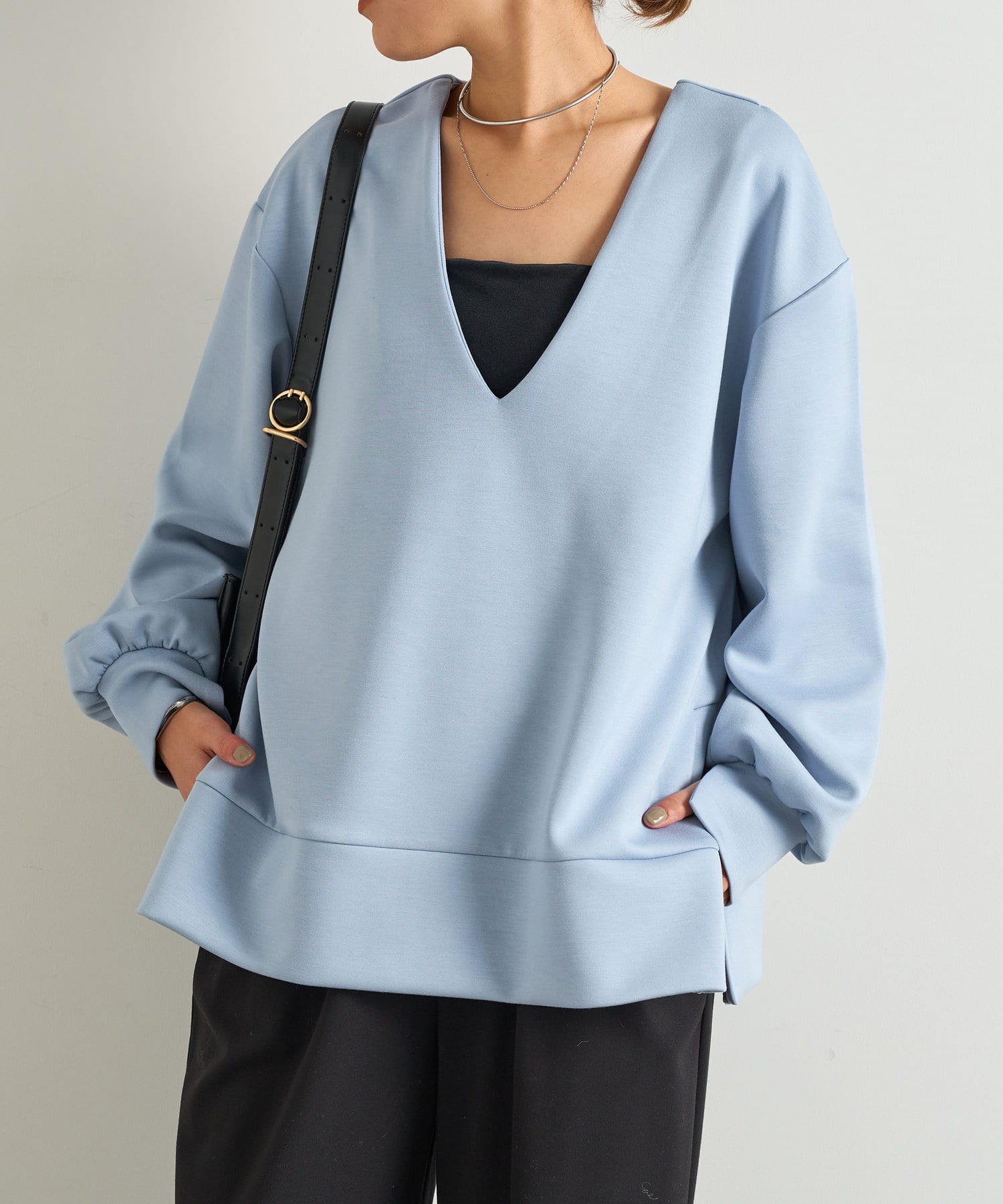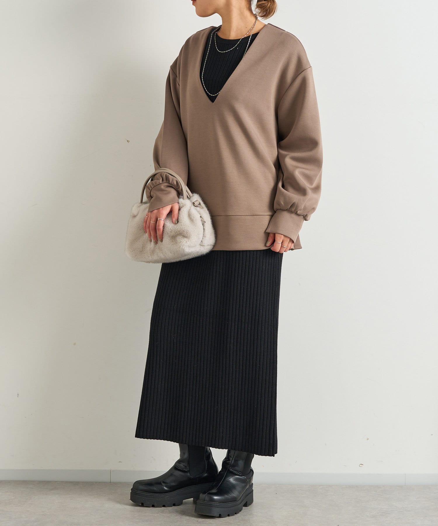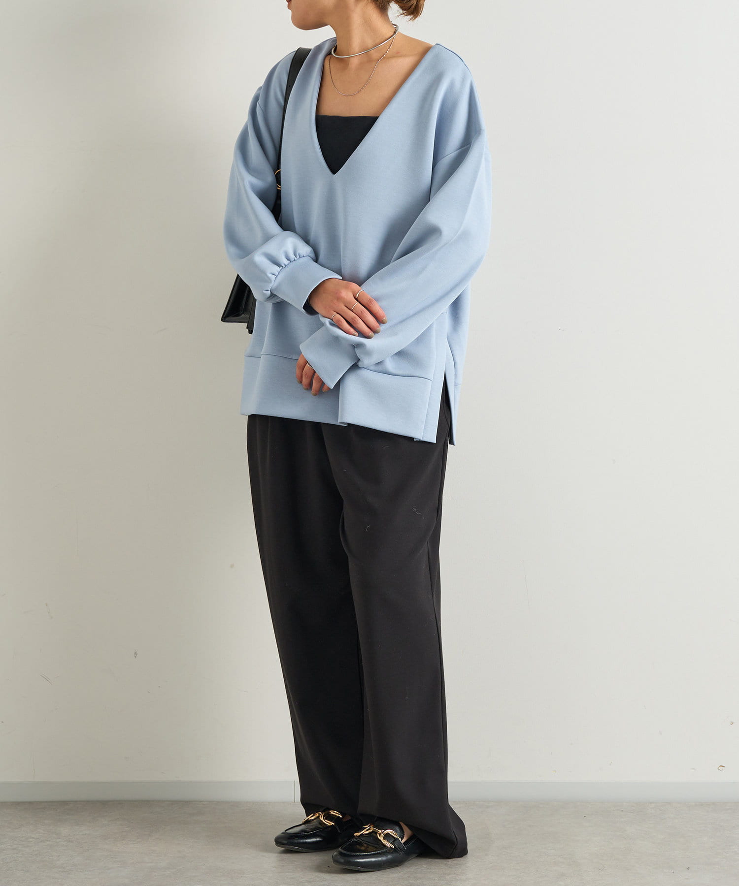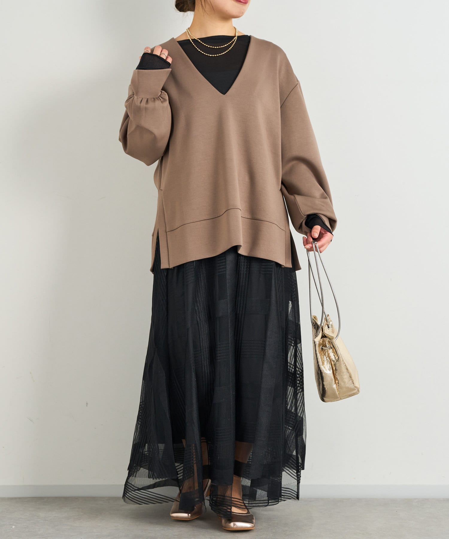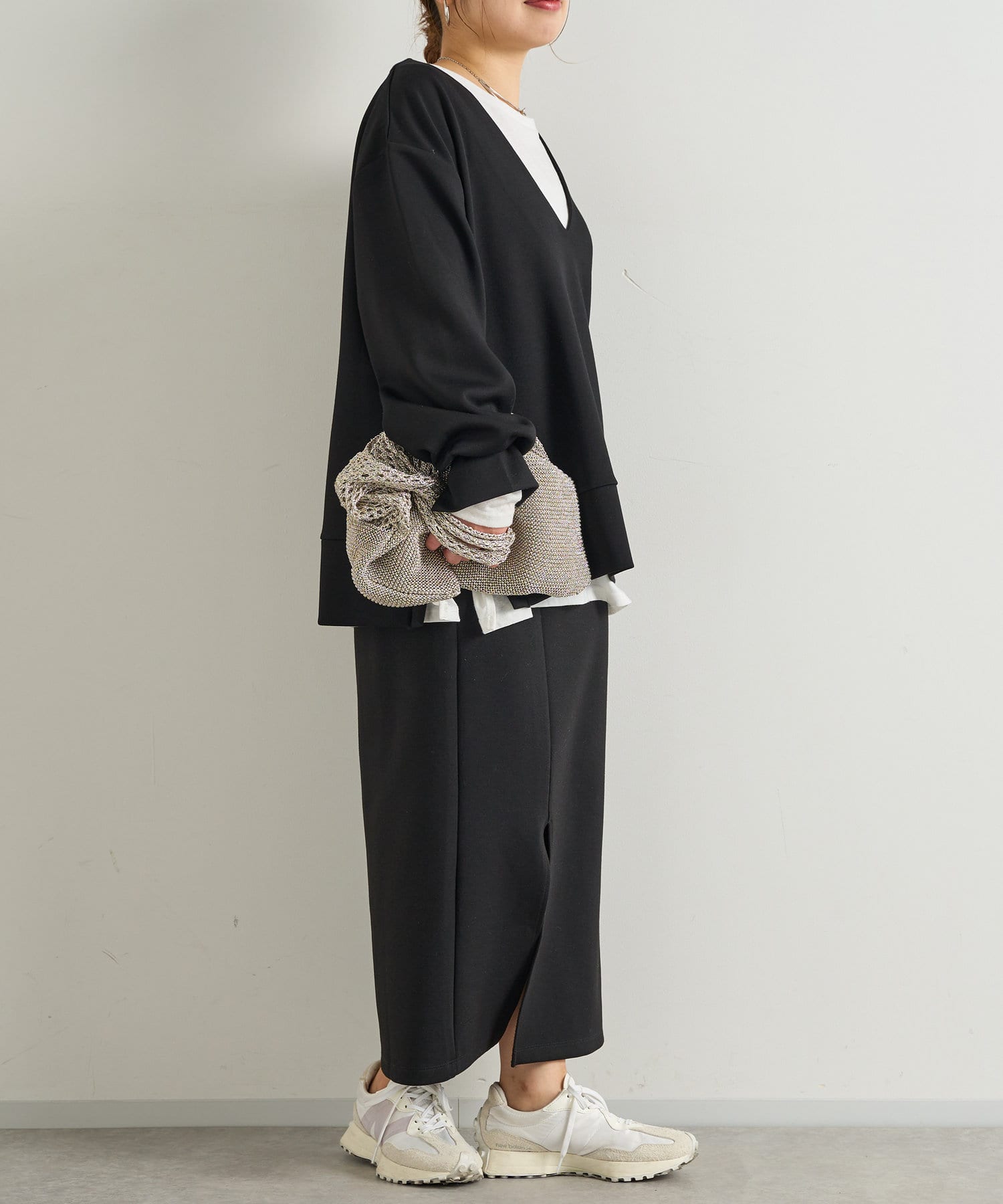 ・トレンドの深Vネックとサイドスリットでレイヤードしてインナーをチラ見せもオススメ
