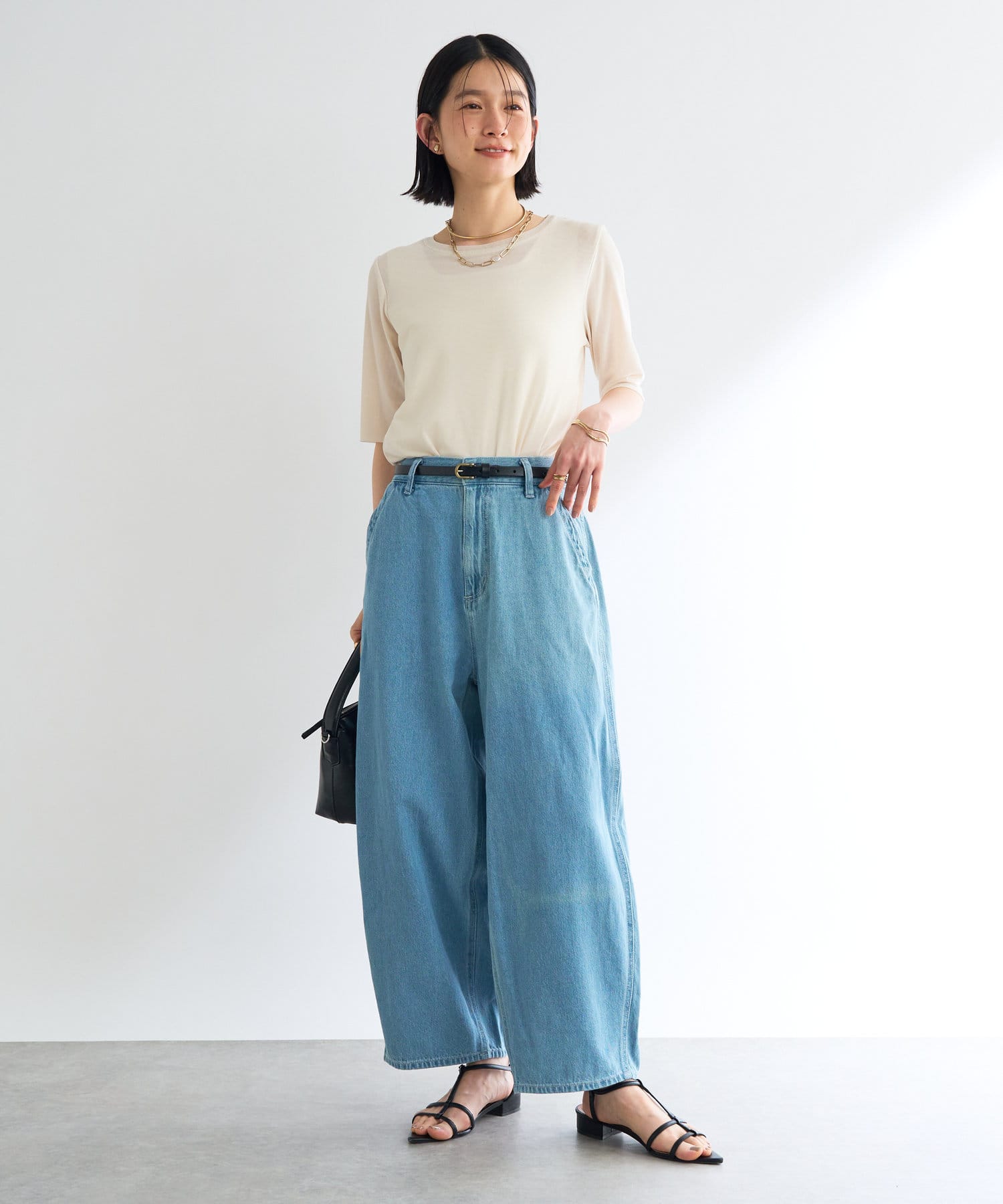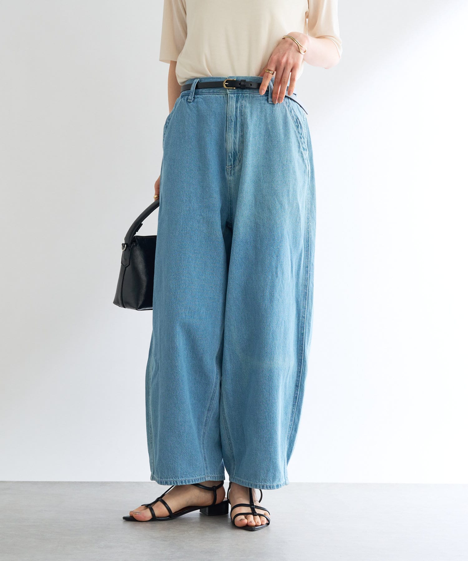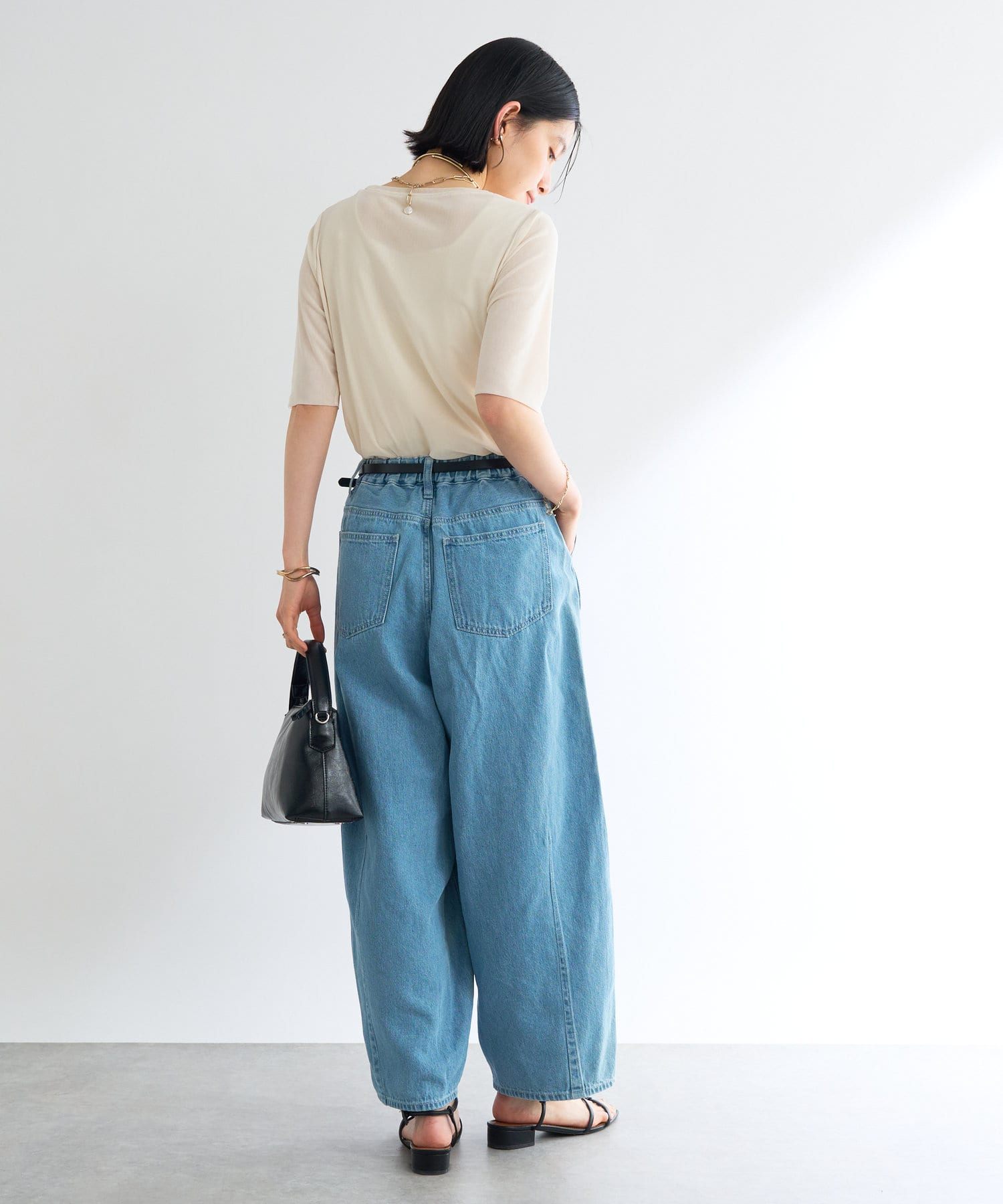 ゆったりとしたシルエットで、腰には丸みをつけ