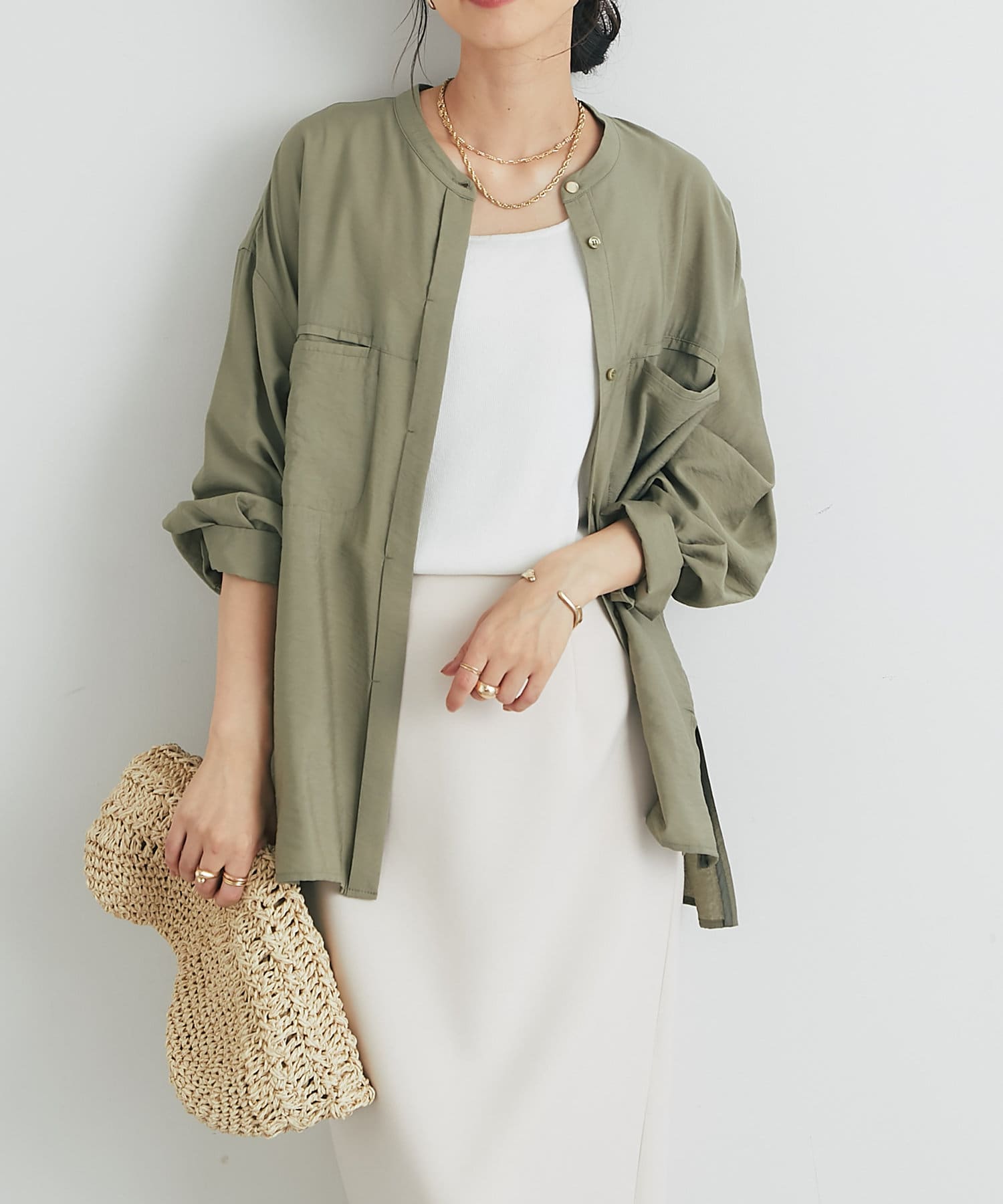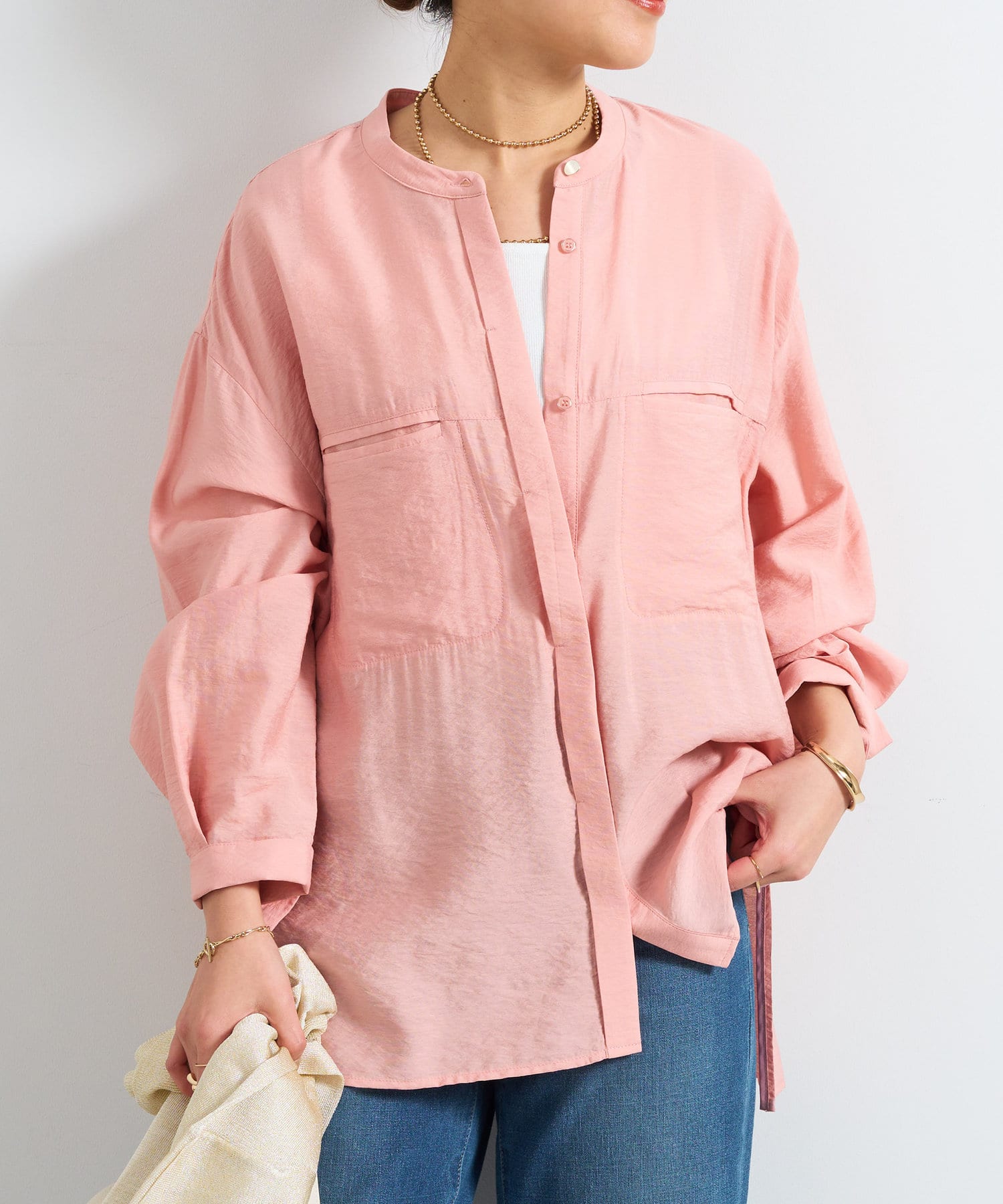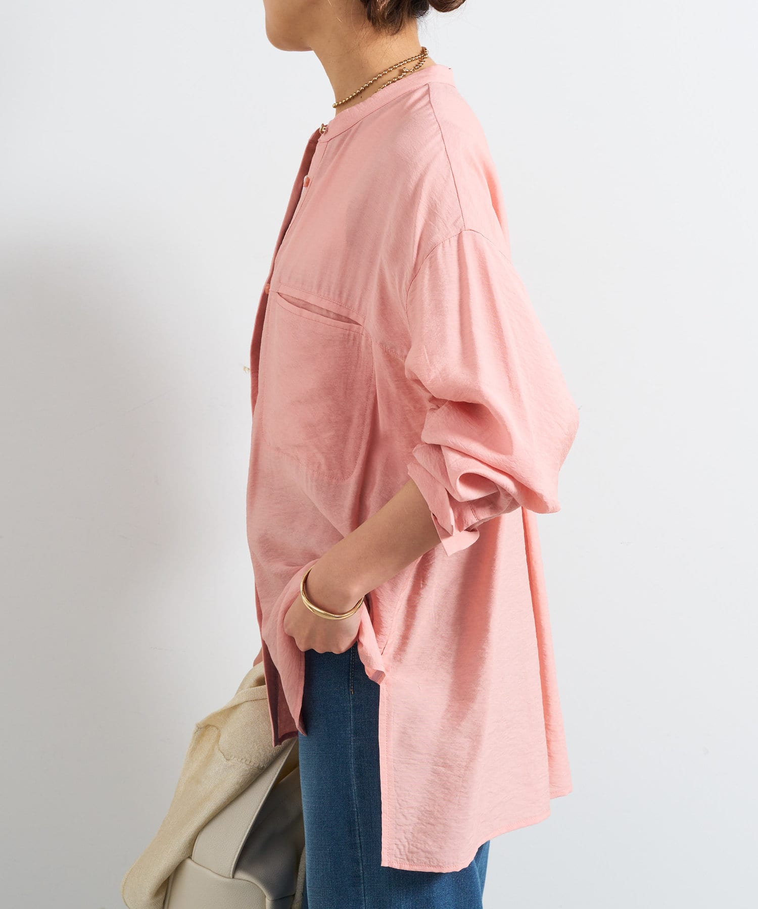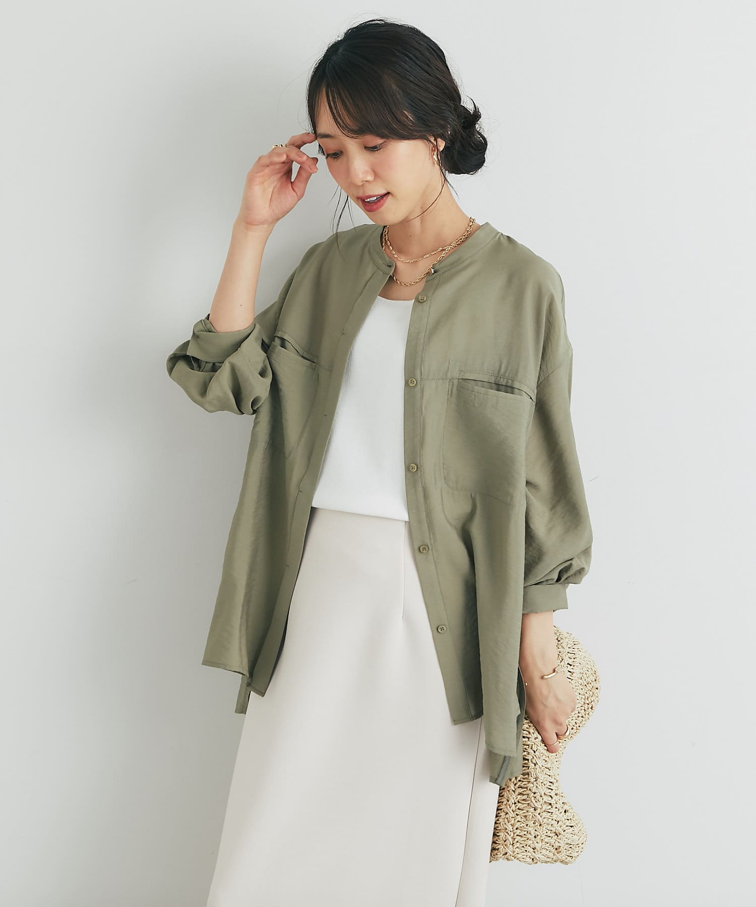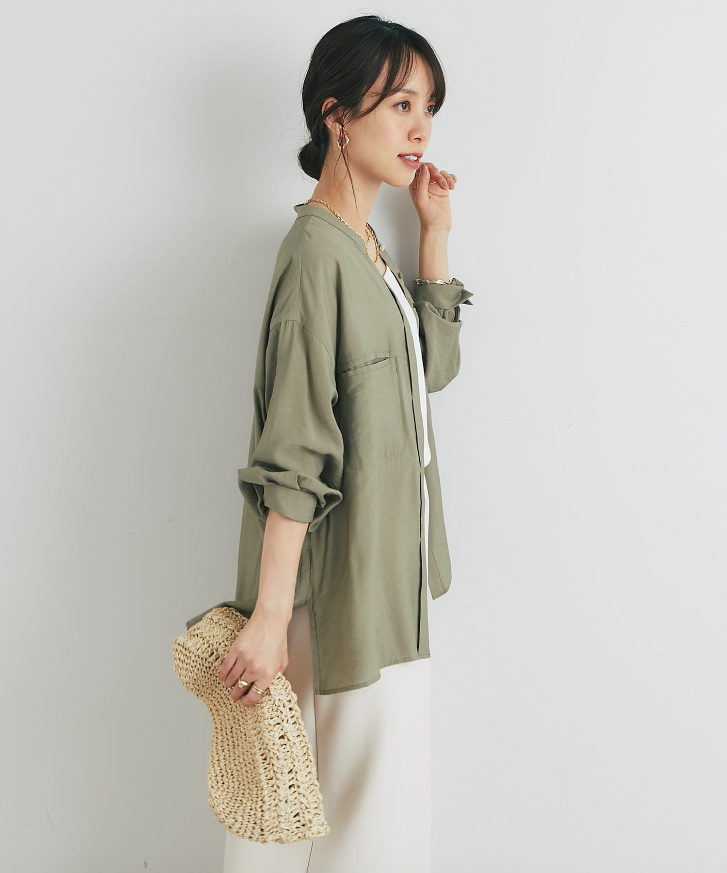 程良くゆとりのあるシルエットのバンドカラーシャツ