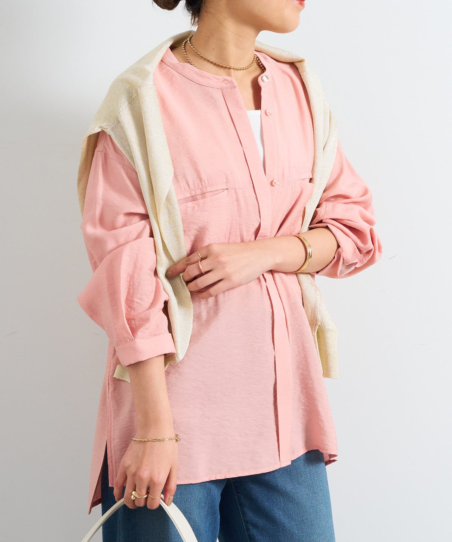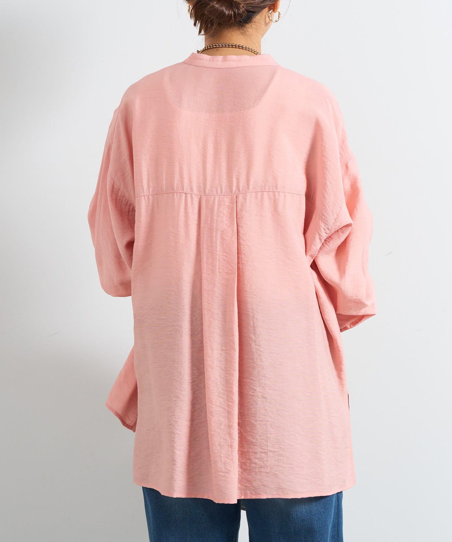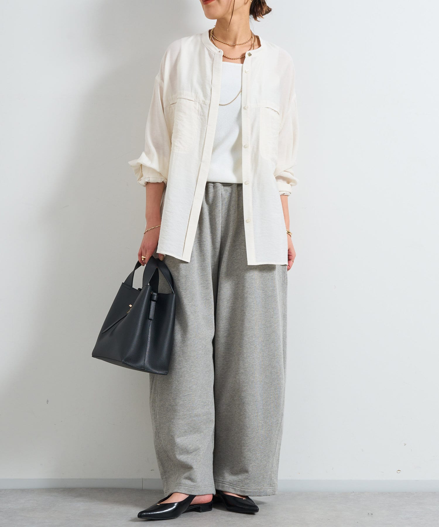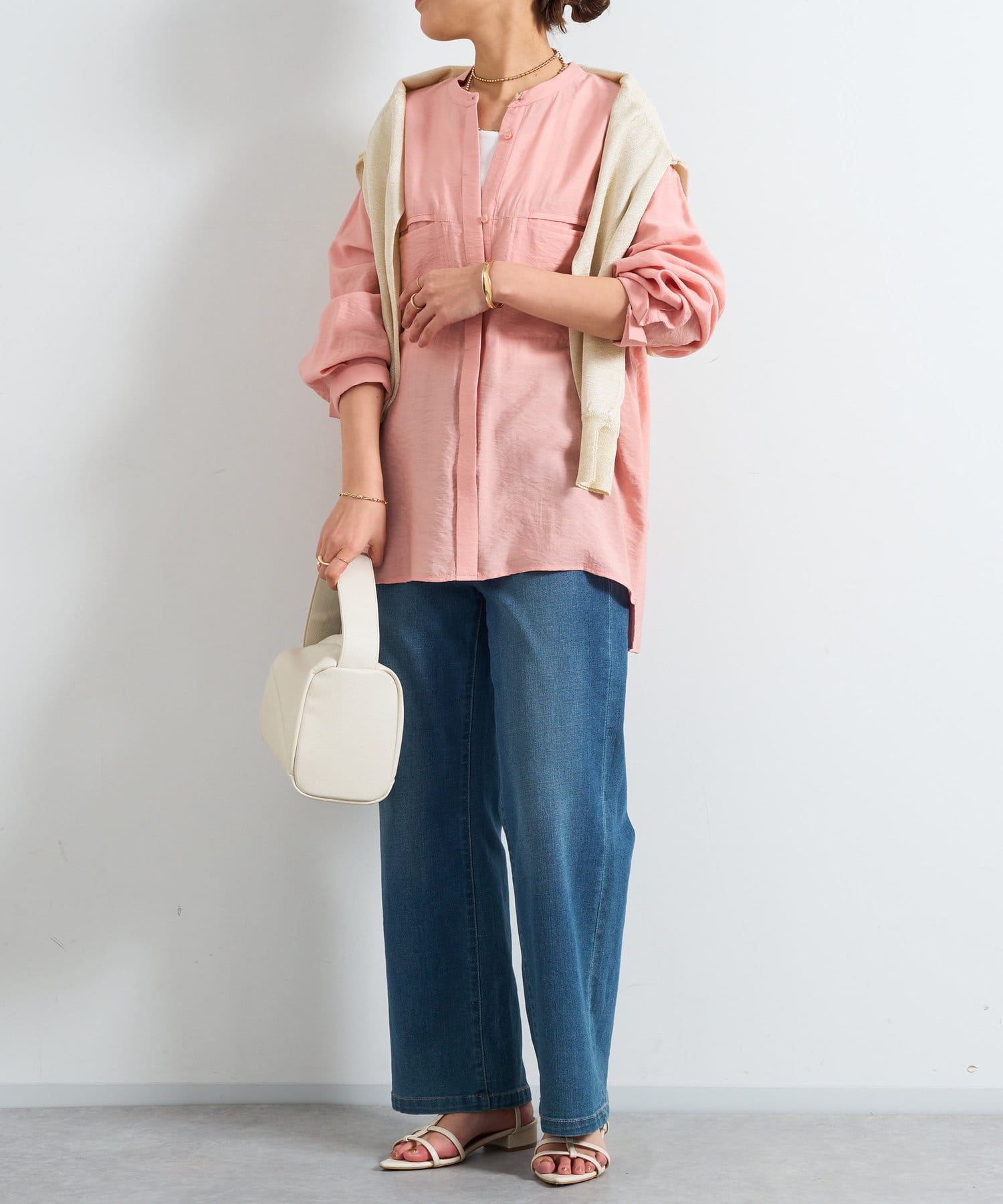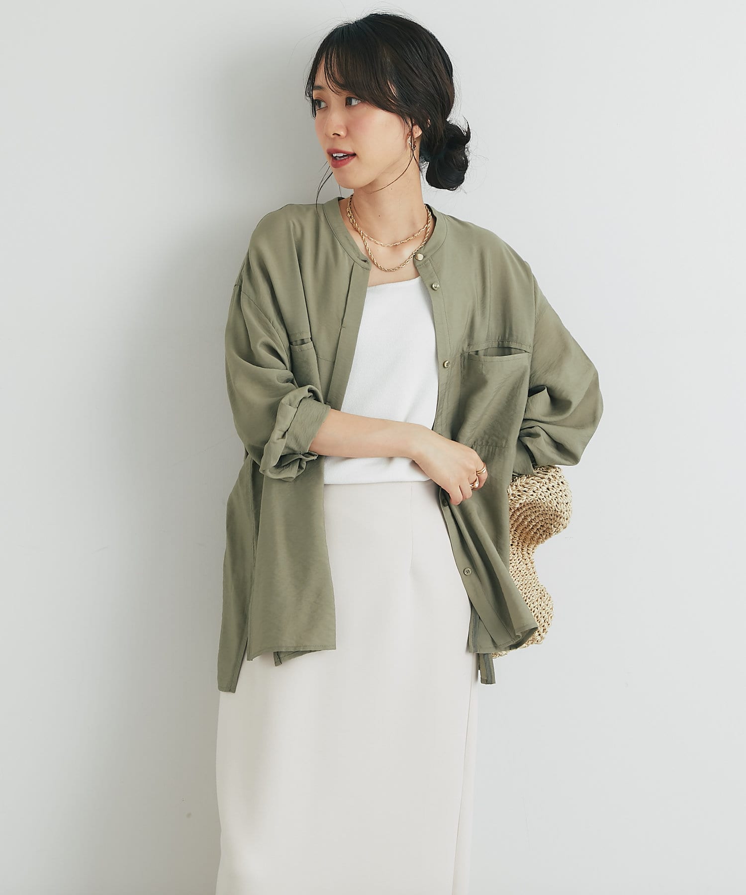 程良くゆとりのあるシルエットのバンドカラーシャツ