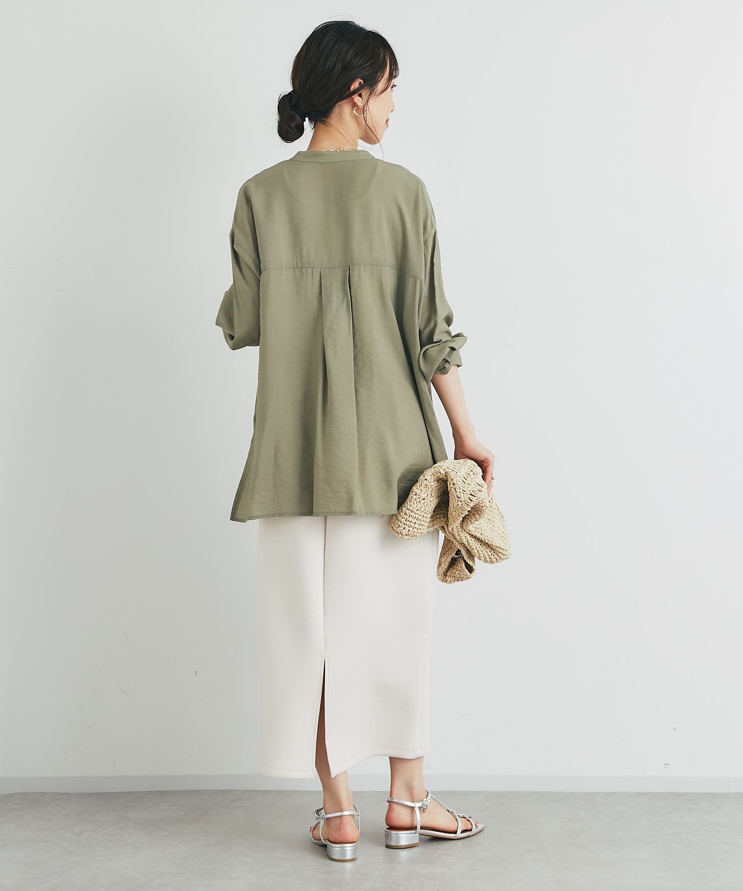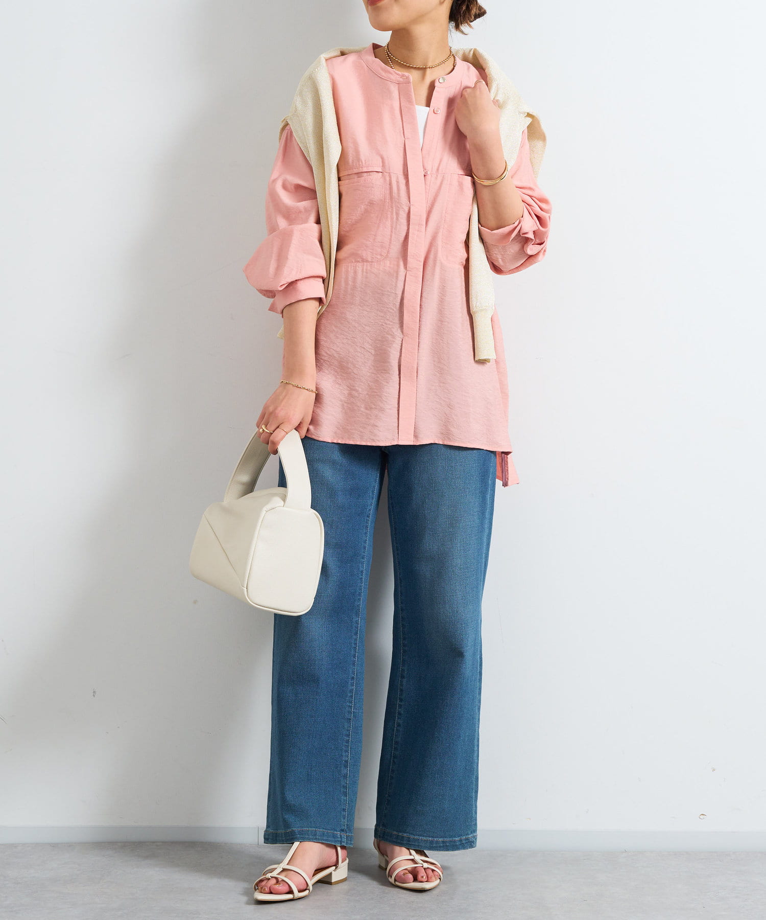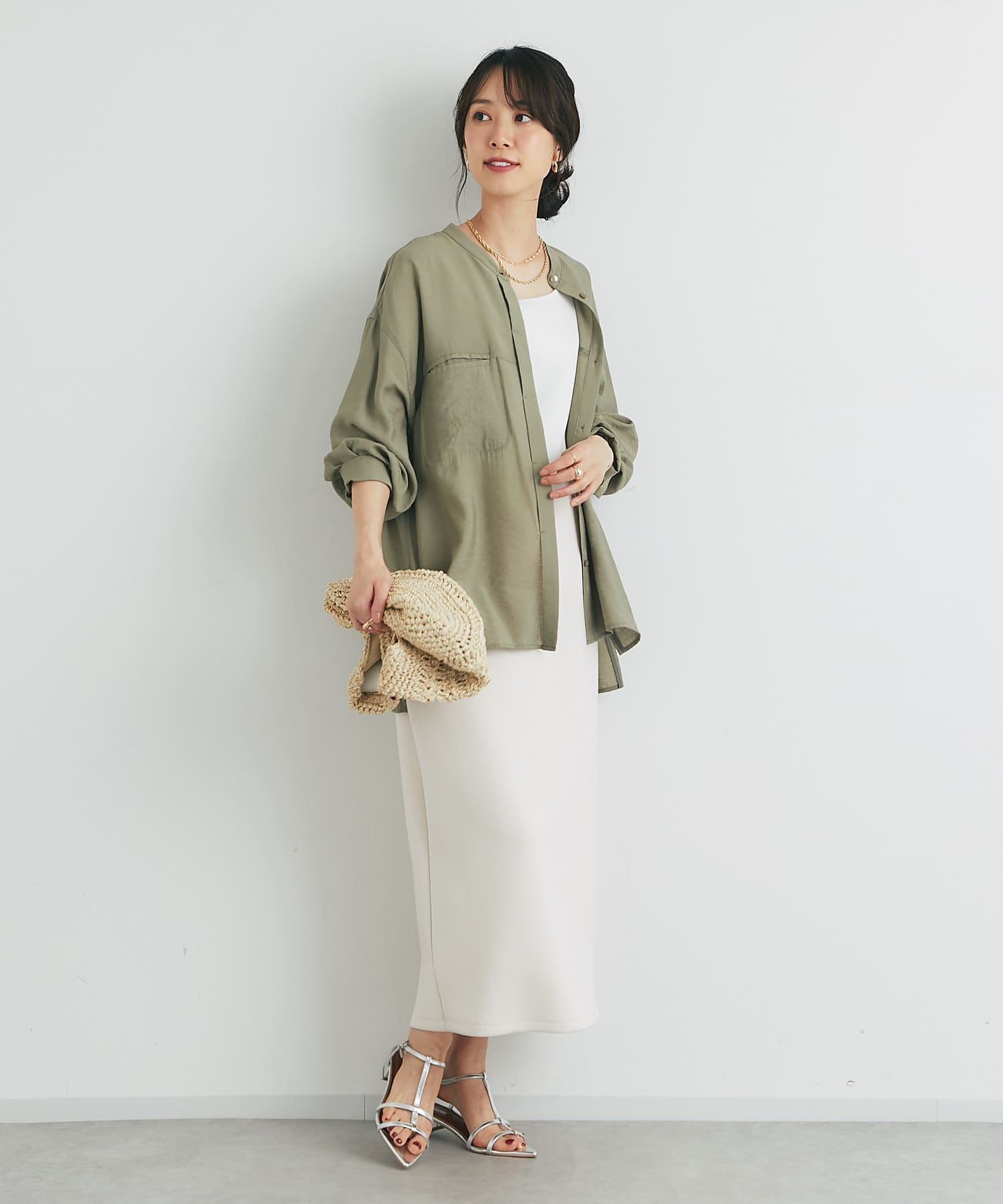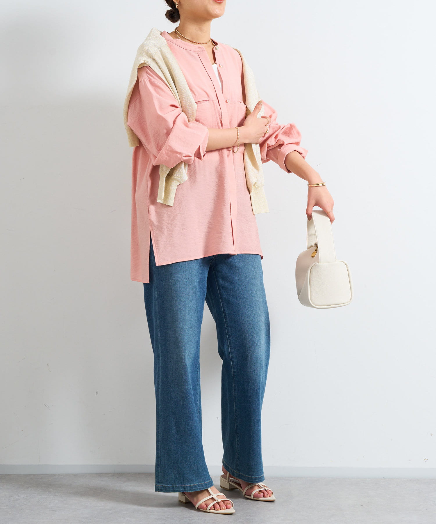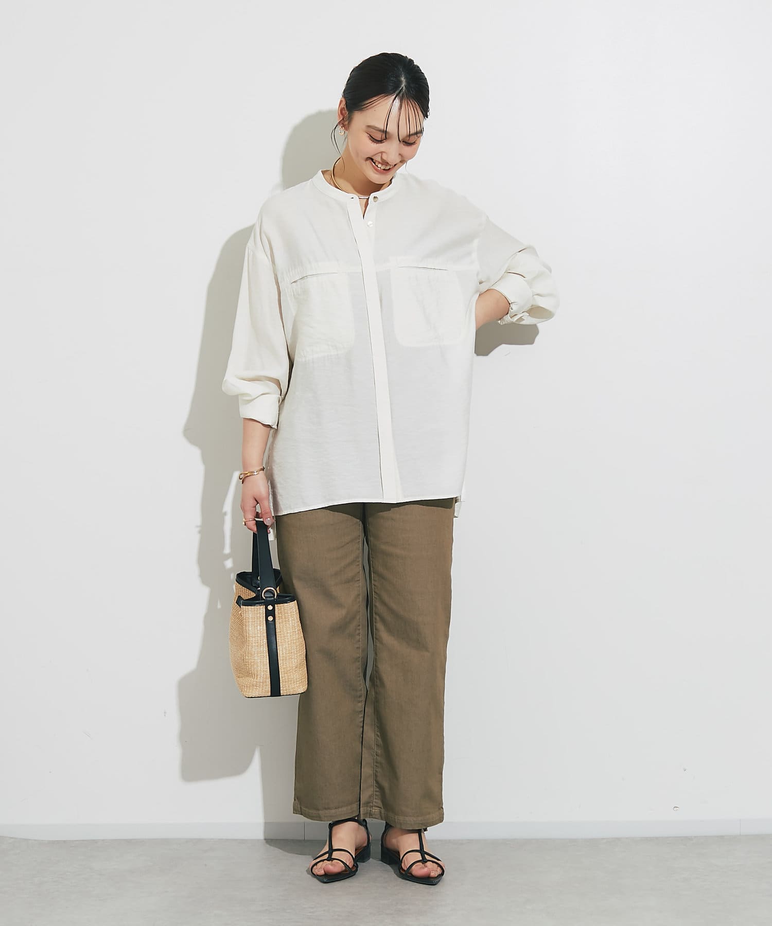 程良くゆとりのあるシルエットのバンドカラーシャツ