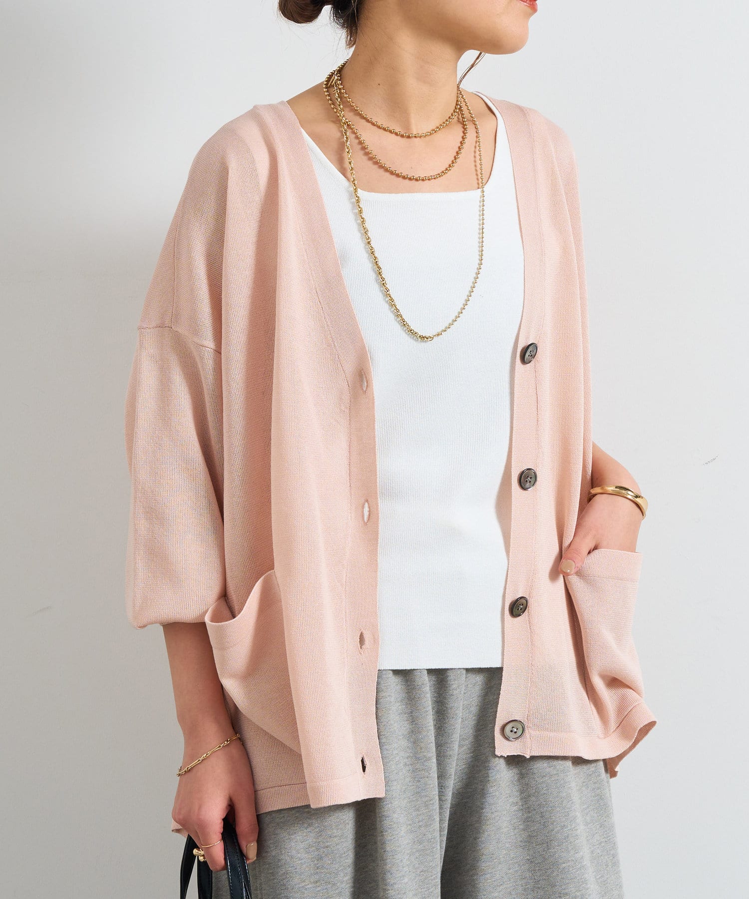 ・ポケットデザインでシンプルコーデを格上げ“選べるボタン多機能ポケットニットカーディガン