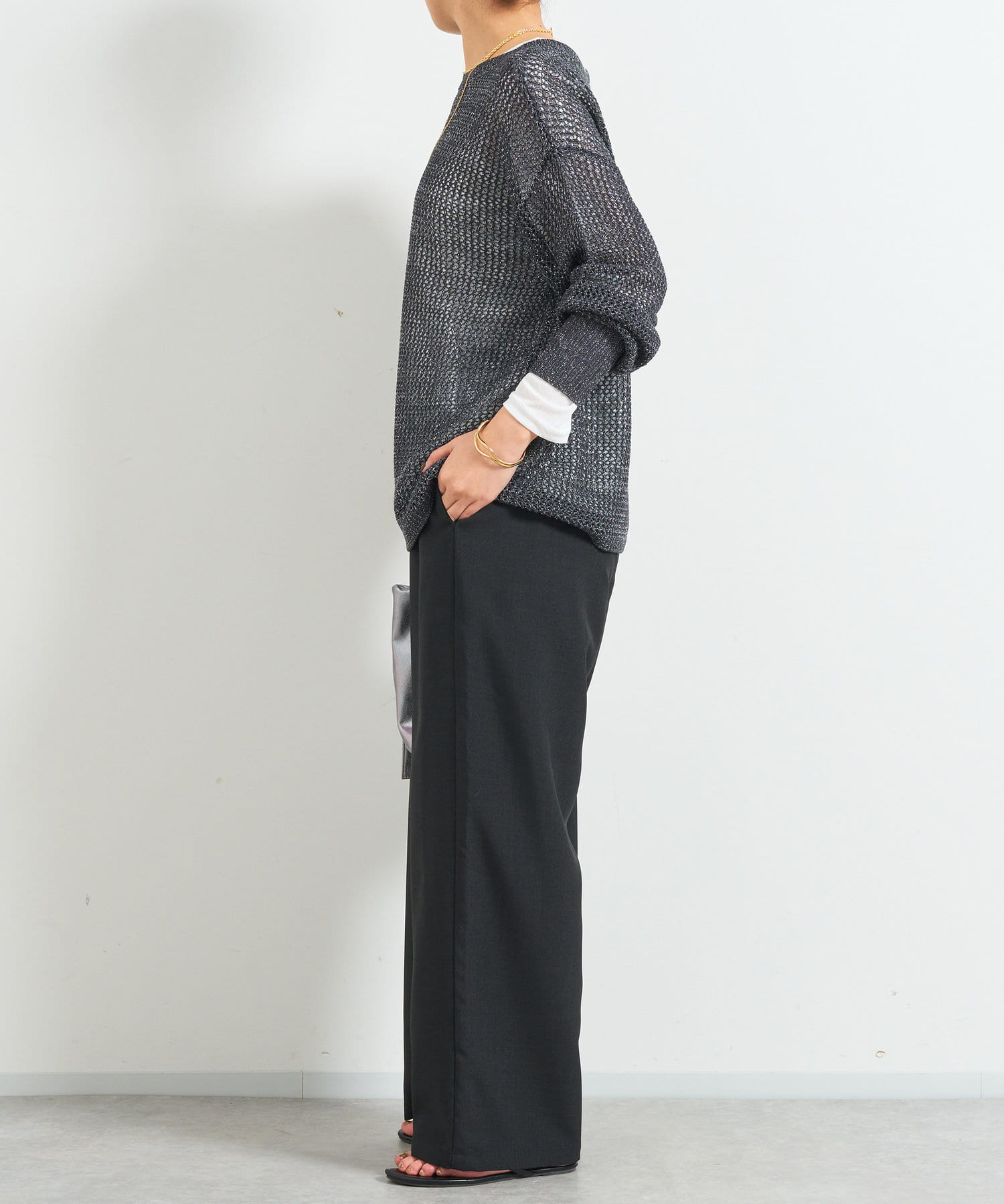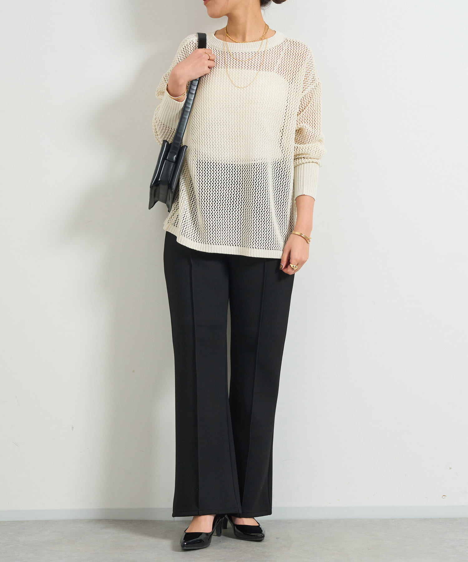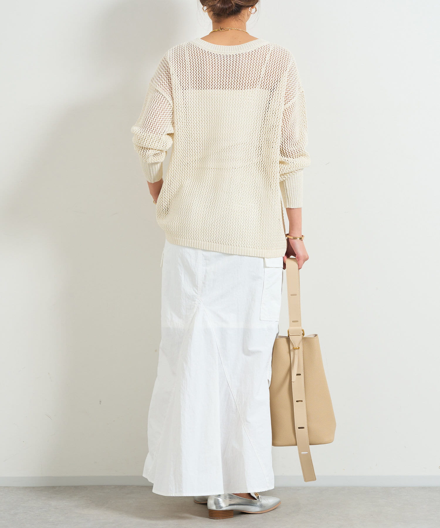 ややざっくりとした透かし編みがスタイリングにこなれ感をプラス