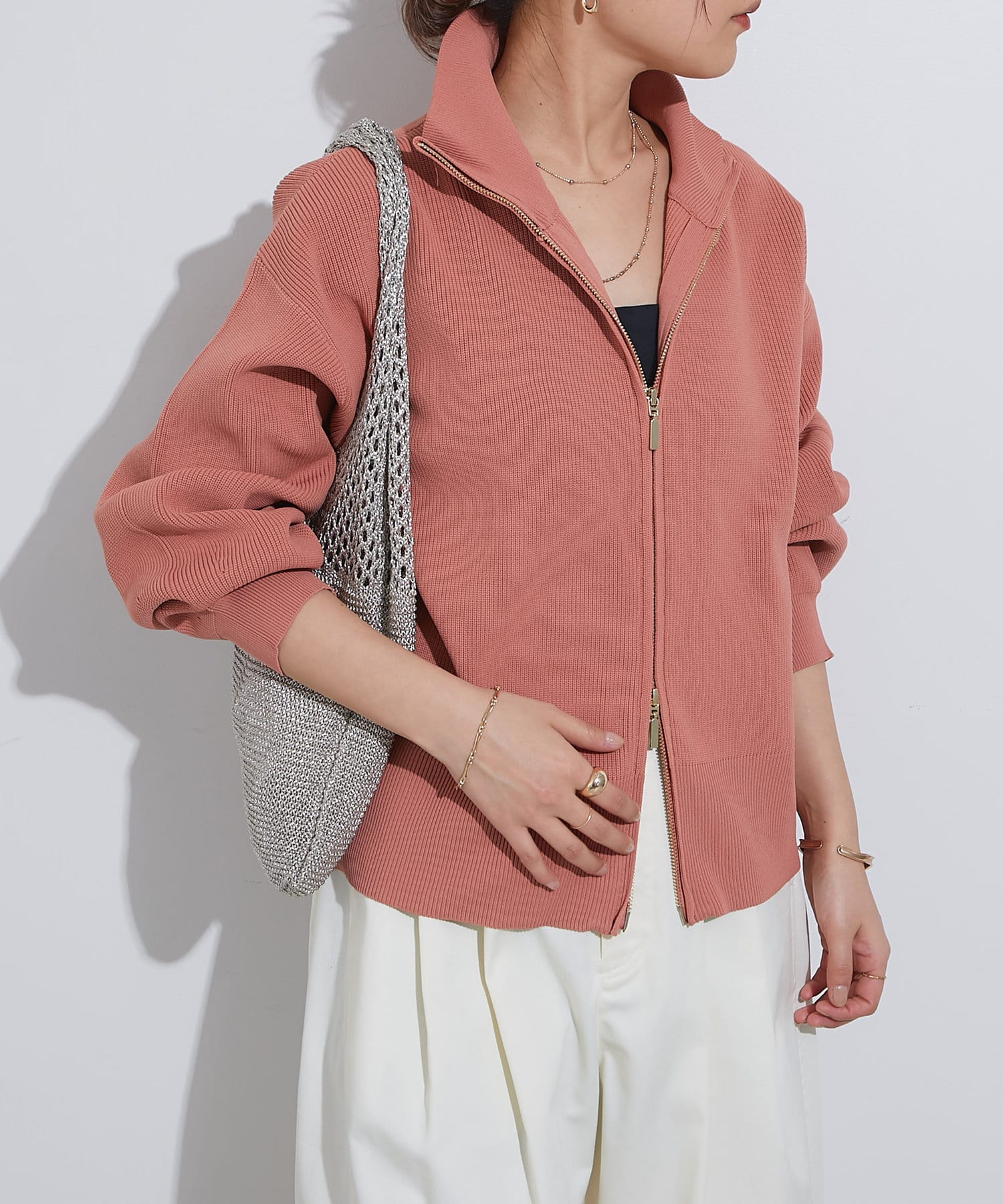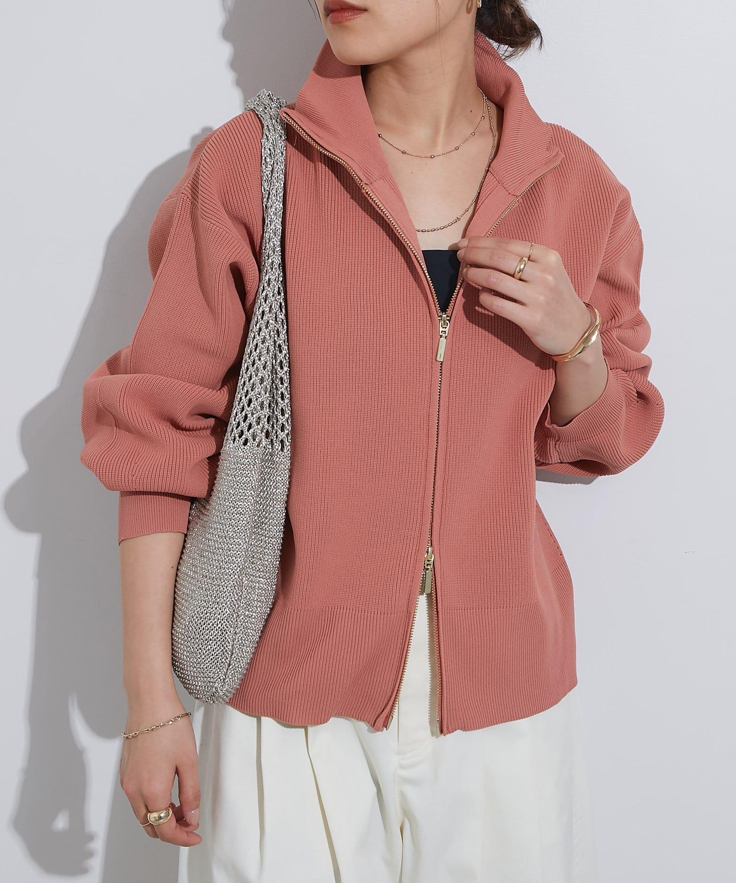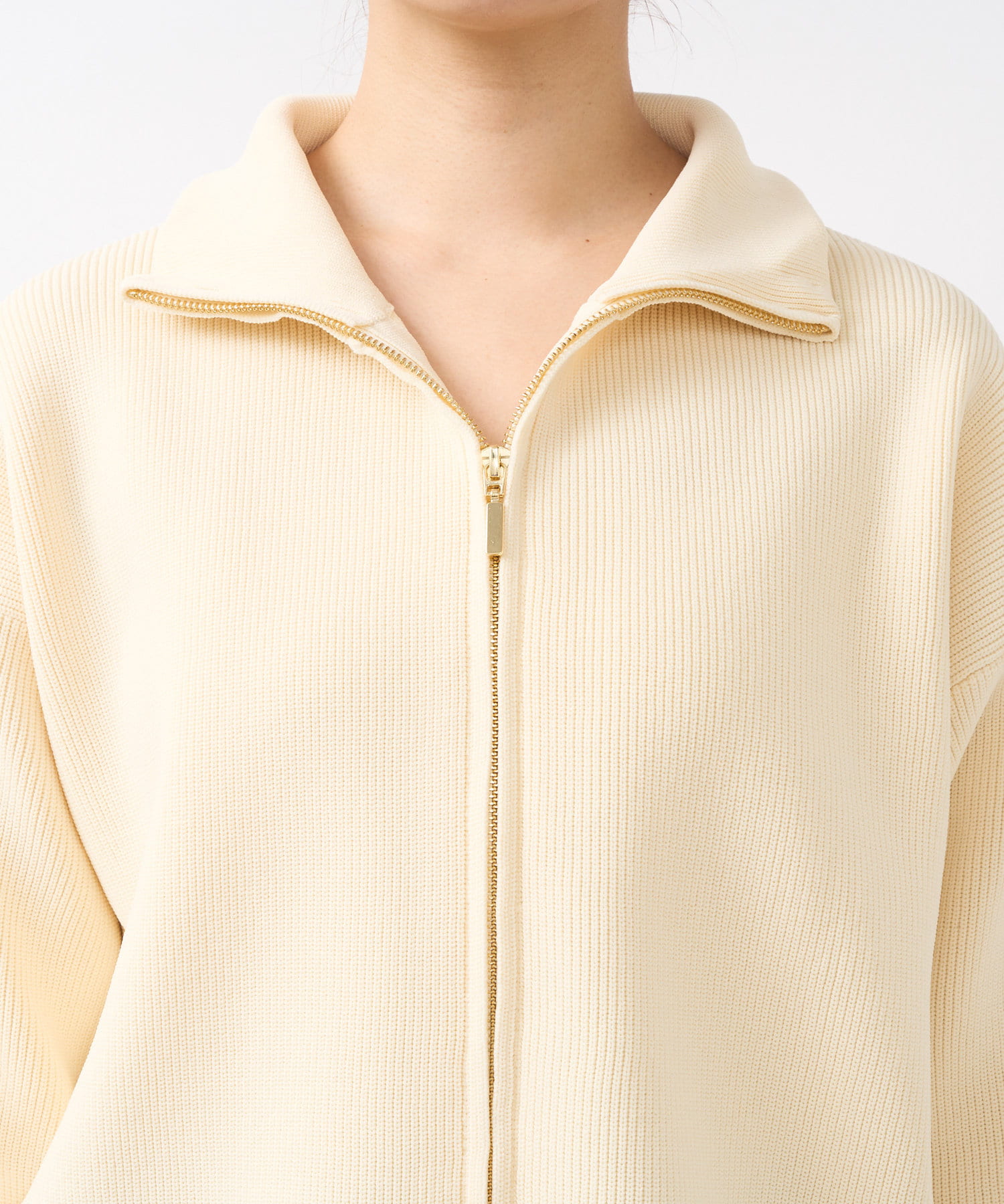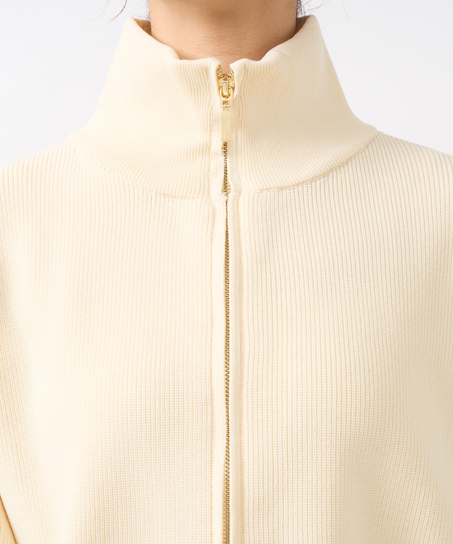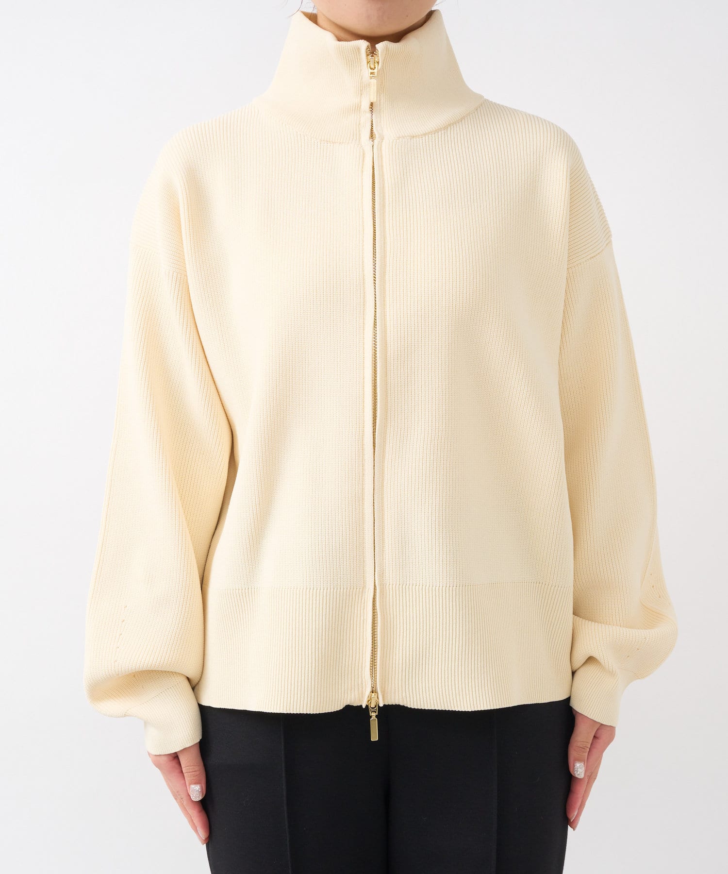 ・ハイネックとゴールドのジッパーがアクセントとなり、さりげない上品さをプラス。