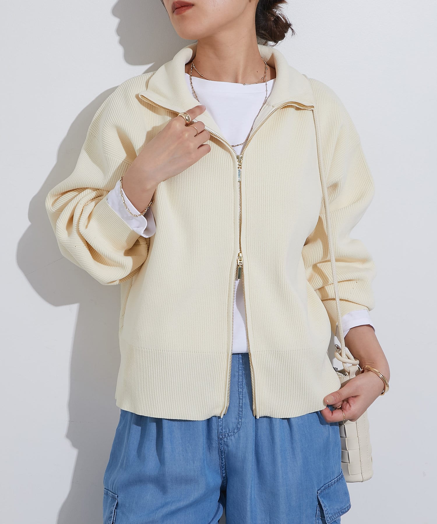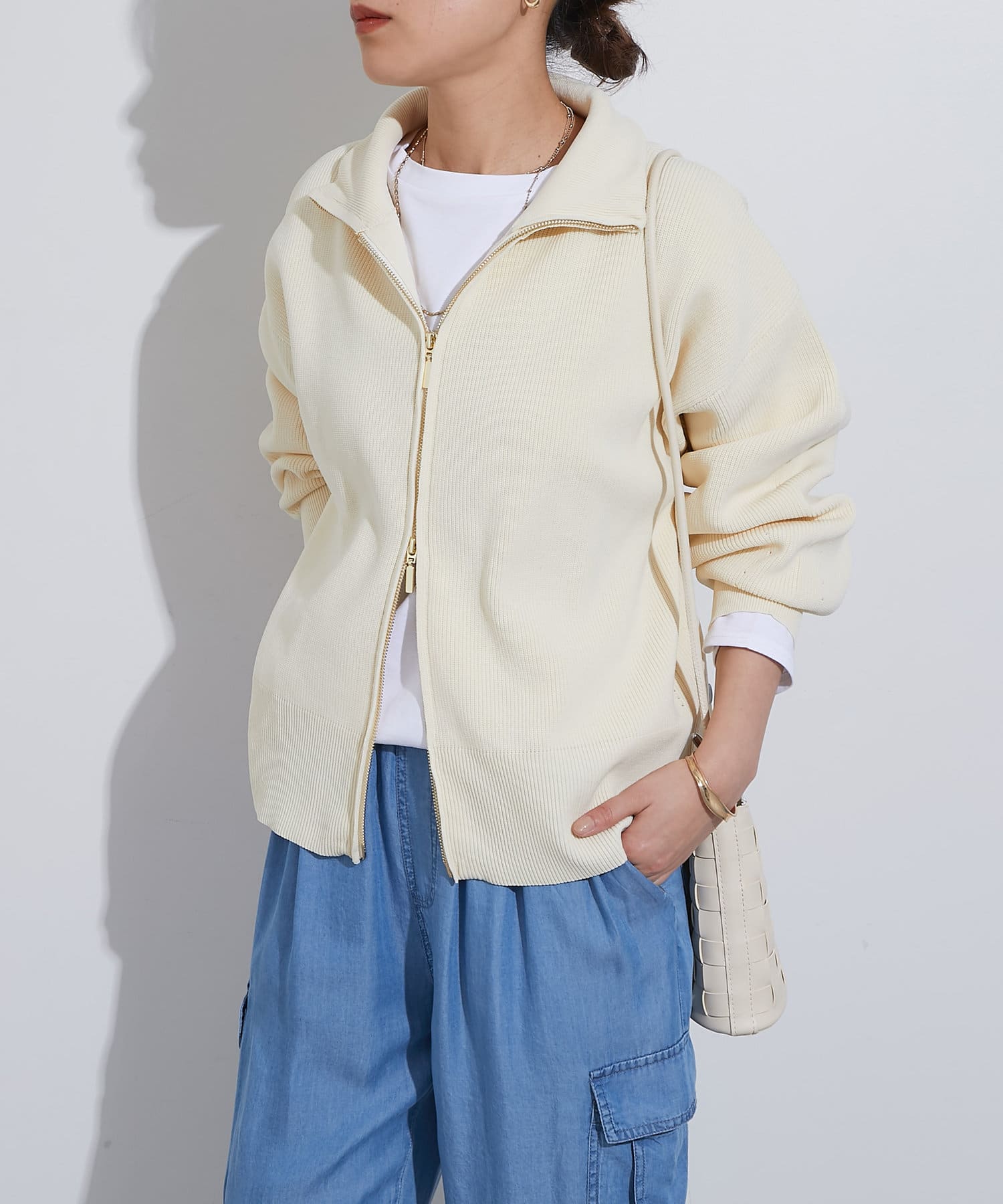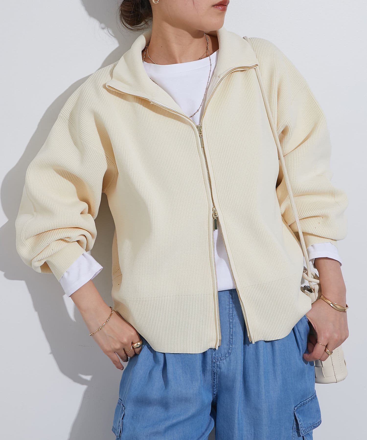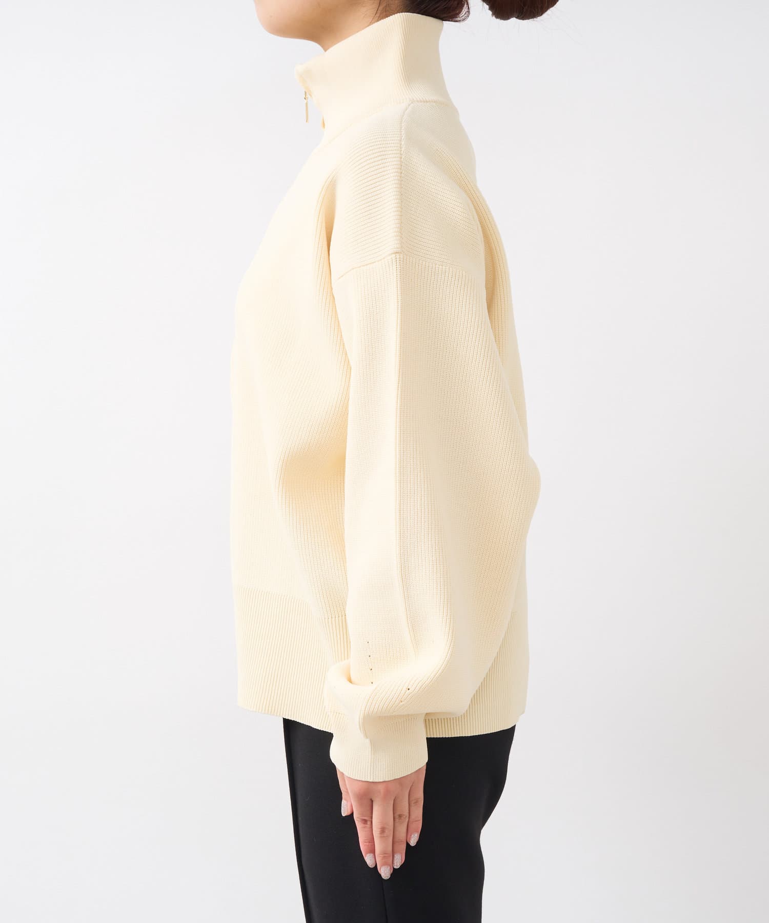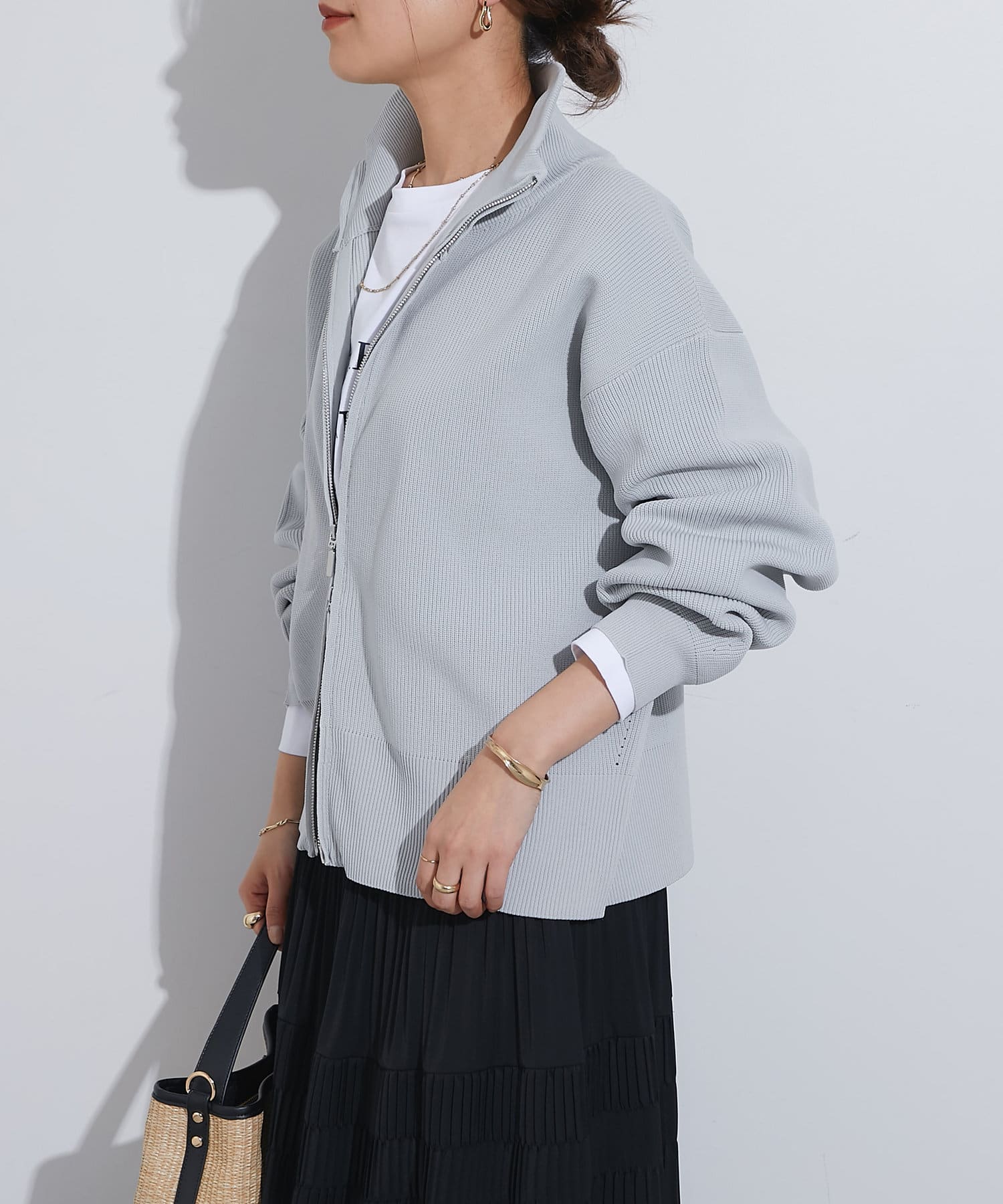 ・ハイネックとゴールドのジッパーがアクセントとなり、さりげない上品さをプラス。
