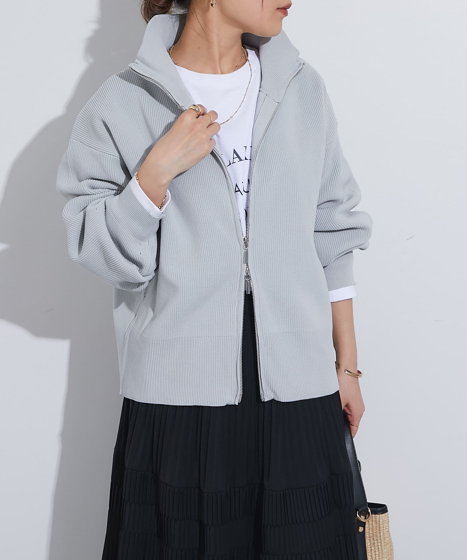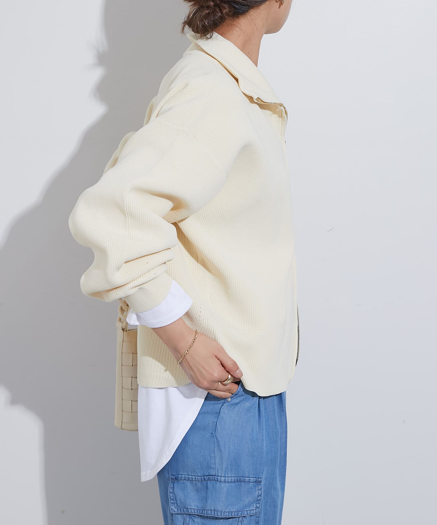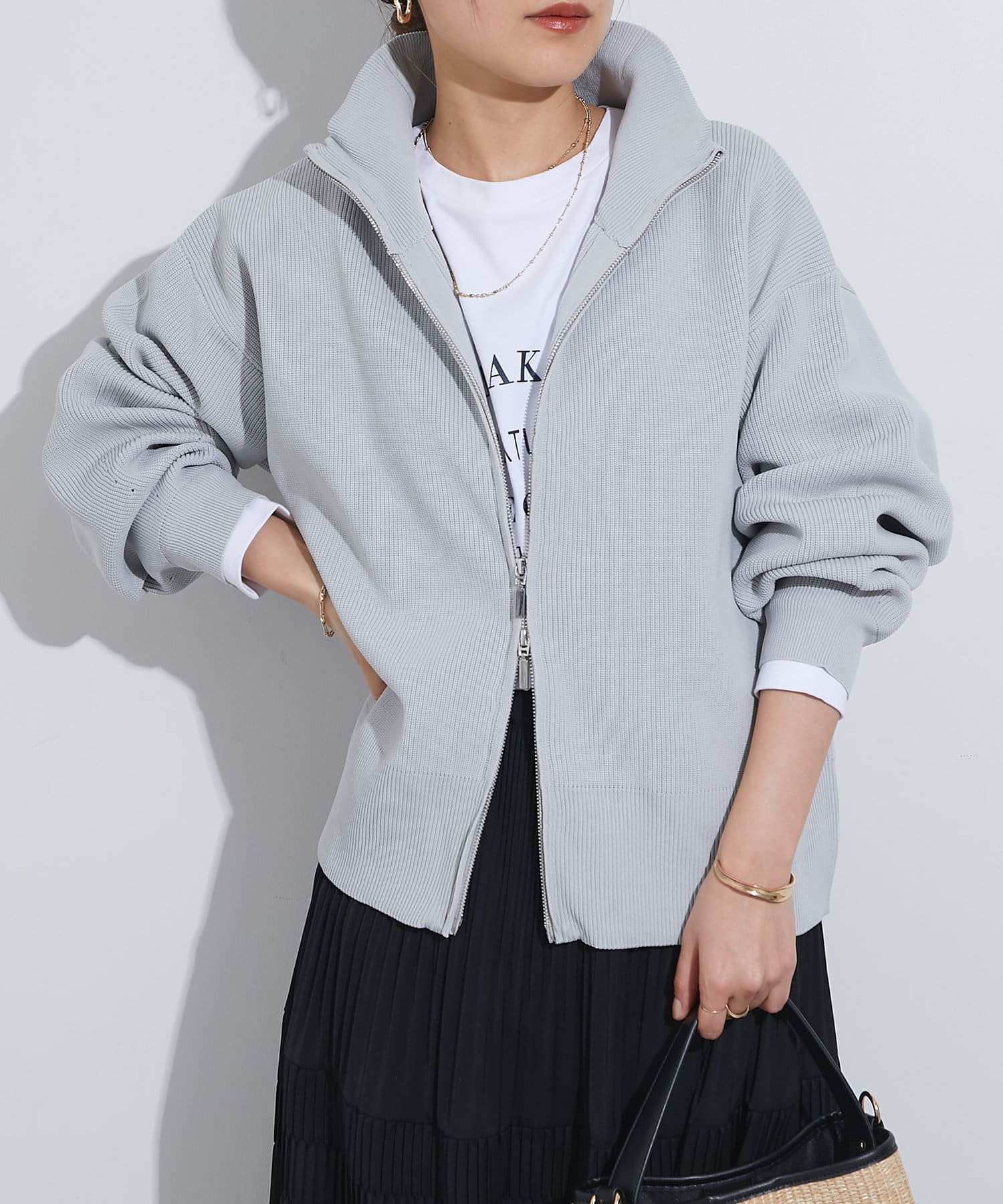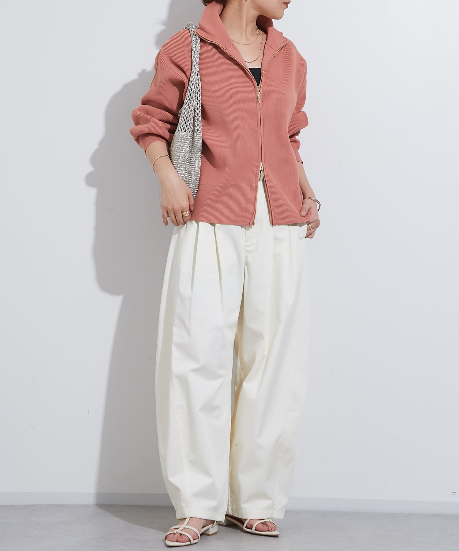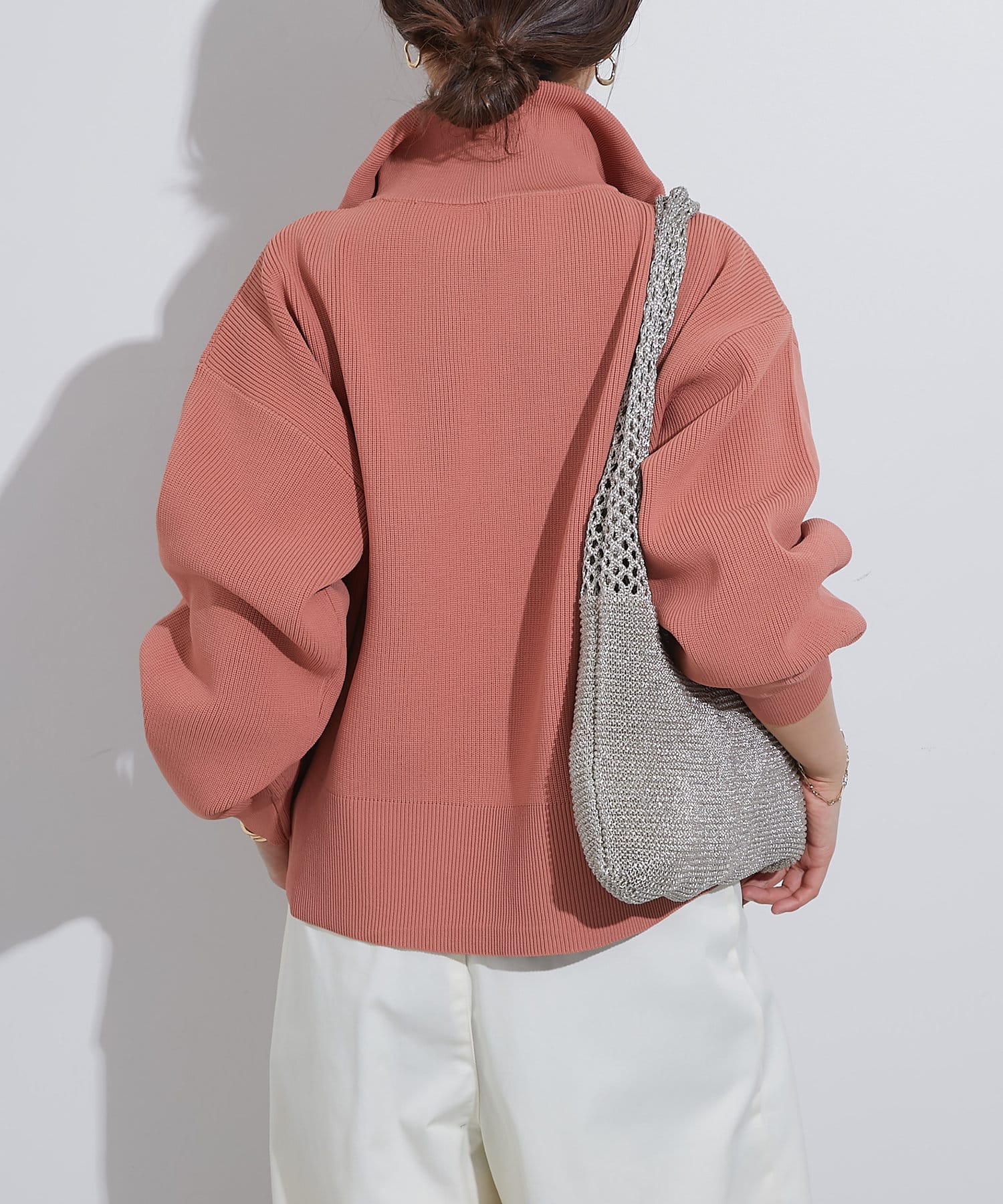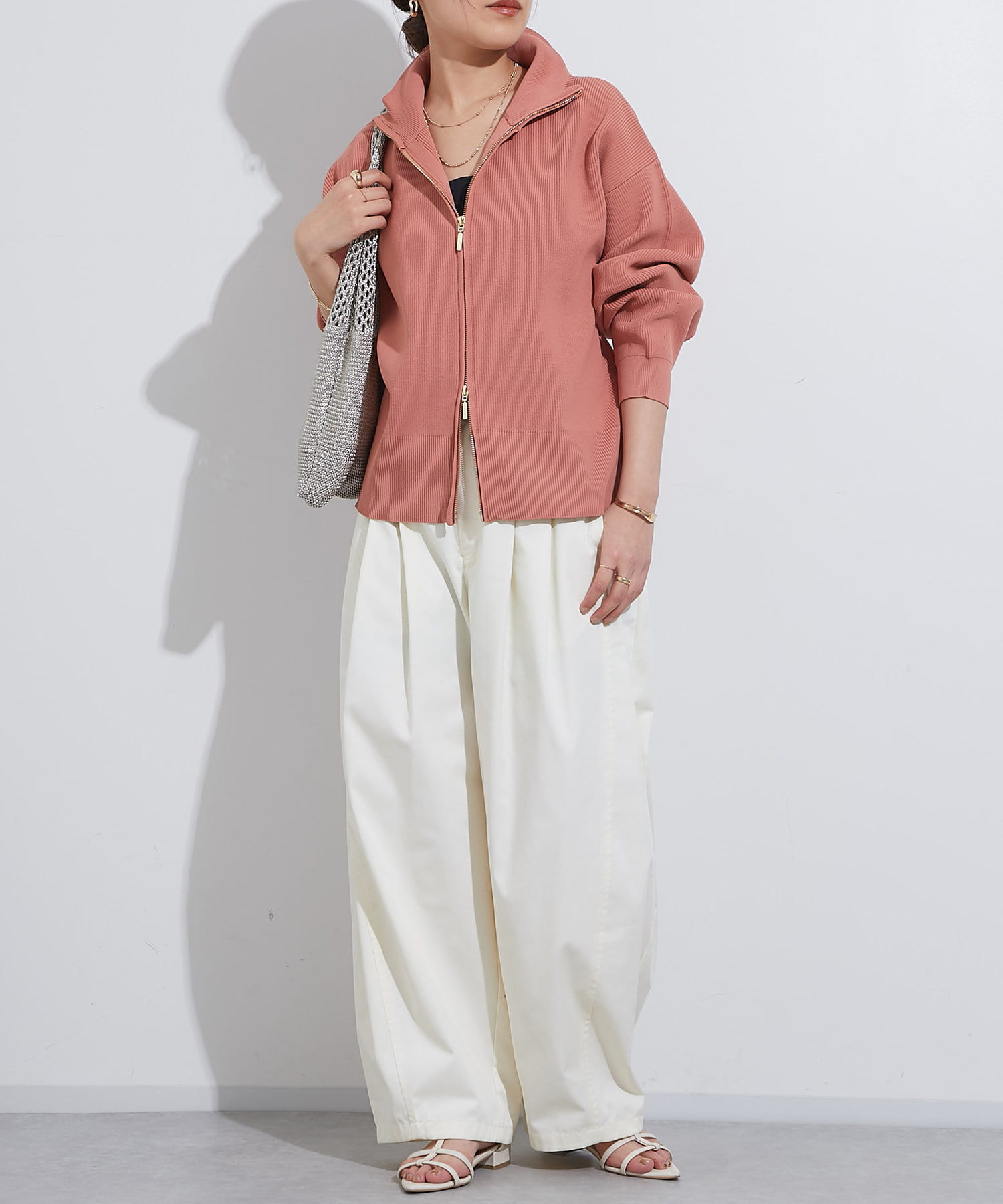 ・ハイネックとゴールドのジッパーがアクセントとなり、さりげない上品さをプラス。