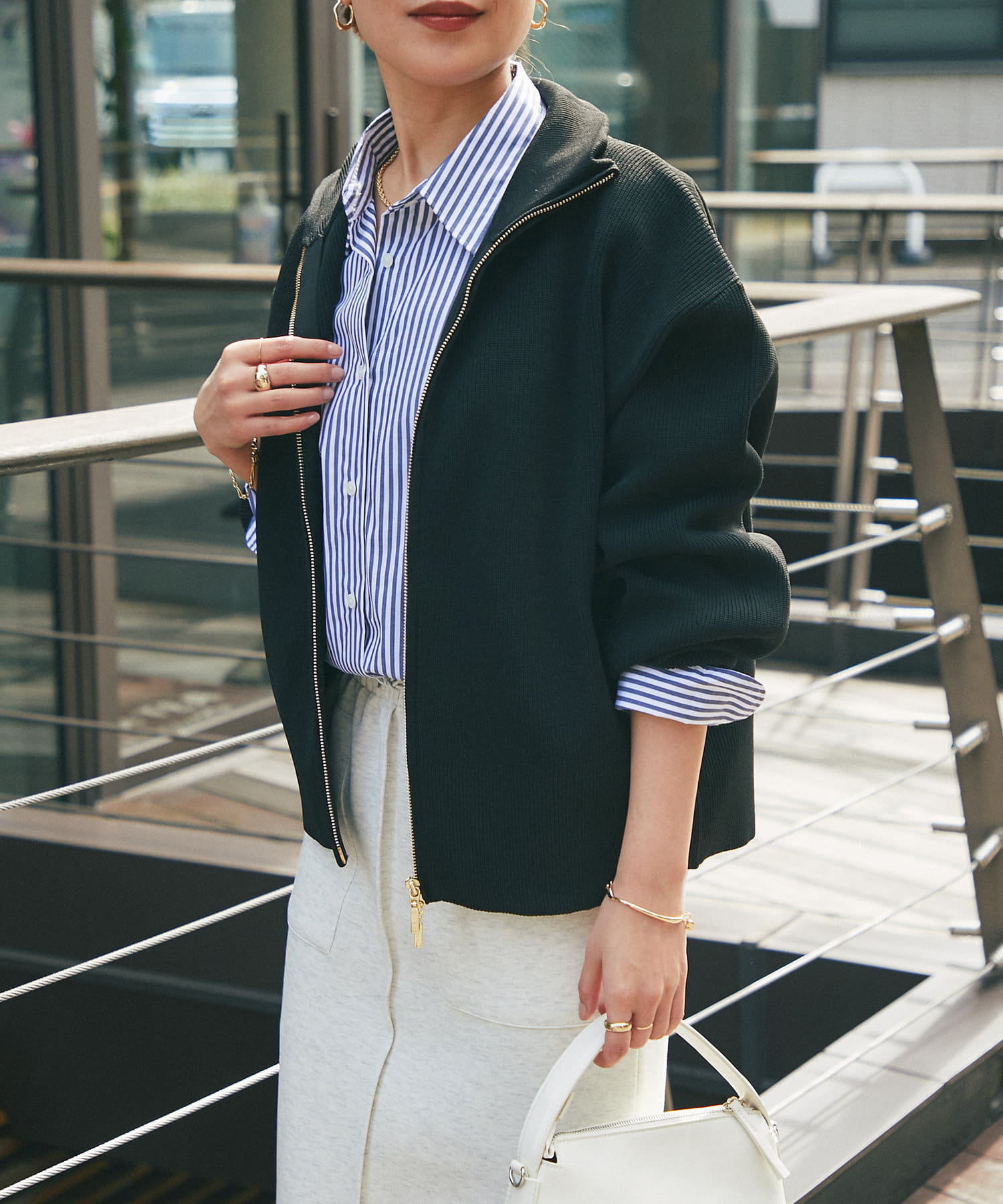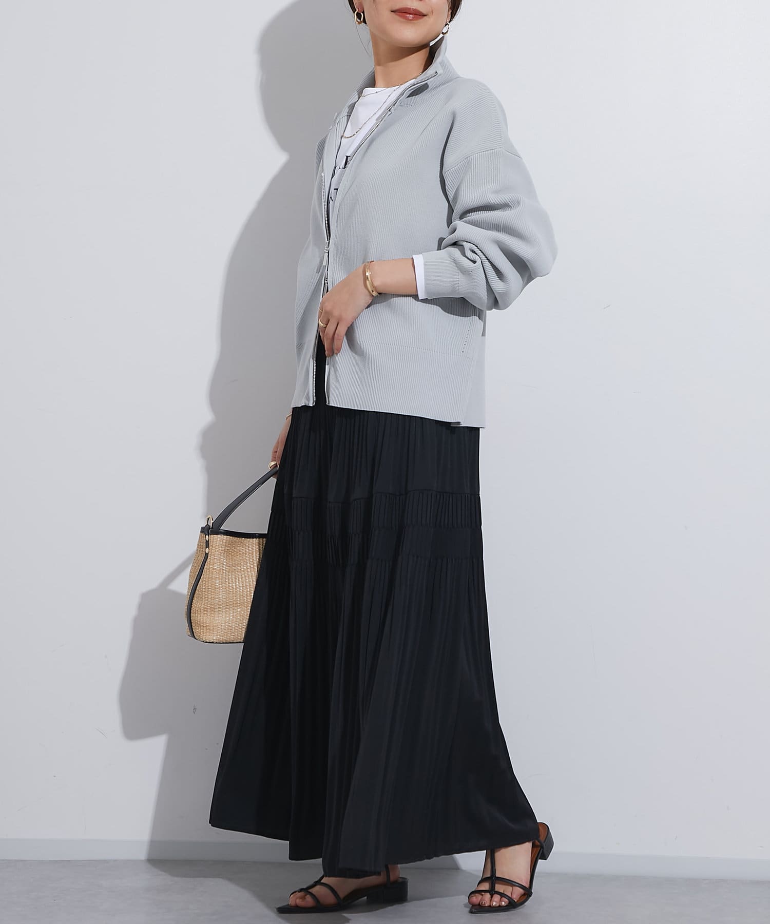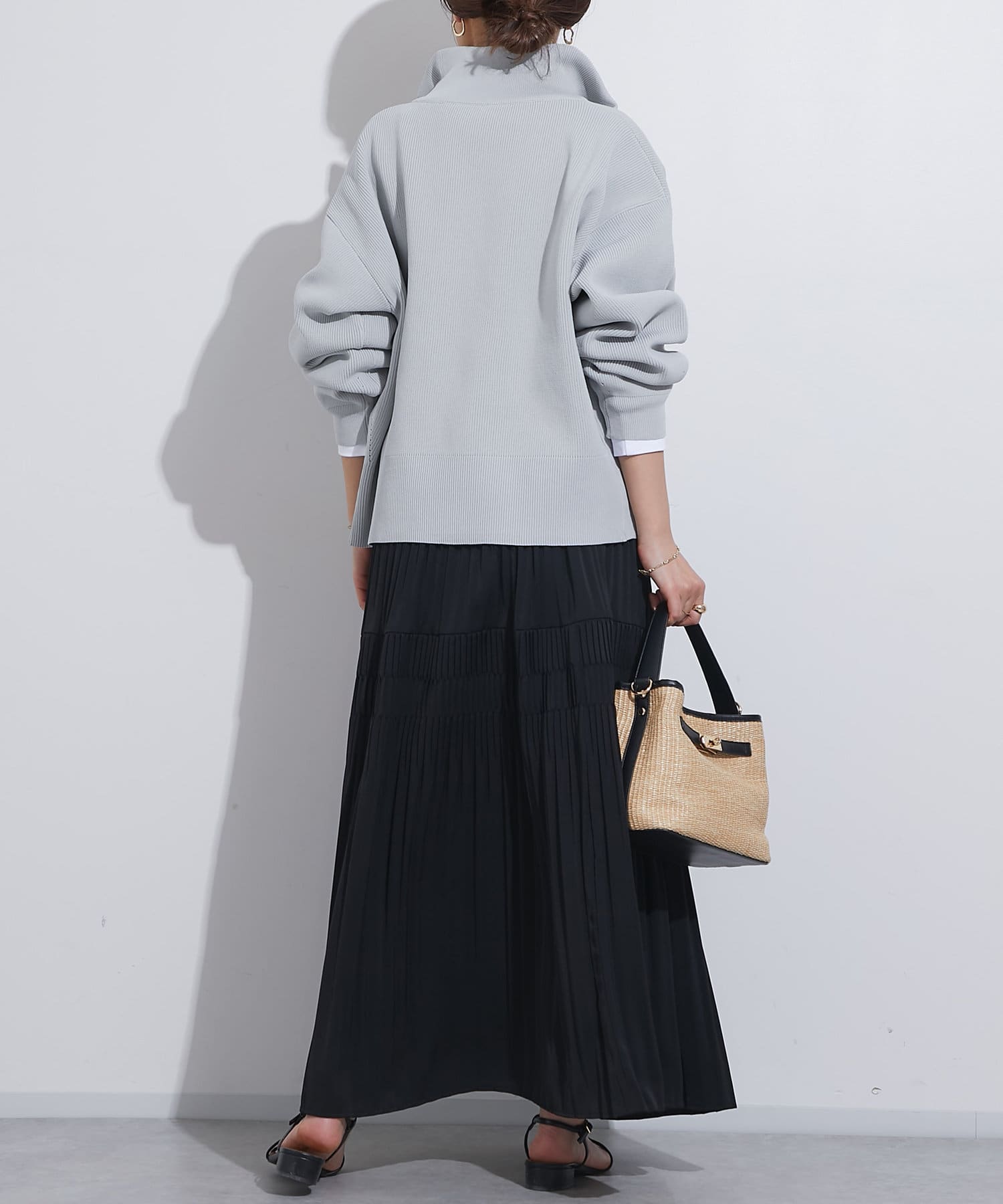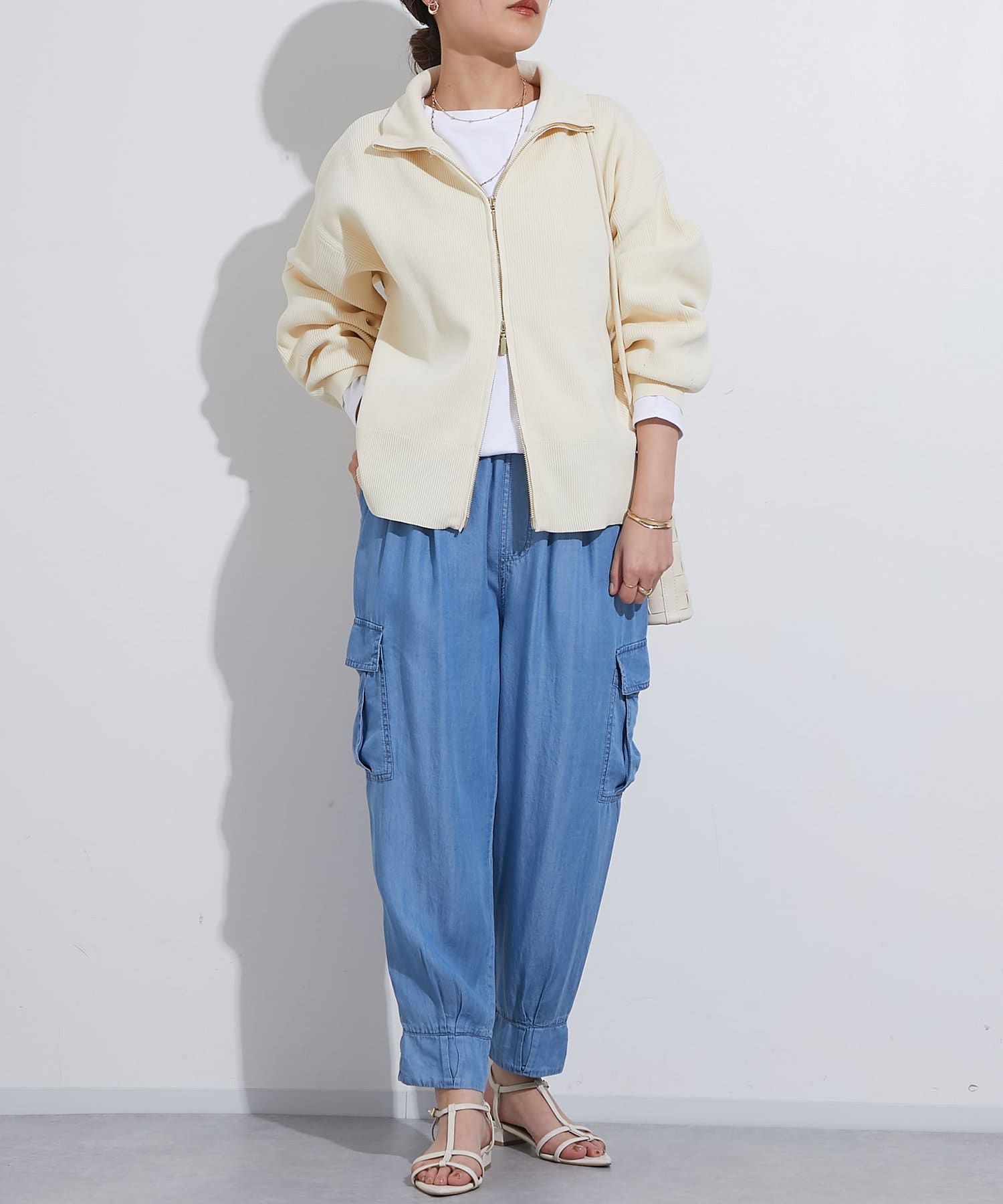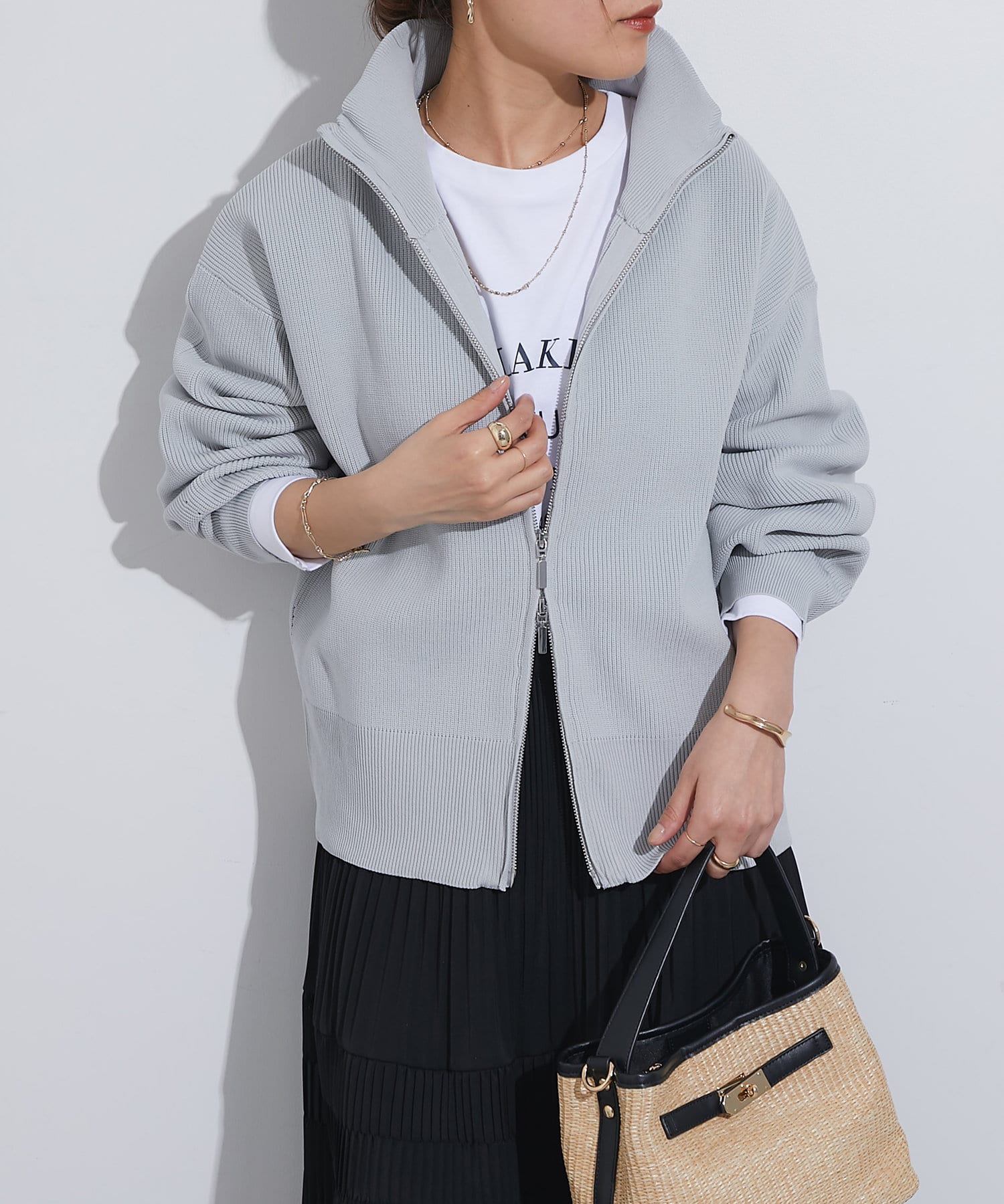 ・ハイネックとゴールドのジッパーがアクセントとなり、さりげない上品さをプラス。