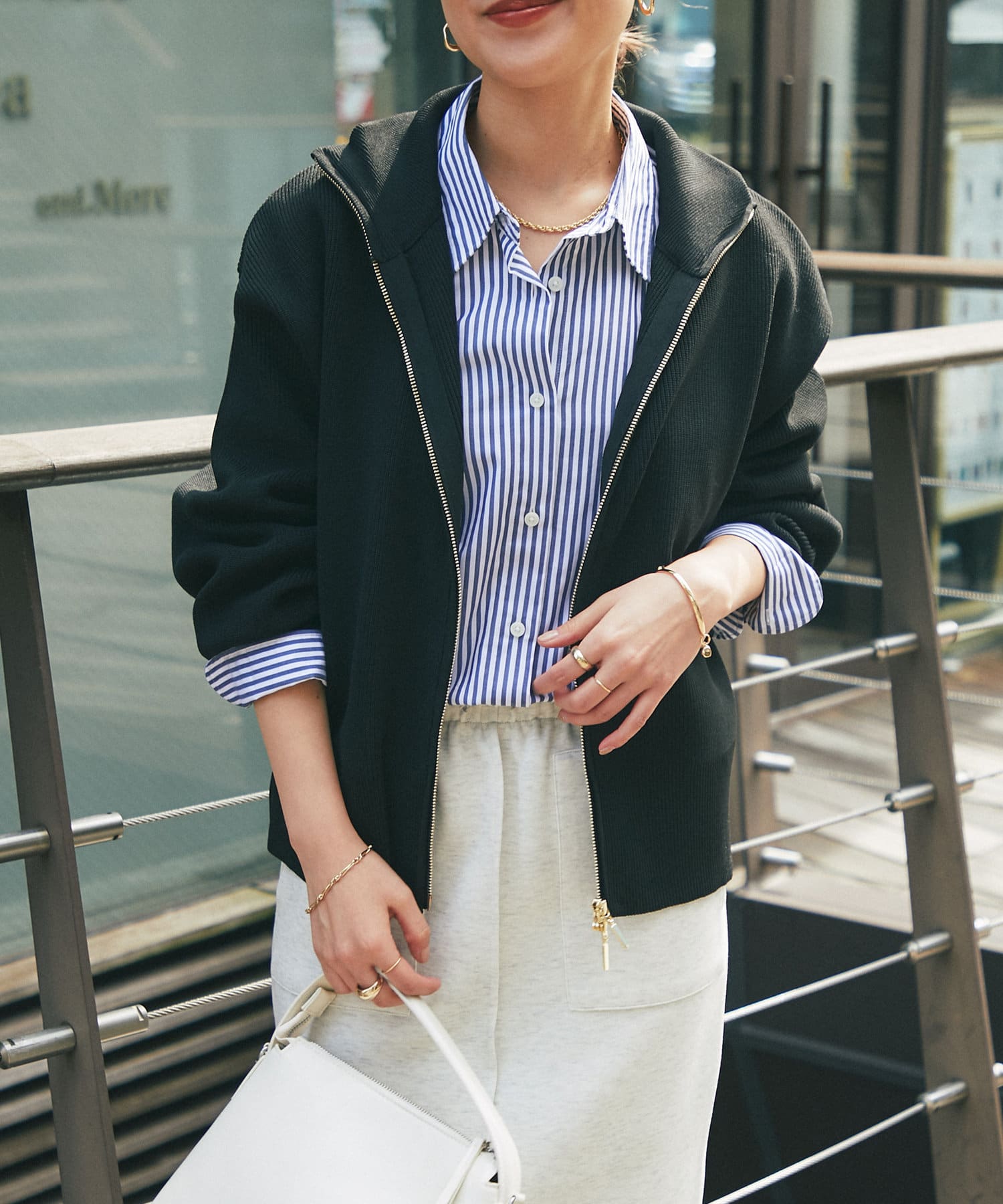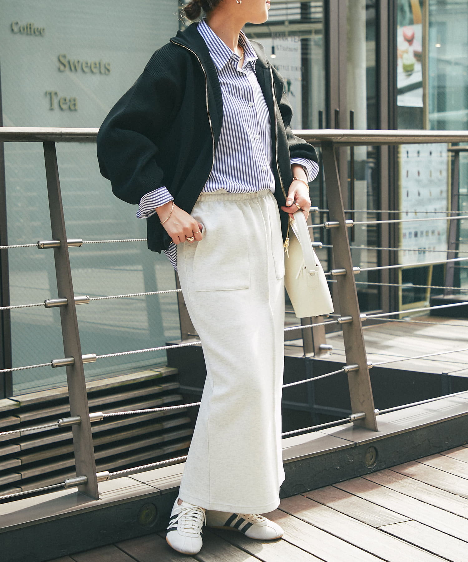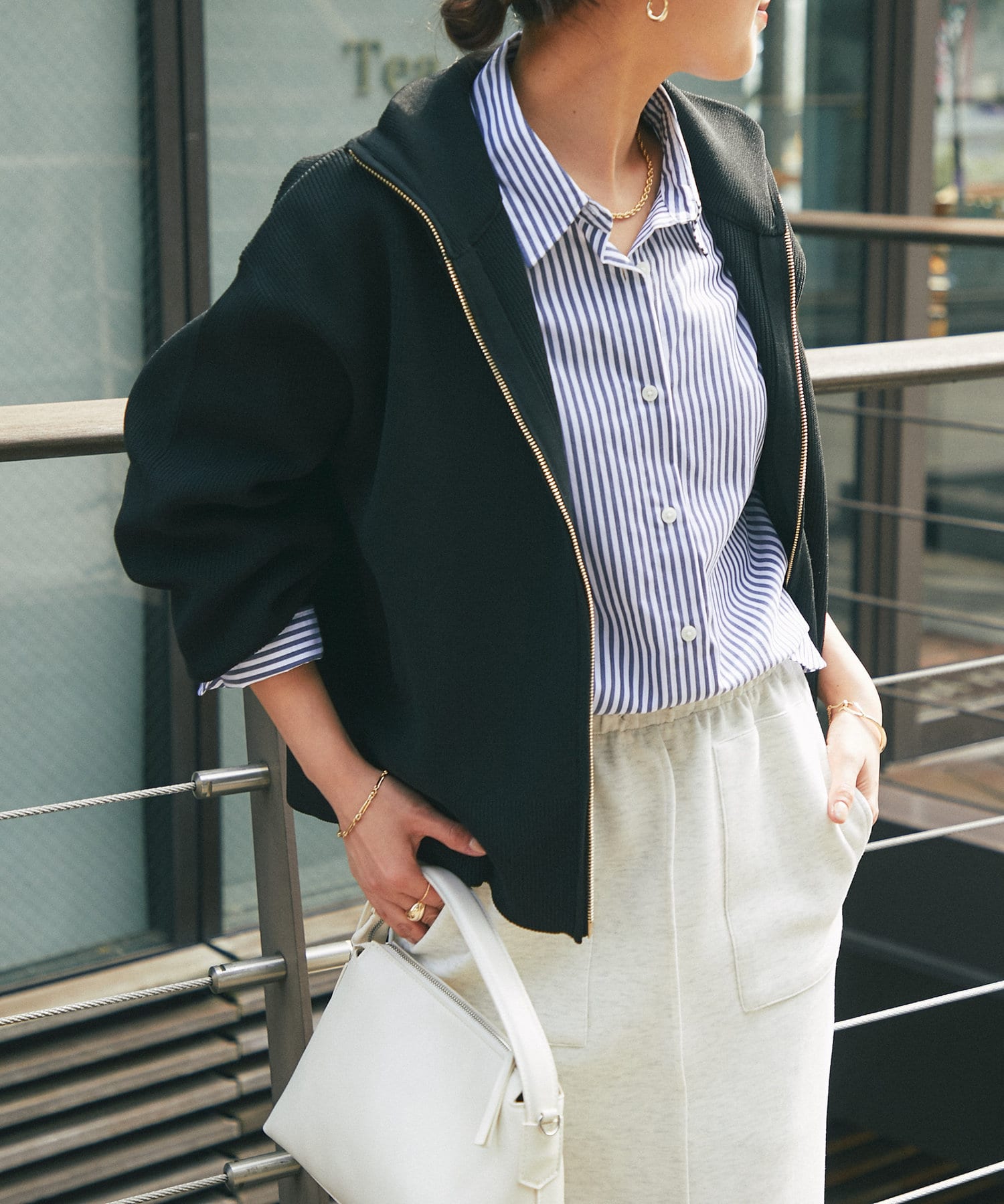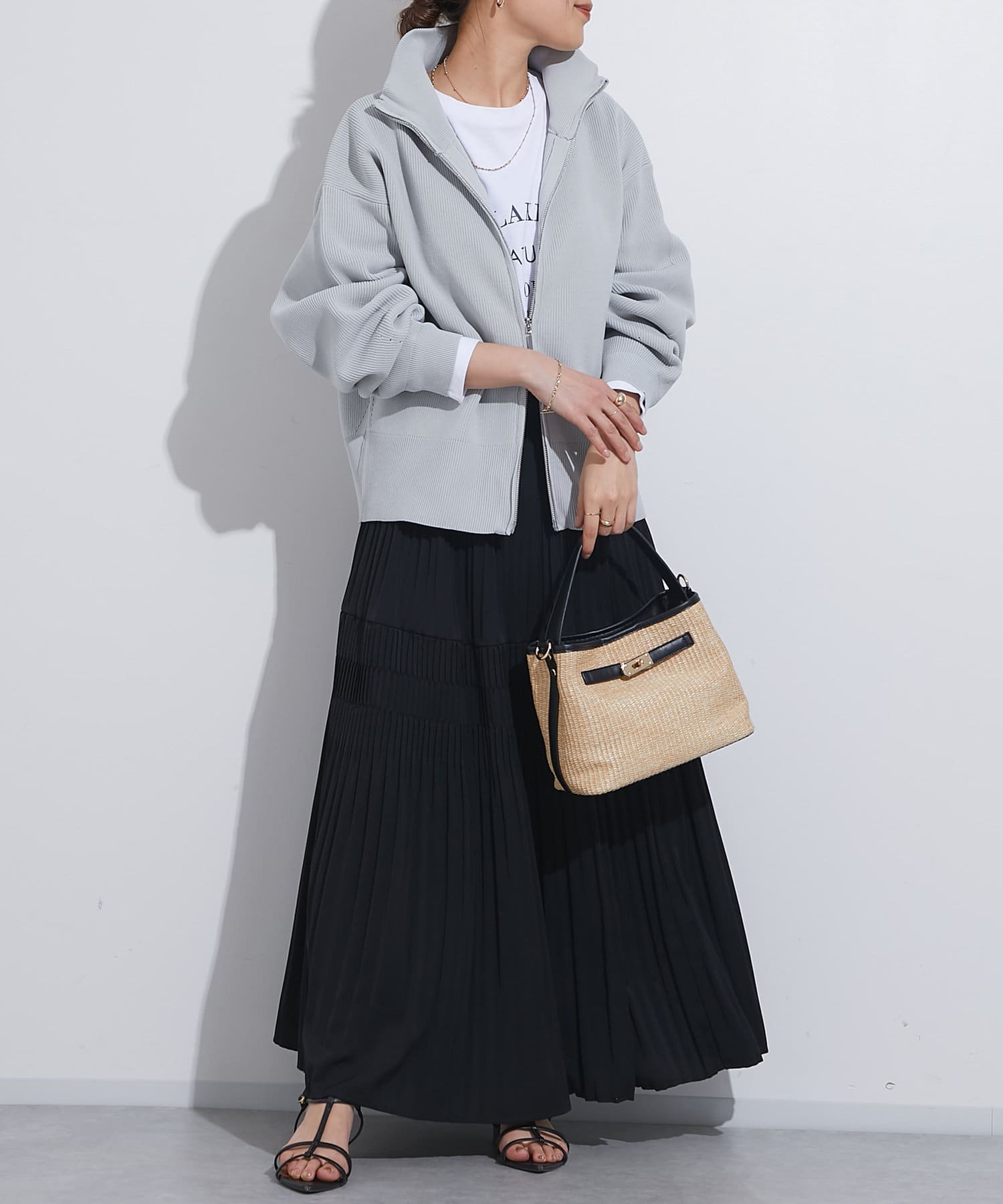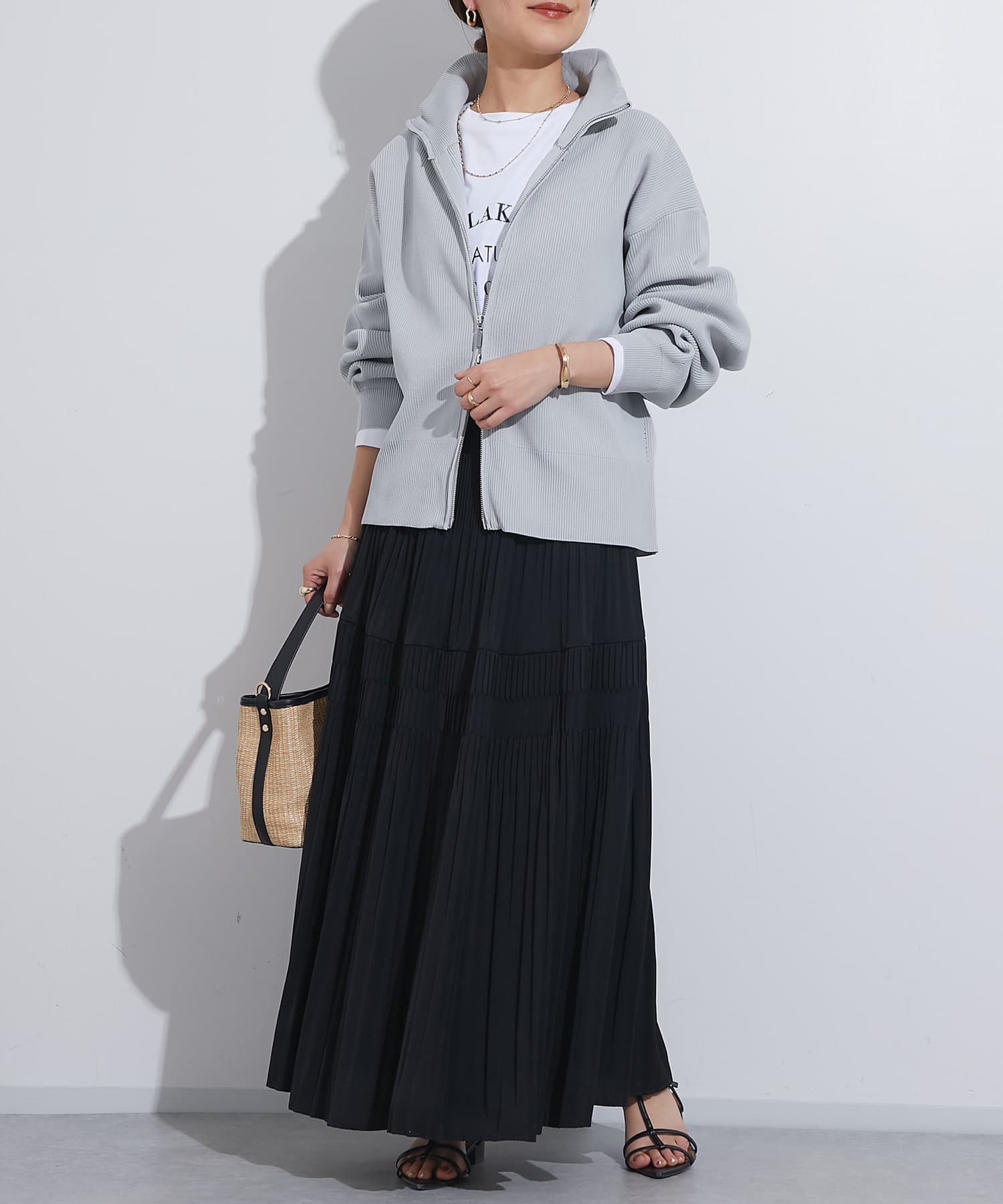 ・ハイネックとゴールドのジッパーがアクセントとなり、さりげない上品さをプラス。