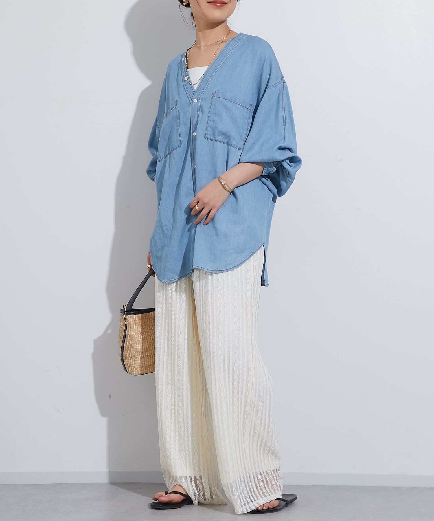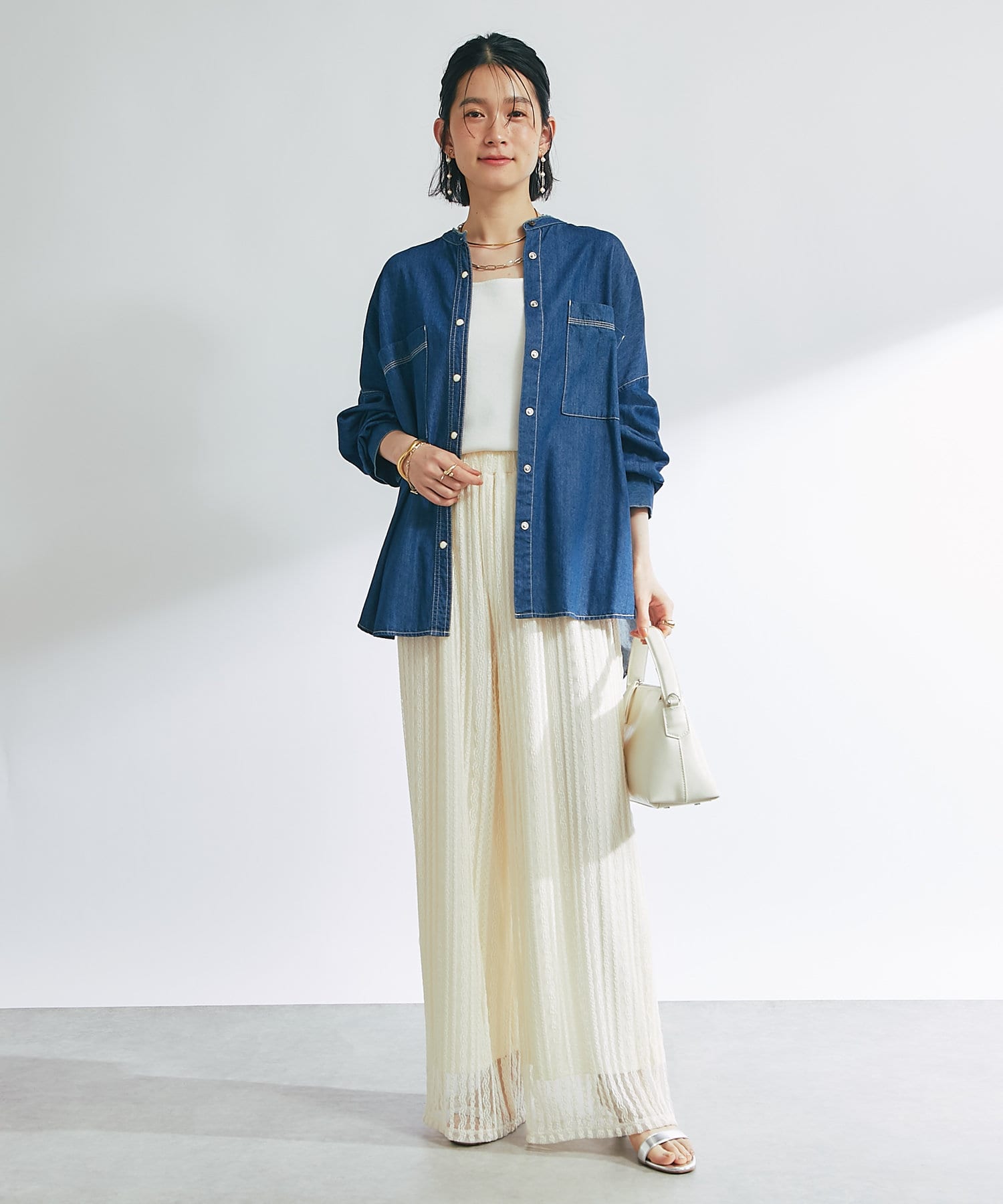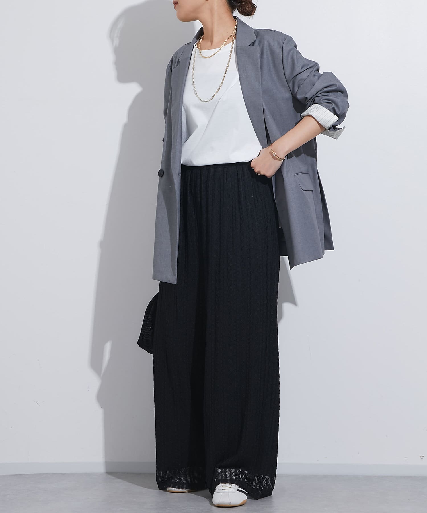 パンツのレースが華やかな印象なので、あえてトップスはシンプルにするのもおすすめ。