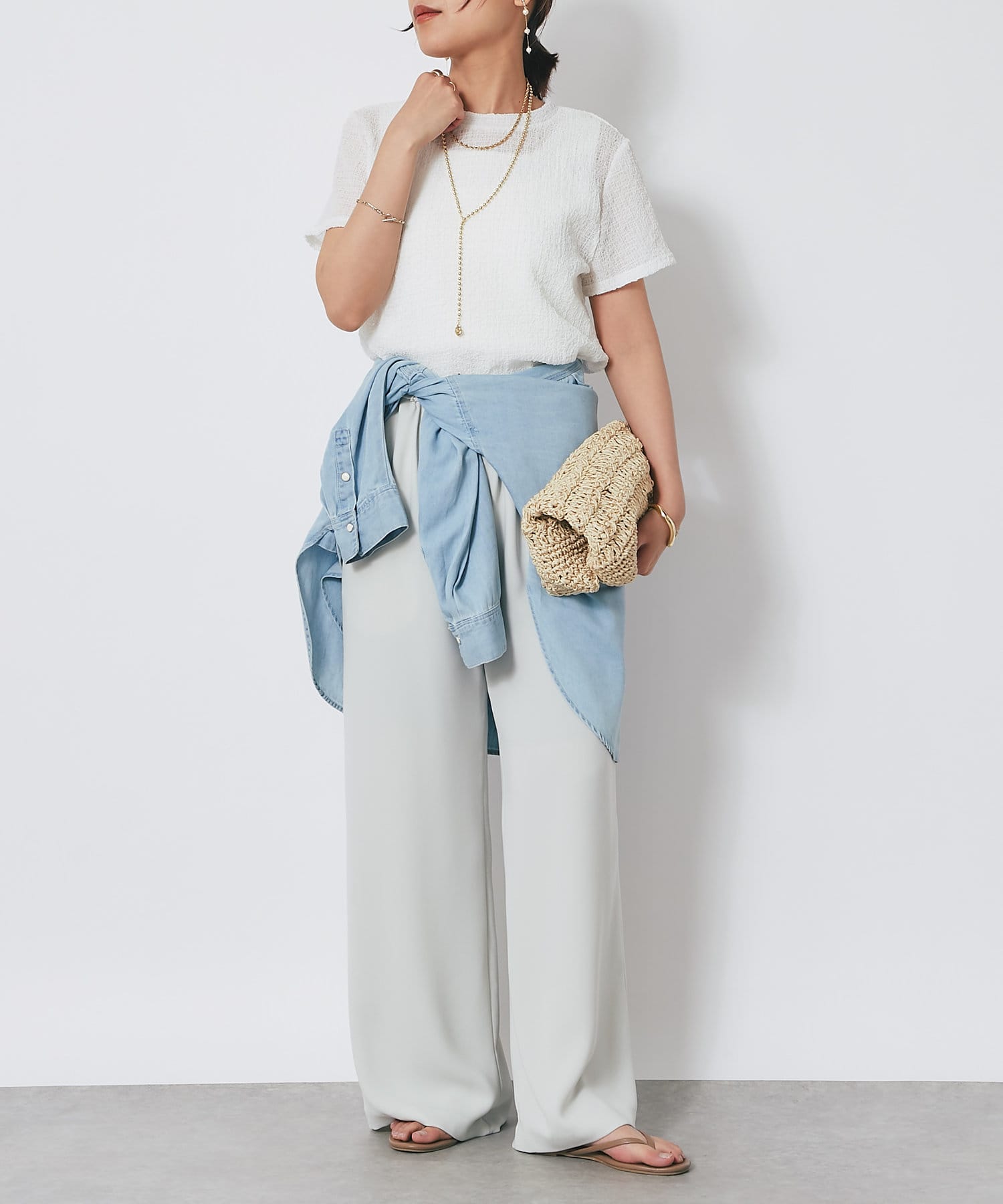 カジュアルなTシャツ1枚だけを合わせても、こなれ感を演出してくれます。