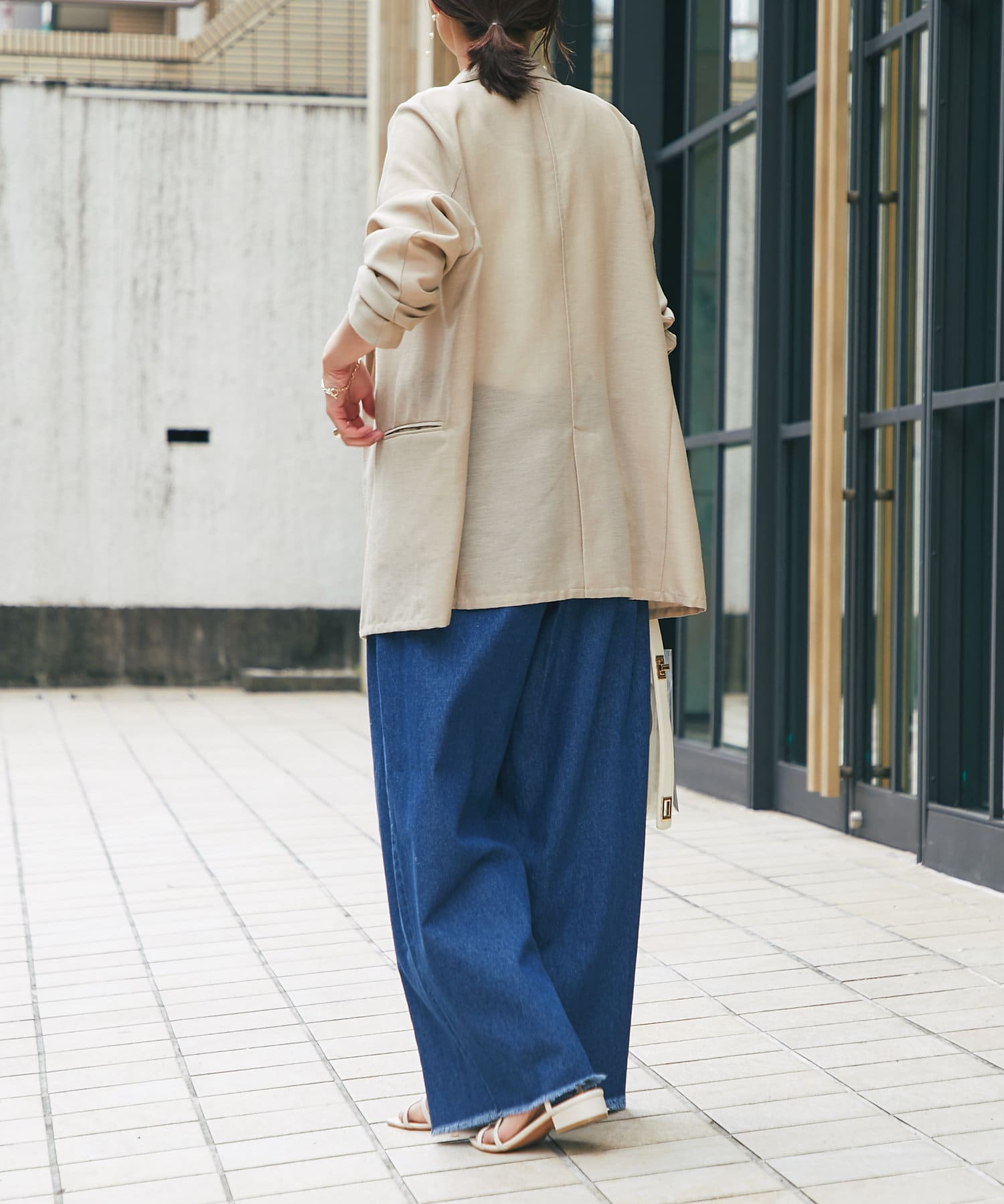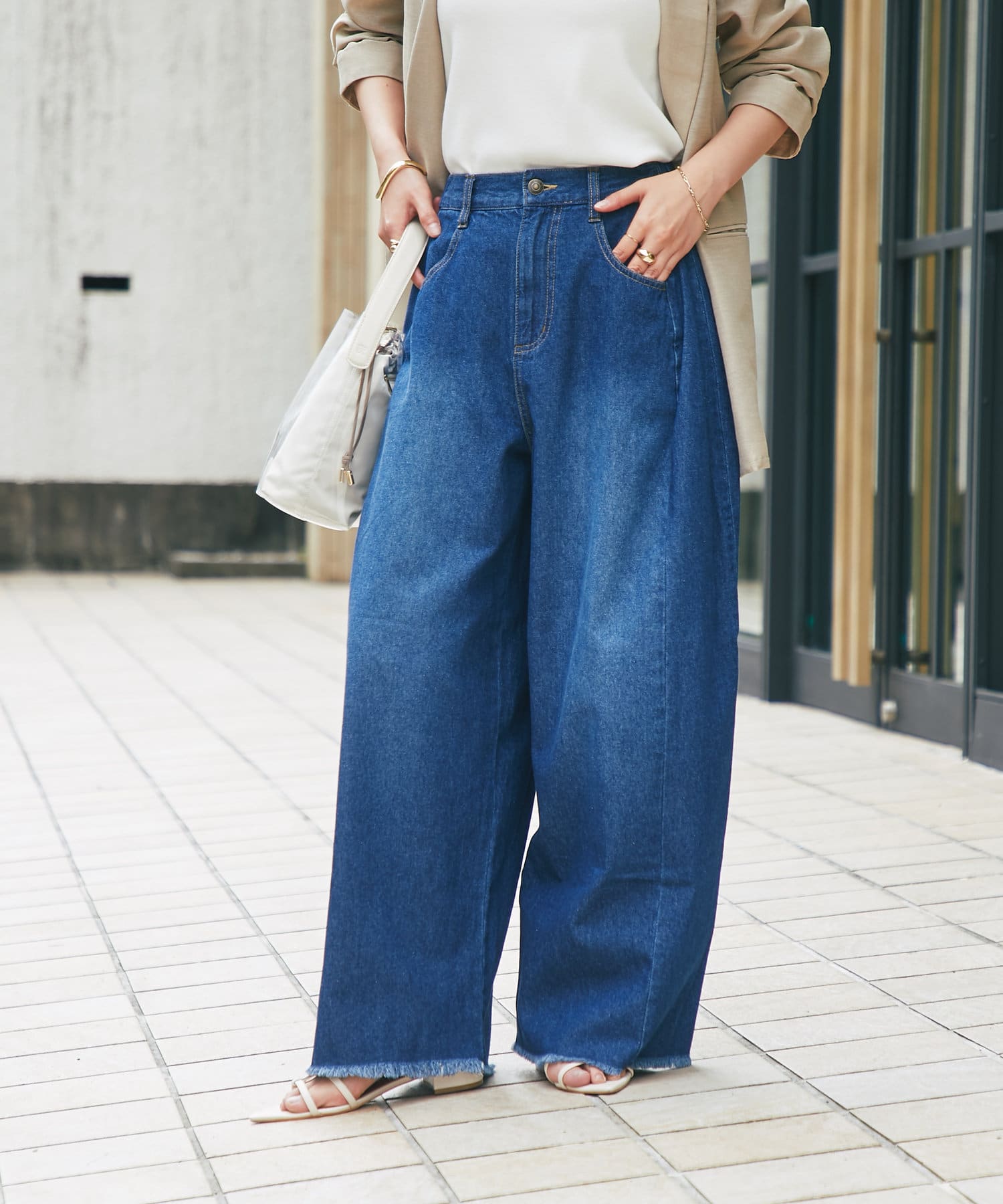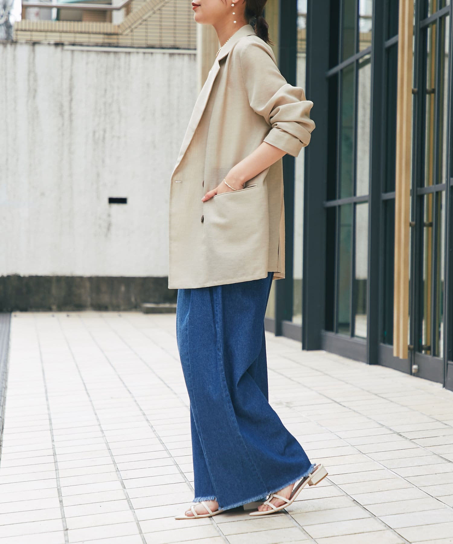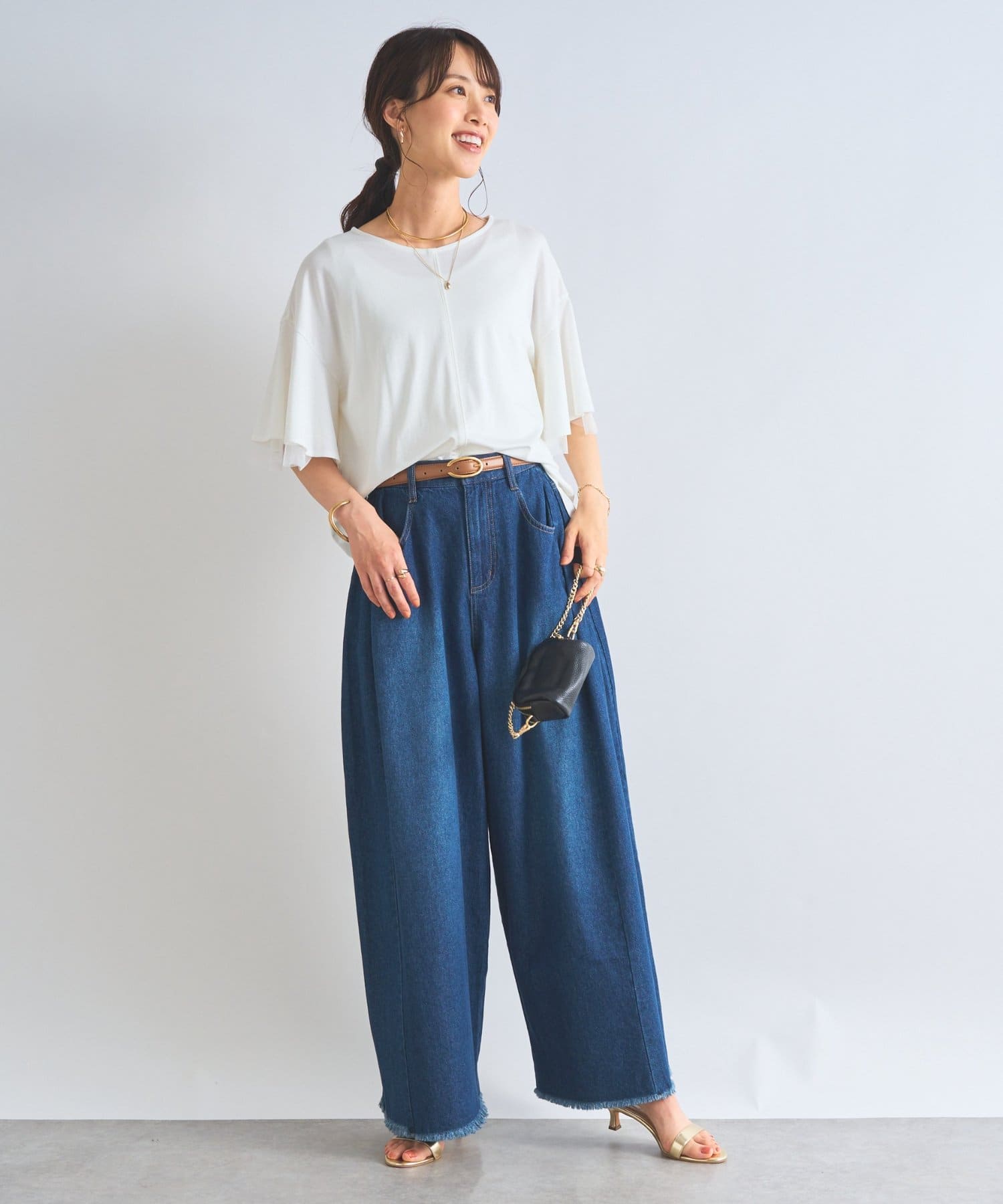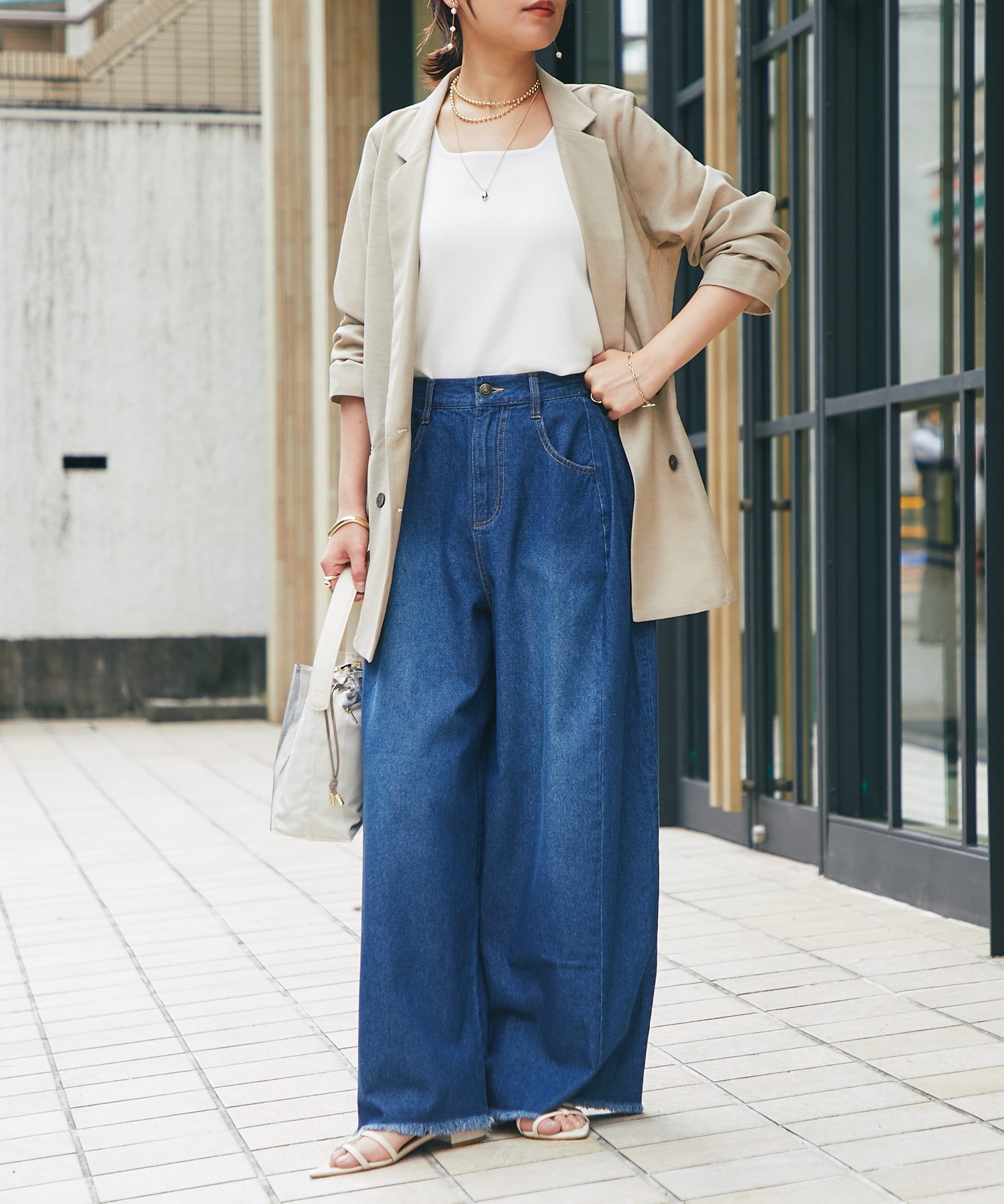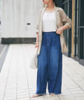 ふんわり甘めのブラウスを合わせて、ルーズなフォルムにまとめた大人の甘めカジュアルなスタイリングにも◎