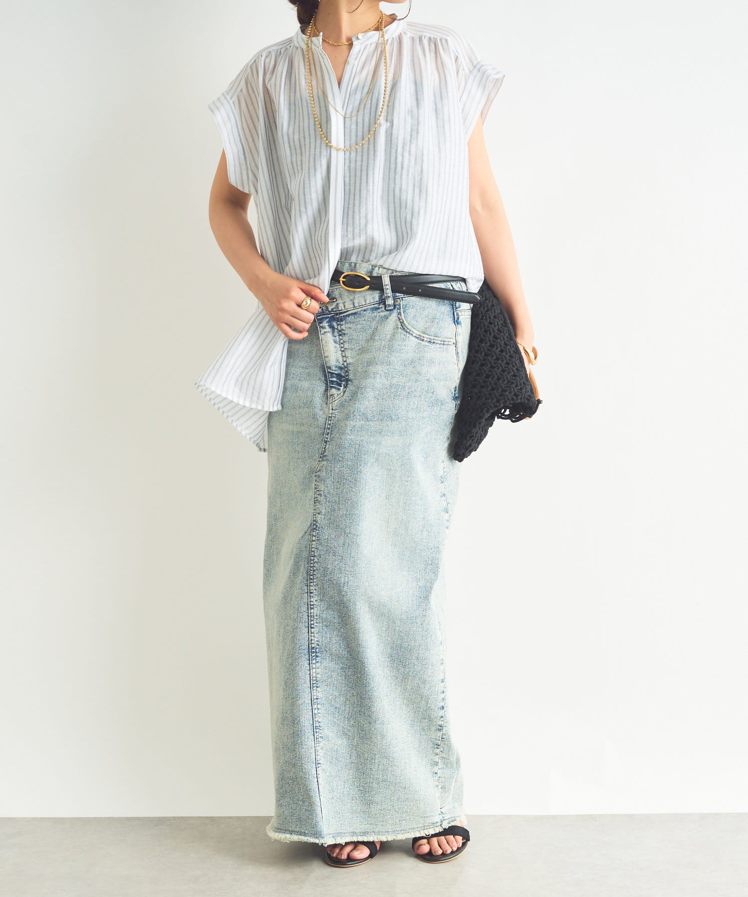ロングスカートと組み合わせると抜け感のあるシルエットになり、大人のリラックスムードを演出します。