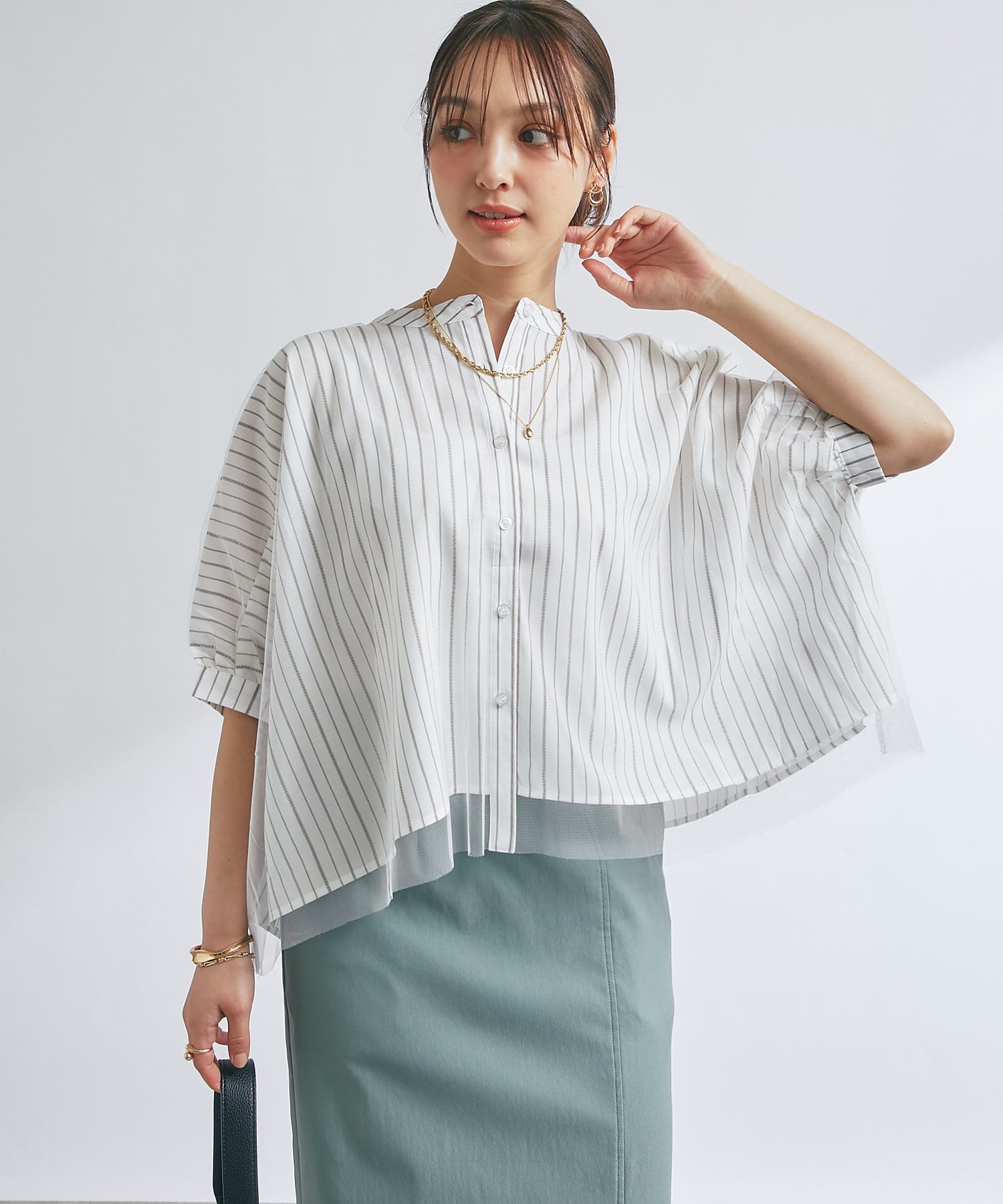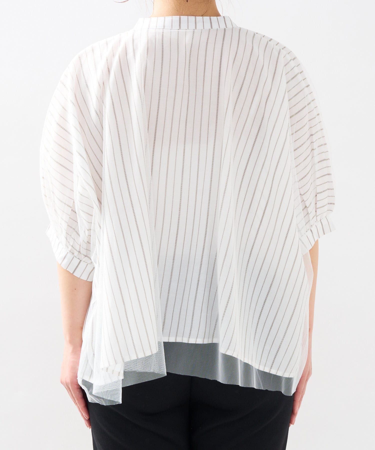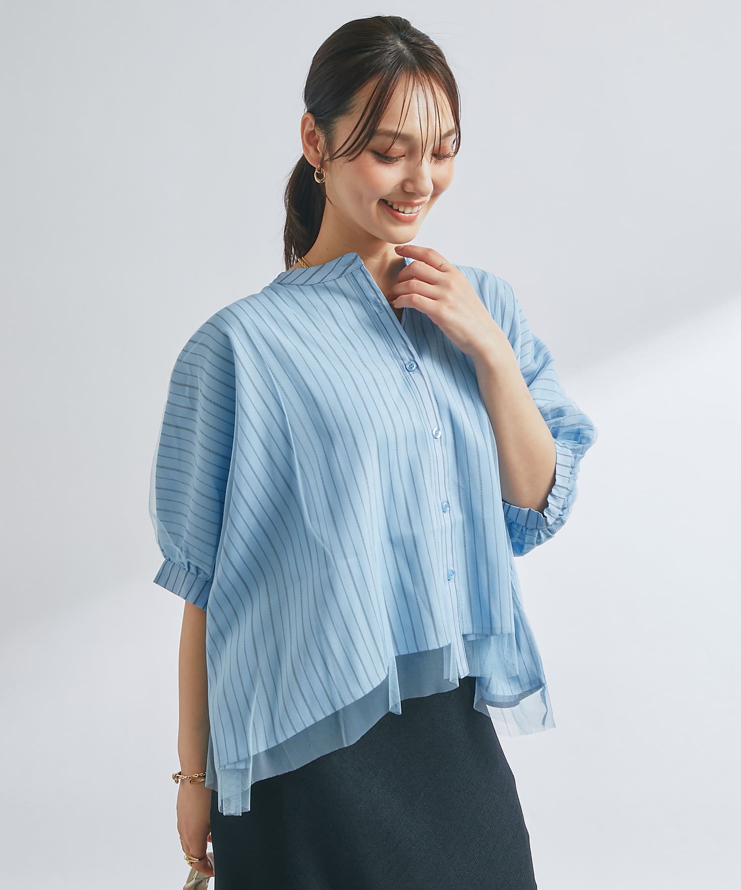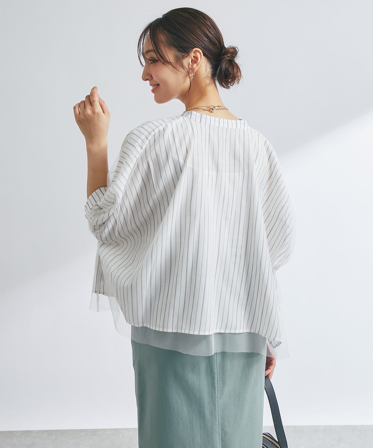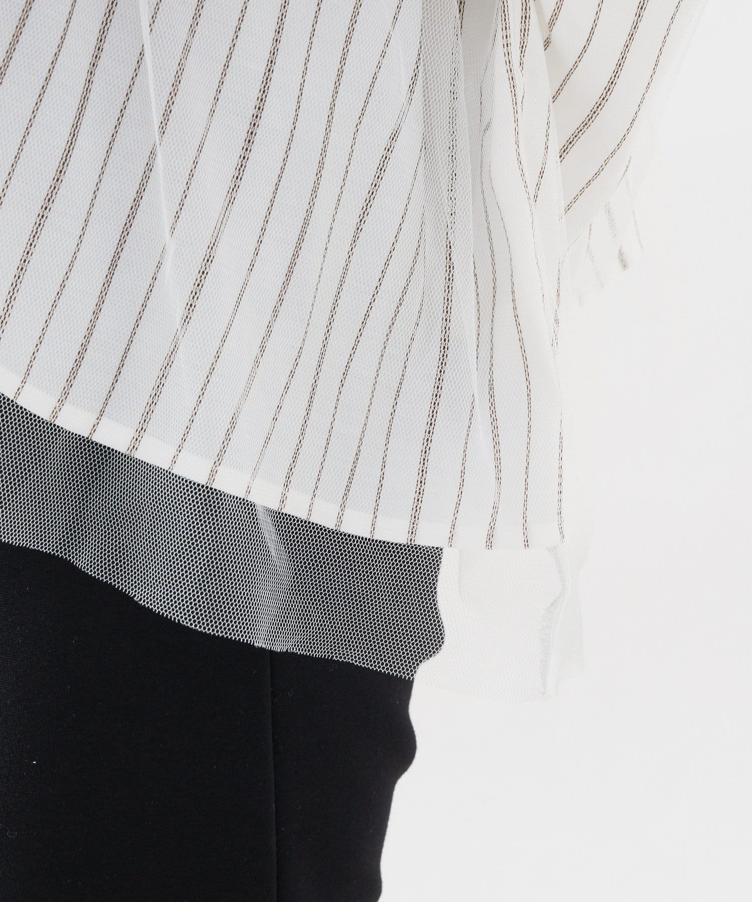 ・ストライプ柄にチュールを重ねた、軽やかなレイヤードブラウス。