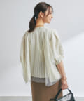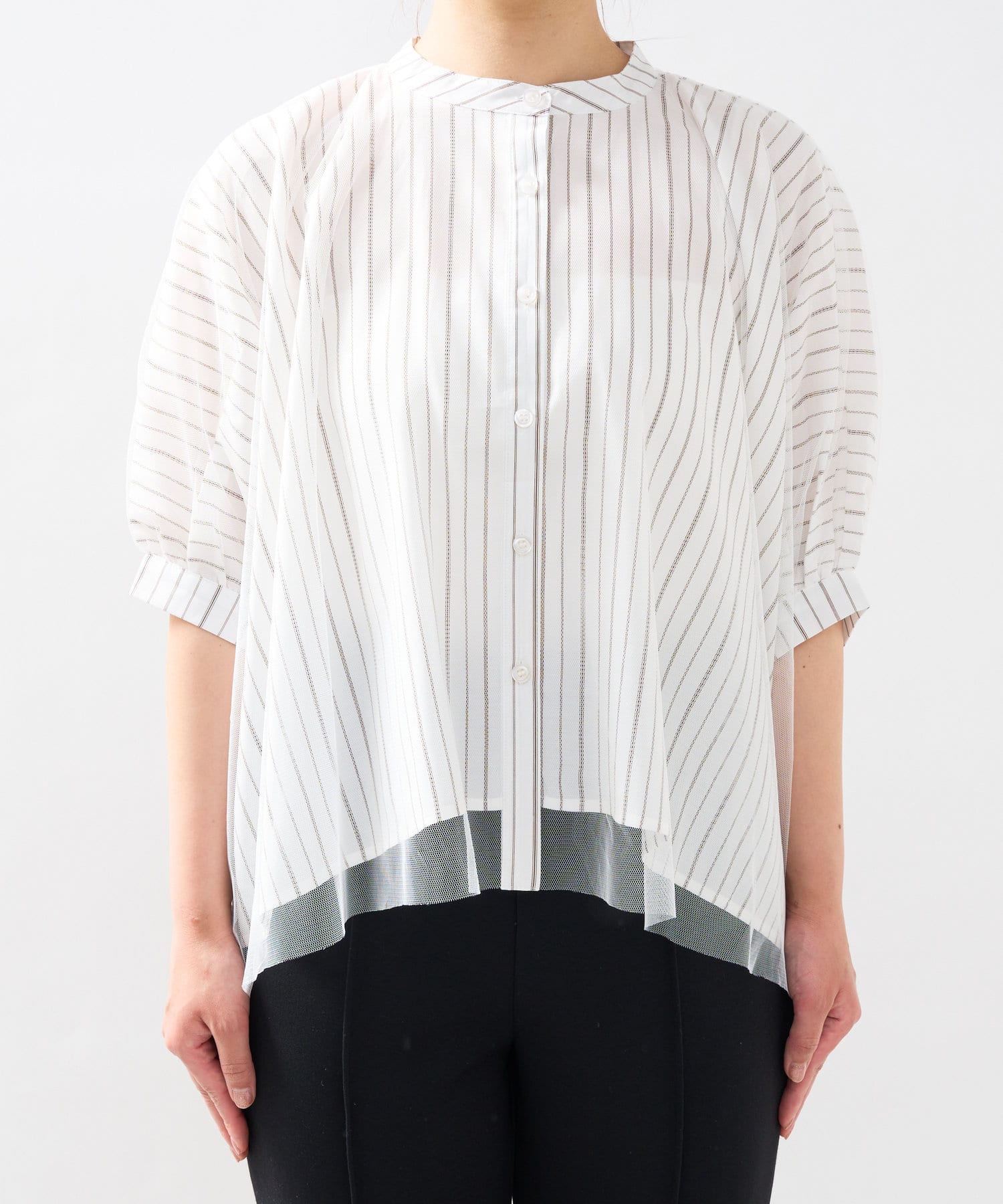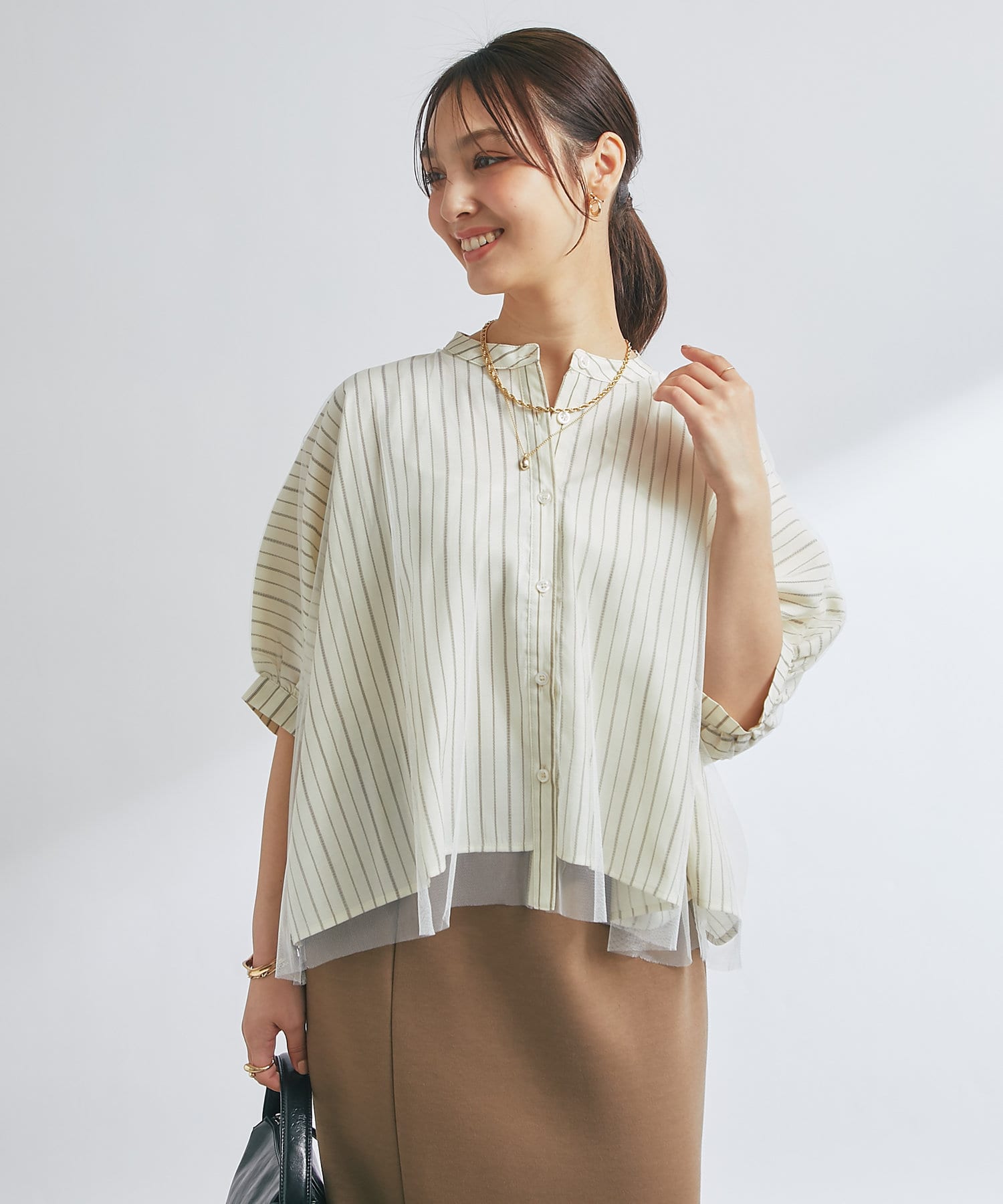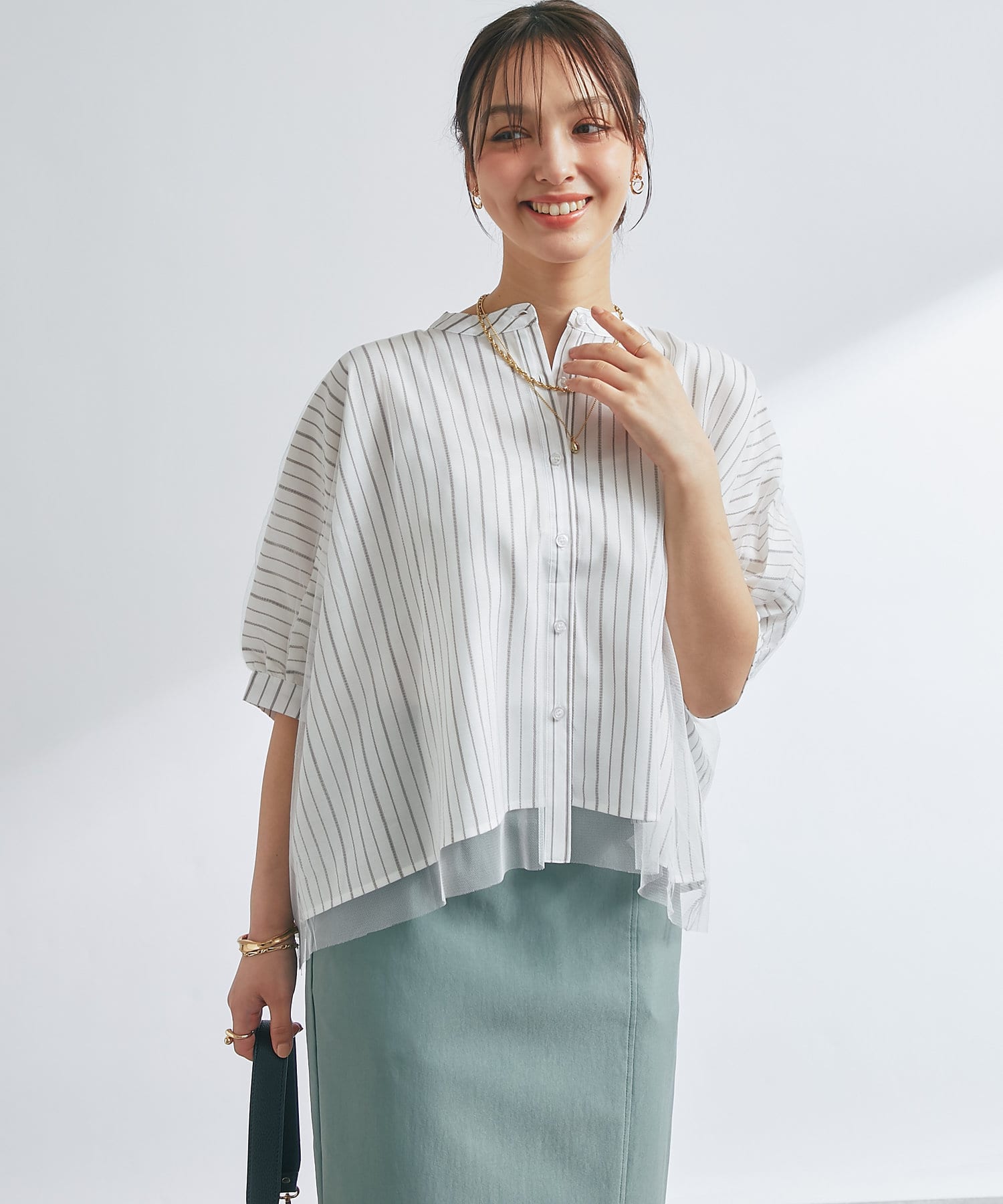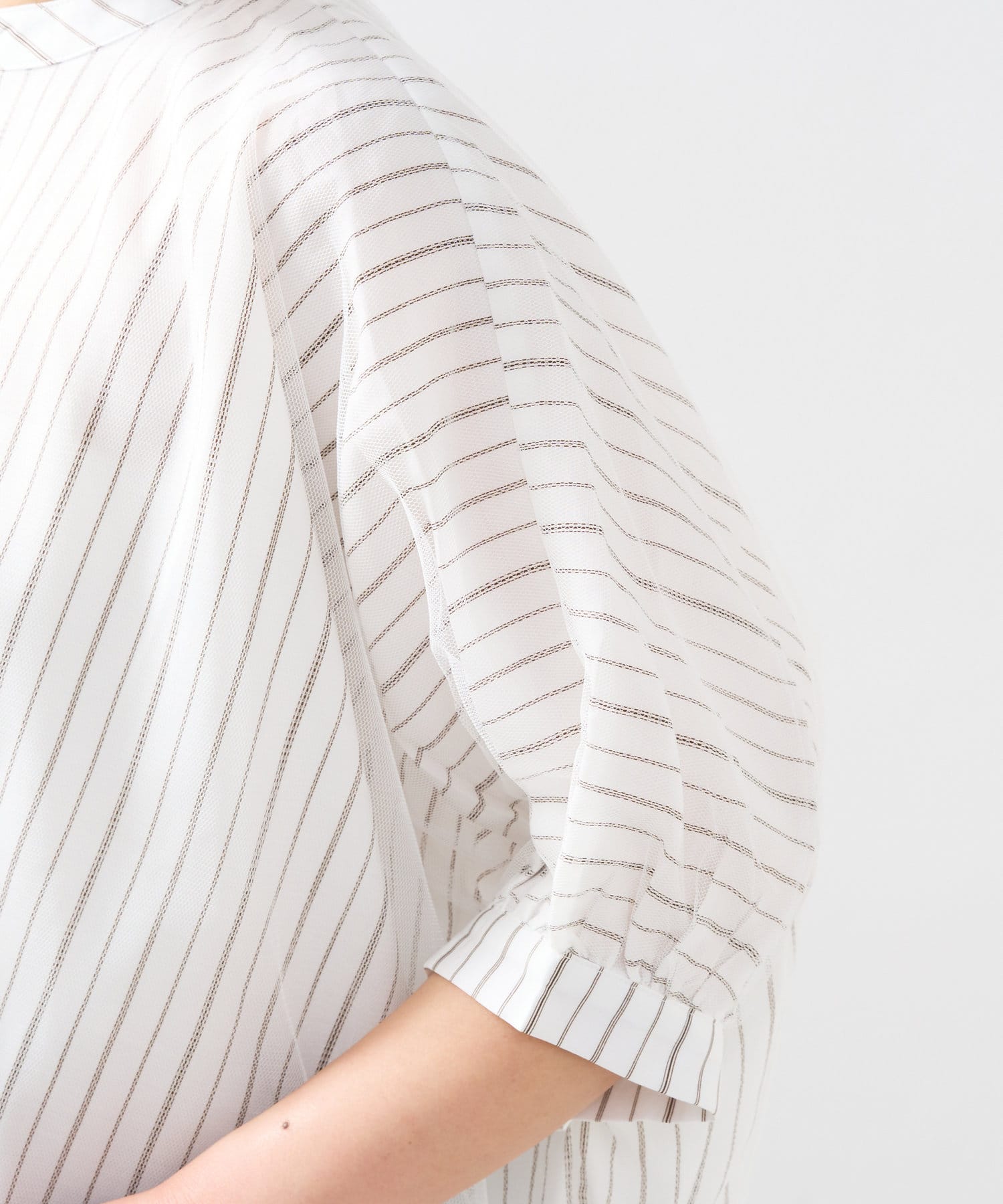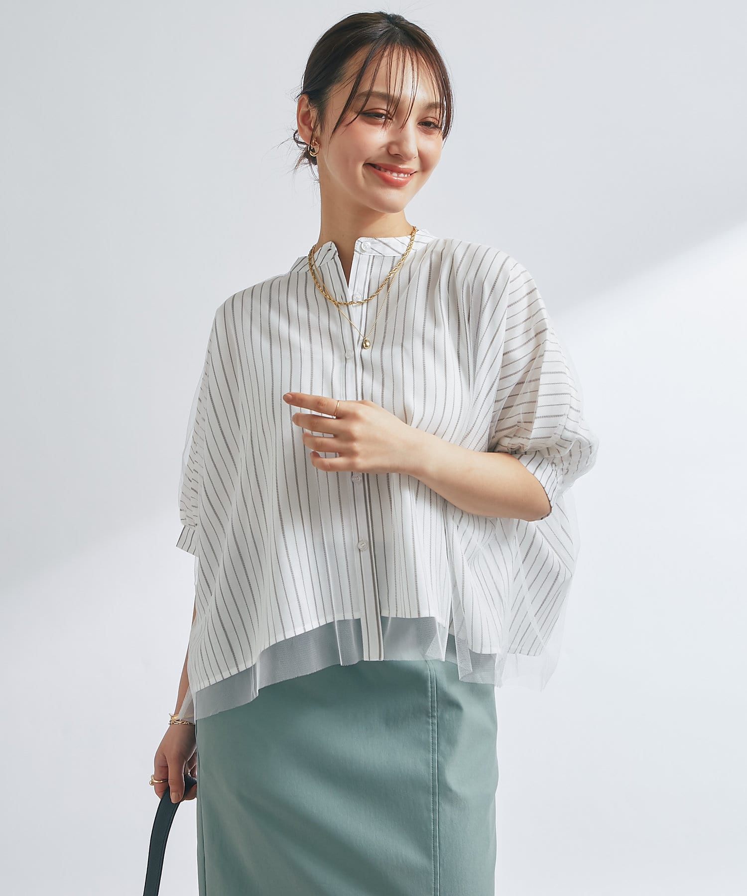 ・ストライプ柄にチュールを重ねた、軽やかなレイヤードブラウス。