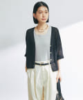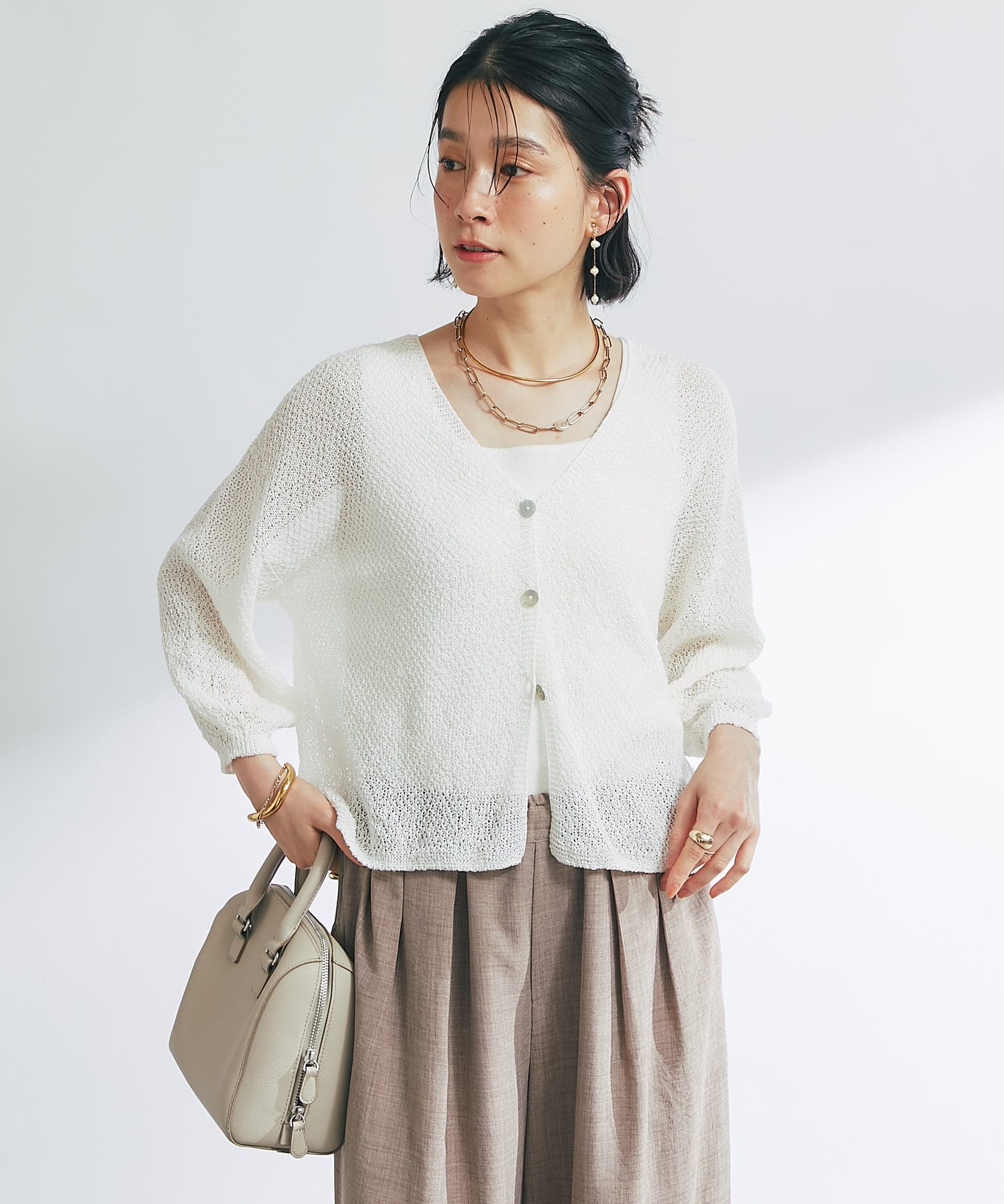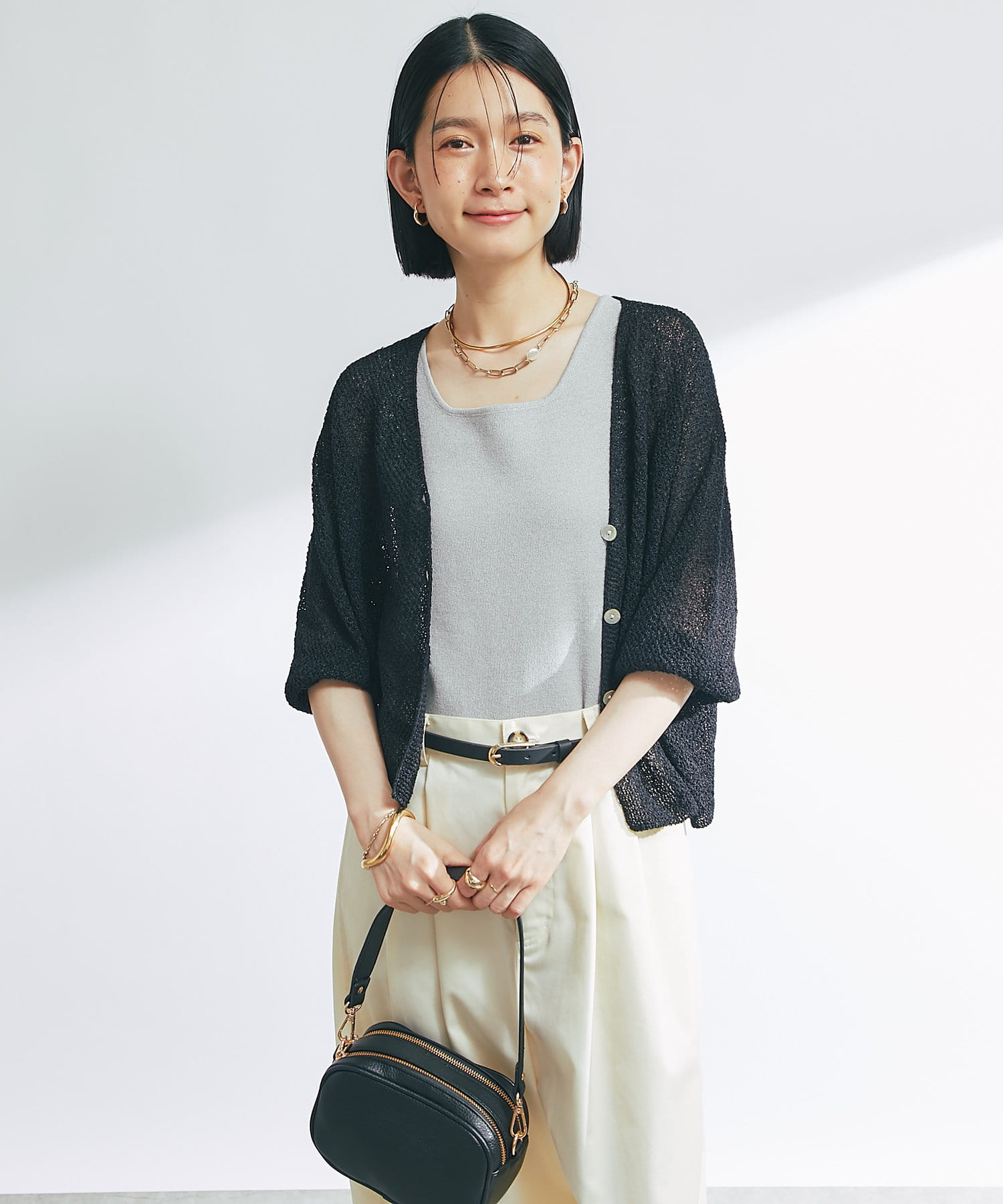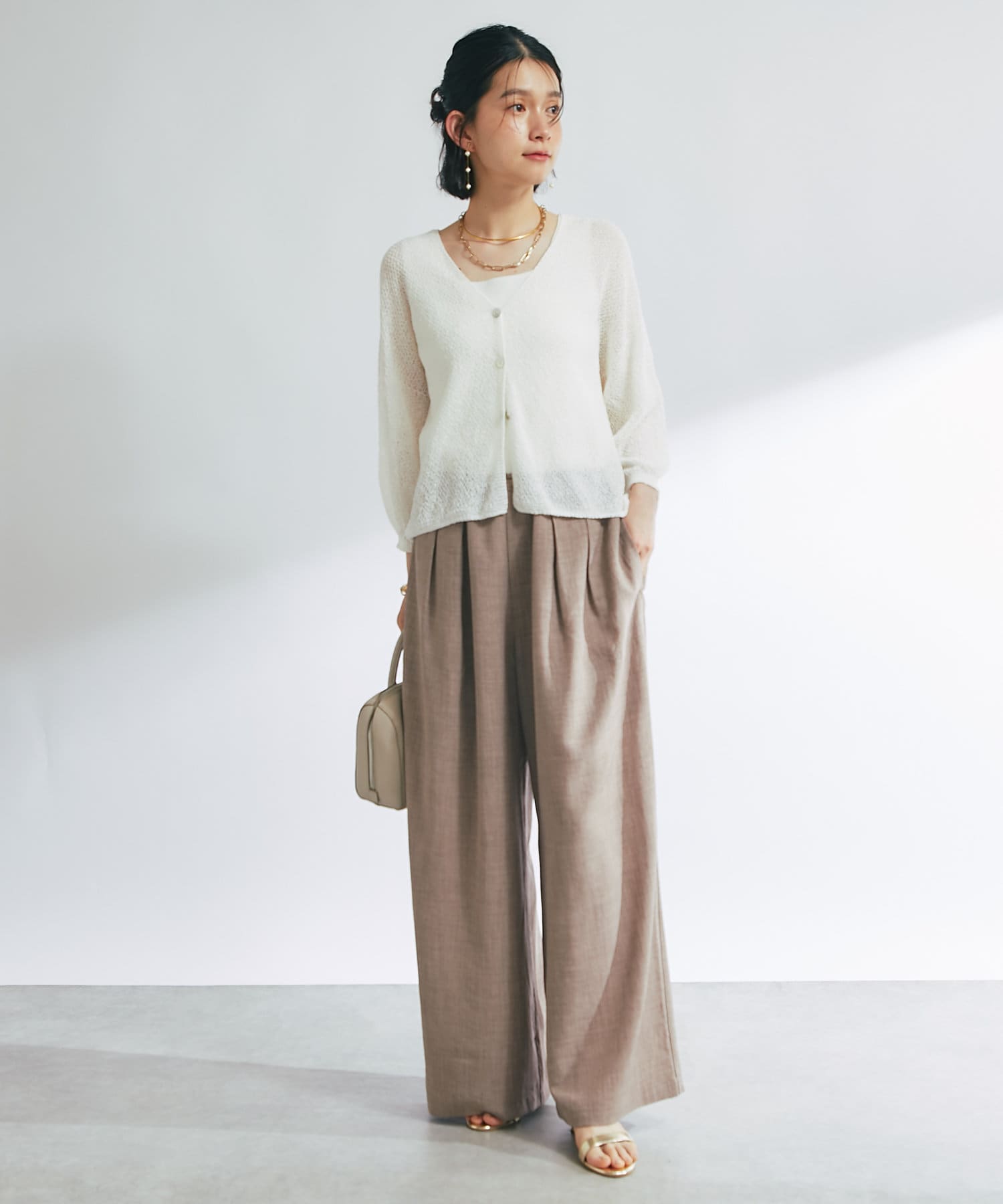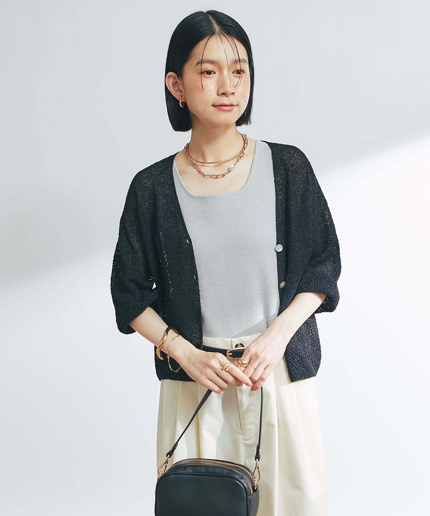 タンクトップインナーと合わせて、カーディガンの透け感をアクセントにしたスタイリングもおすすめです。